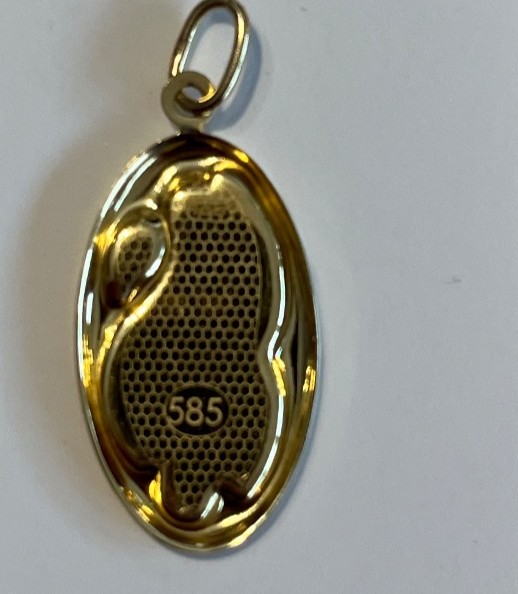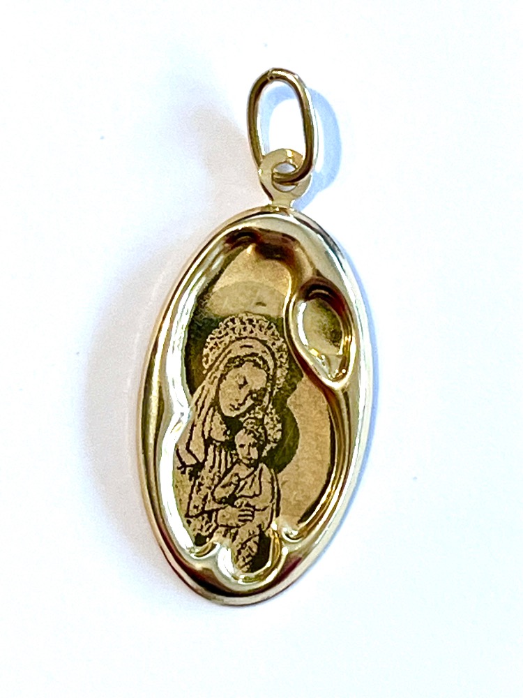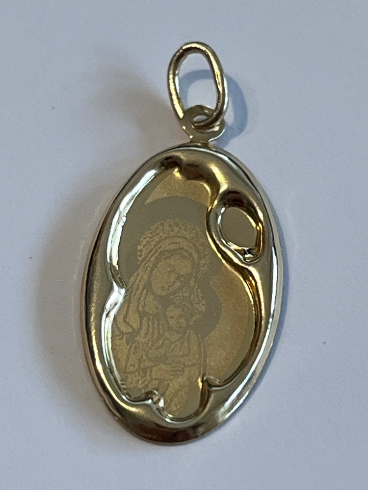 Zlatý přívěšek ze žlutého 14 karátového zlata = AU 585/1000, s motivem madony, váha přívěšku 1,40 gramů. Velikost na výšku, včetně ouška 3,1 cm.