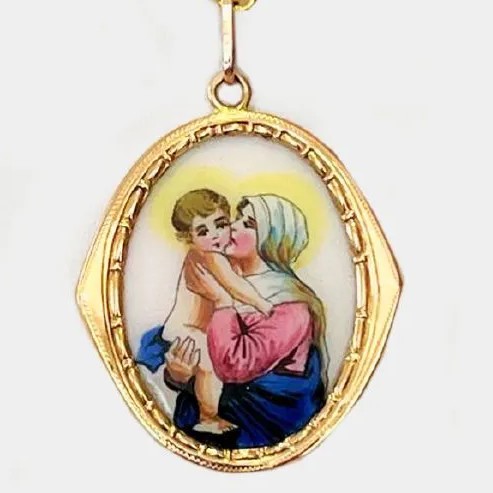Krásný starožitný zlatý přívěšek Panny Marie s Jezulátkem z žluto/růžového odstínu 14 karátového zlata, velmi hezky zdobený rámeček. AU 585/1000 váha přívěšku brutto 4,01 gramů, výška přívěšku, včetně ouška cca 3,5 cm, šířka přívěšku cca 2,5 cm.