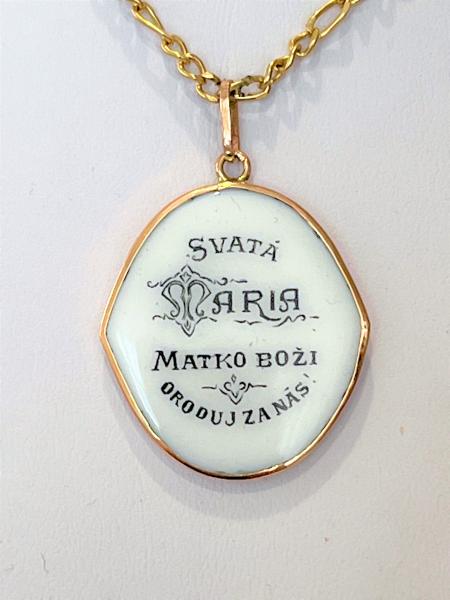 Krásný starožitný zlatý přívěšek Panny Marie s Jezulátkem z růžového 14 karátového zlata, velmi hezky zdobený rámeček. AU 585/000 váha přívěšku brutto 4,01 gramů, výška přívěšku, včetně ouška cca 3,5 cm, šířka přívěšku cca 2,5 cm.