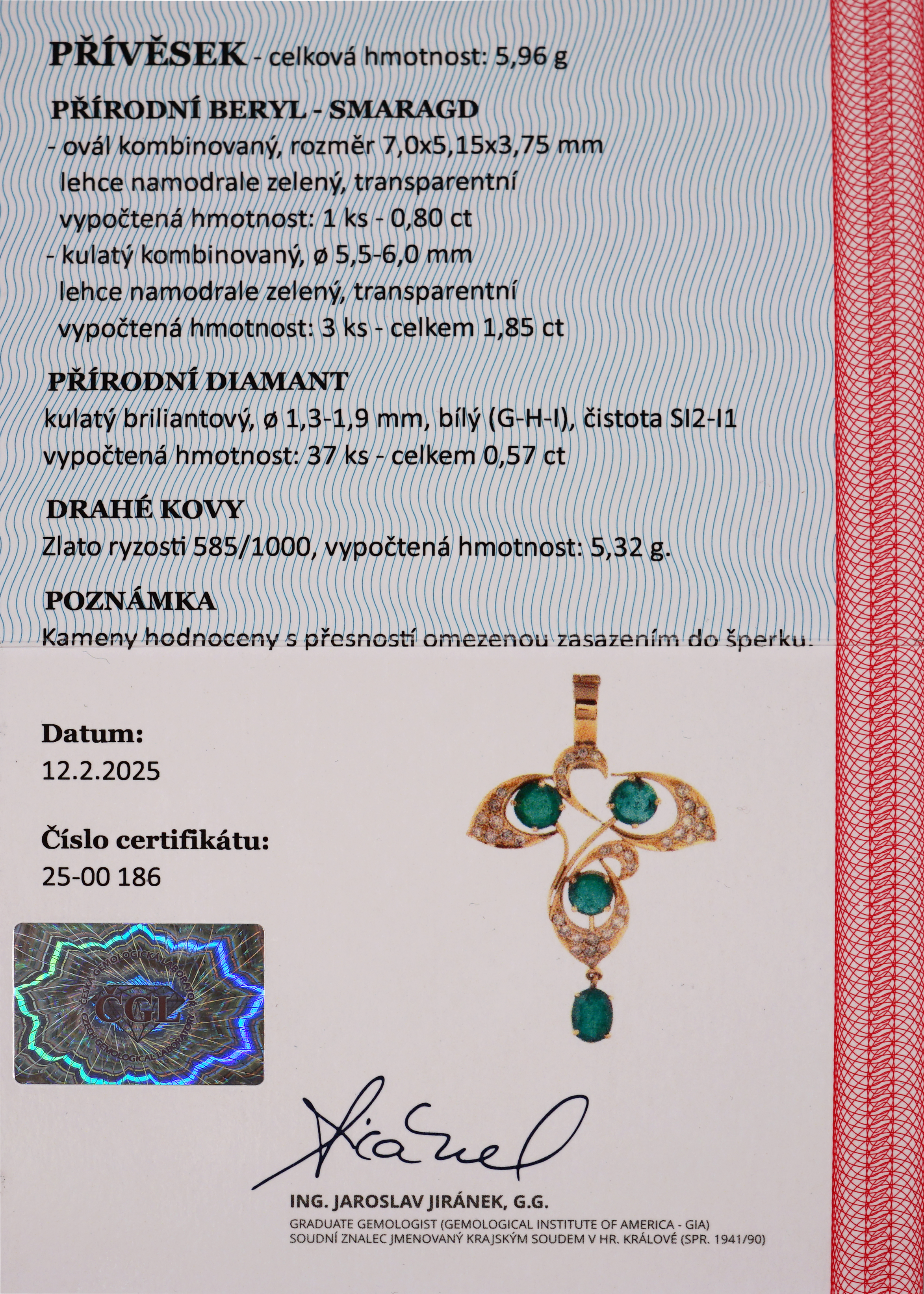 • 1 ks oválného přírodního smaragdu, celkem 0,80 ct, rozměr 7,0 × 5,15 × 3,75 mm,
