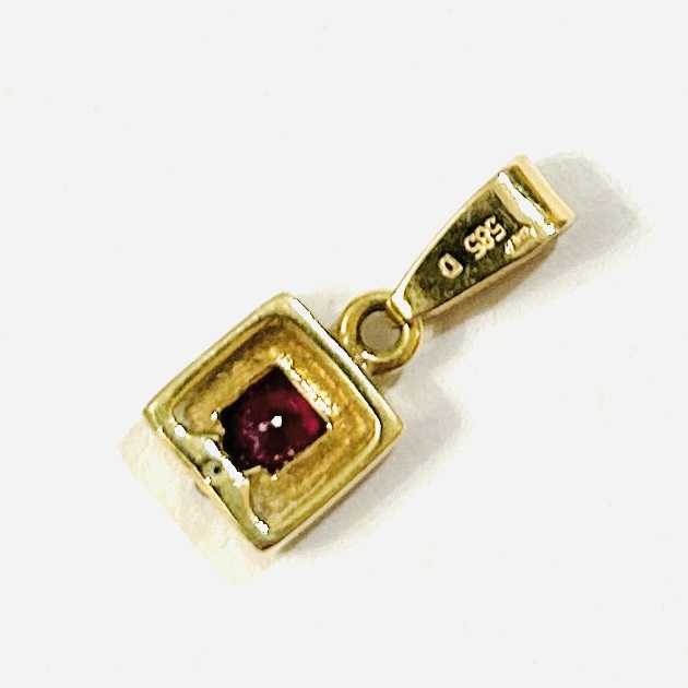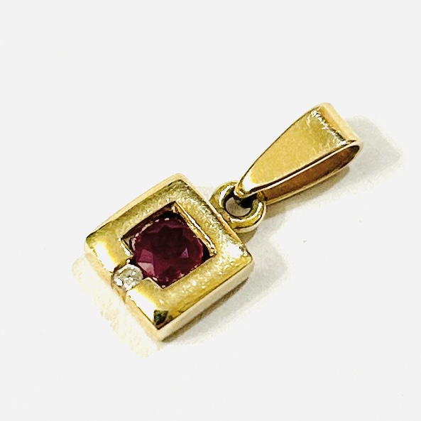 Decentní, moderně pojatý přívěšek ve tvaru čtverce, uprostřed osazeno přírodním rubínem kulatého brusu a decentně doplněno přírodním diamantem kulatého briliantového brusu o váze 0,01 ct. Západoevropská zlatnická práce, patrně z počátku 21. století.
