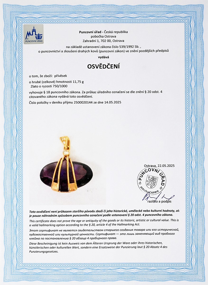 Osvědčení Puncovního úřadu České republiky