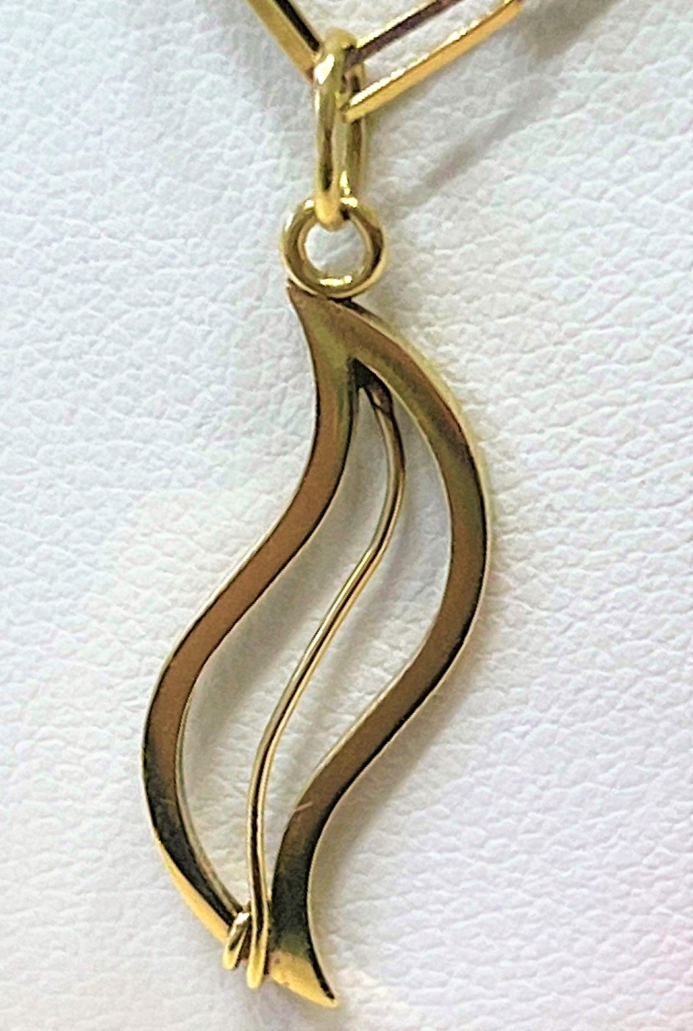 Ručně vyráběný přívěšek ze žlutého 14 karátového zlata AU 585/1000 s originálním řetízkem ze 14 karátového žlutého zlata AU 585/1000. Ručně vyrobený řetízek je složen z jednotlivých větších článků, tak aby ladil i s ručně vyrobeným přívěškem. Váha šperku celkem netto 4,99 gramů. Ideální délka náhrdelníku 52 cm.