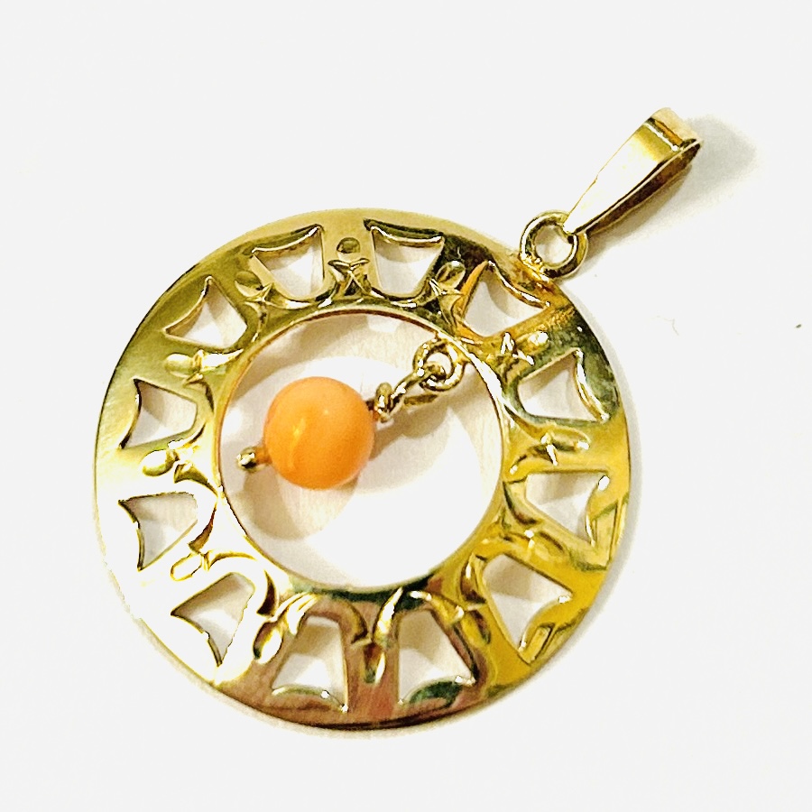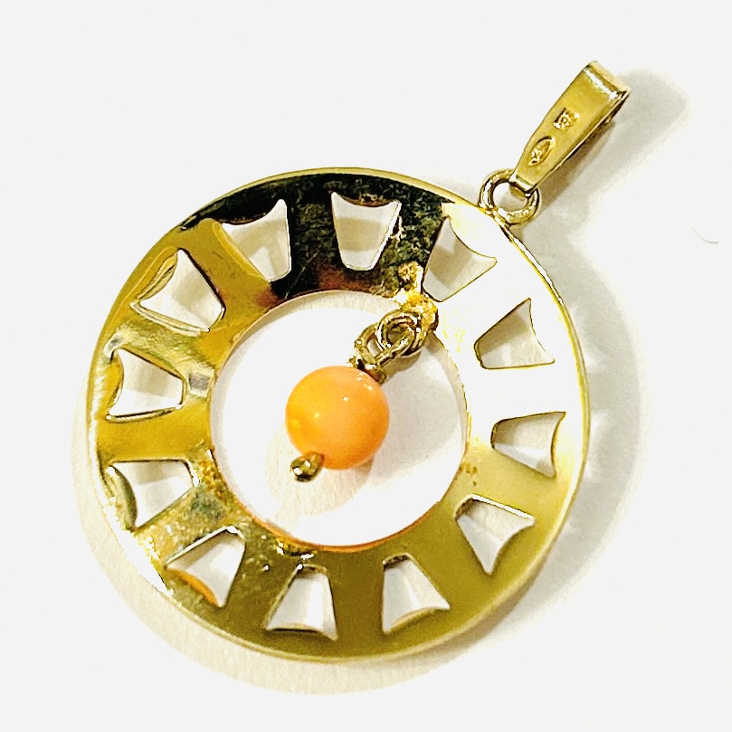 Větší kulatý přívěšek, tvarováno technikou prořezávaní a zdobeno jemným gravírováním, decentní ověsek s kuličkou přírodního růžového mořského korálu. Kvalitní práce klenotnického družstva Jablonecká bižuterie z 70. až 80. let 20. století.