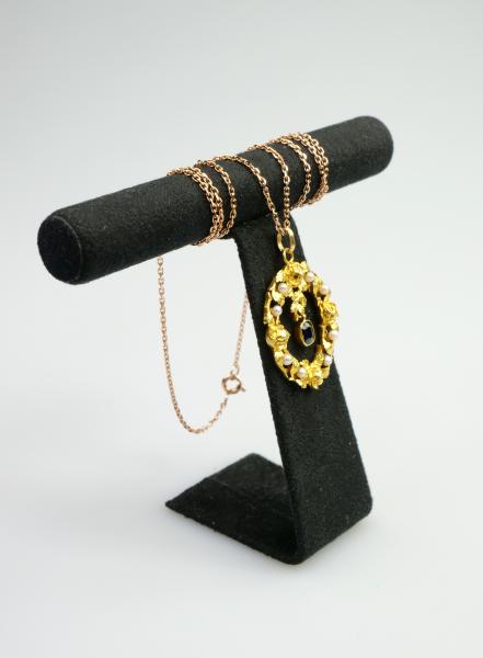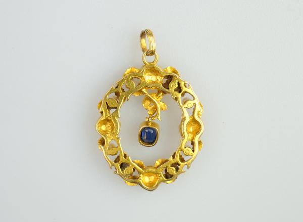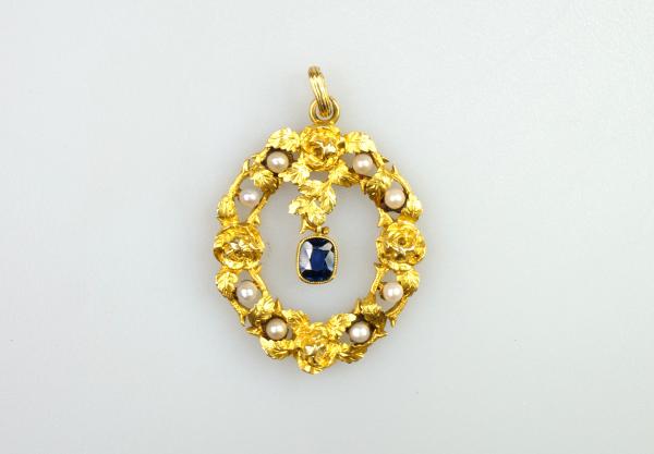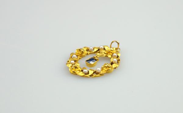 zlatý přívěsek s modrým safírem a říčními perlami, Au btto 5,90g/750/000; západní Evropa, kolem roku 1935; rozměry: 3 x 2,3 cm, atest Puncovního úřadu