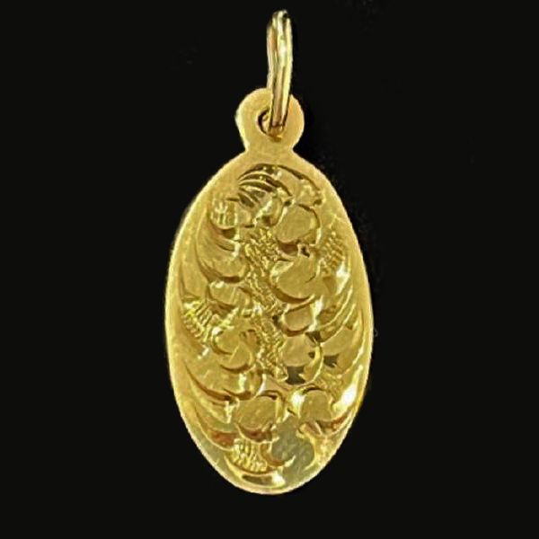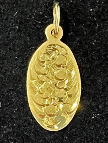 Zlatý přívěšek ze žlutého 14 karátového zlata s ručním gravírováním váha přívěšku 0,88 gramů, výška přívěšku, včetně ouška cca 2 cm.