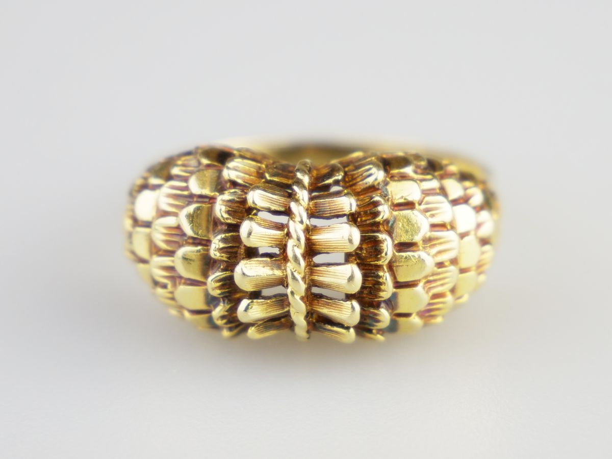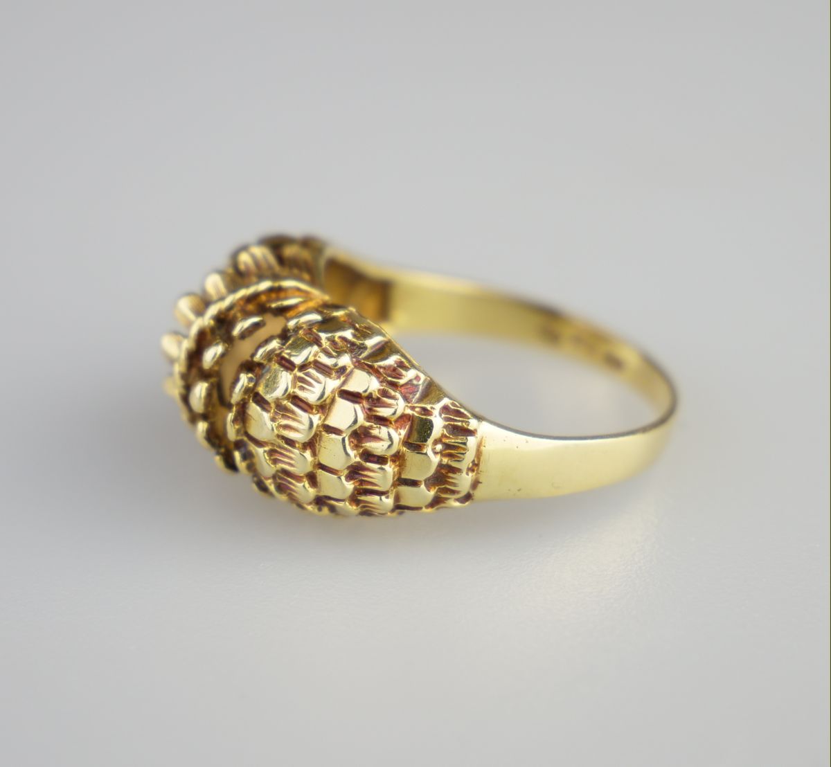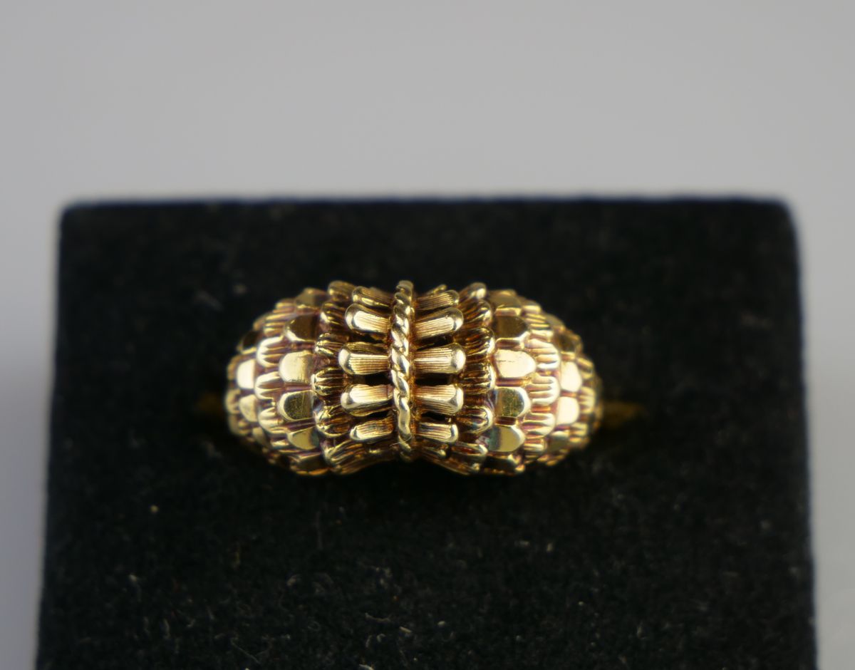 celozlatý prsten s šupinovým dekorem, Au 4,66 g/585/1000, Československo, kolem r. 1980, dobový punc (čejka), rozměr hlavy 2 x 1 cm; velikost prstenu 56