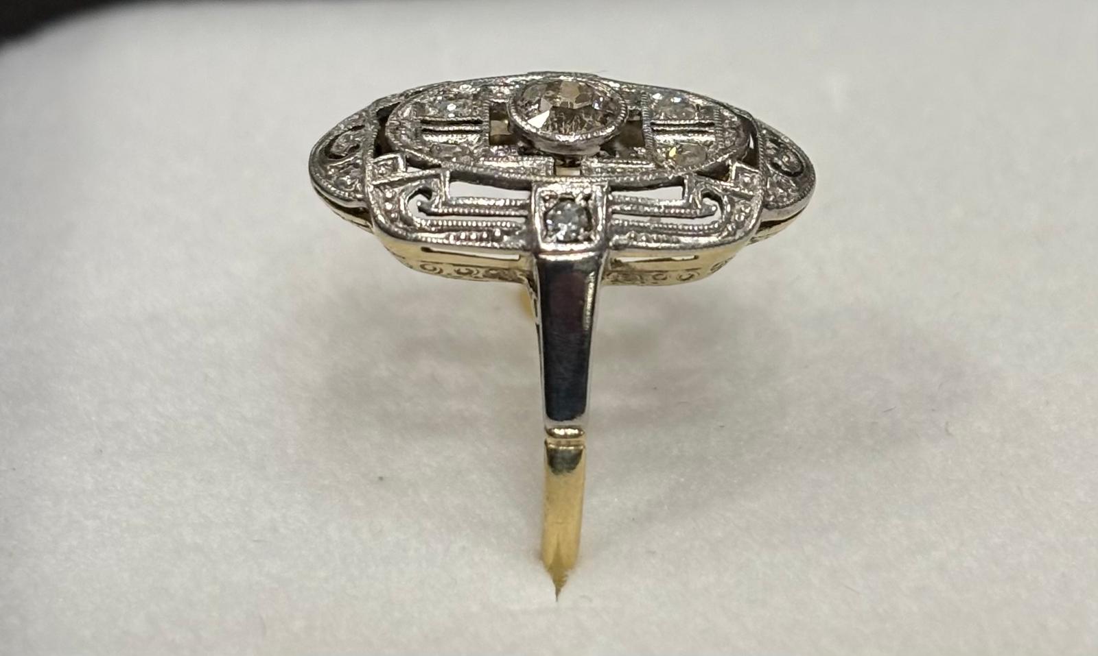Krásná stará práce. Prsten osazen briliantem o velikosti 0,20 ct + routy. Váha 2,85 g / 585. Velikost prstenu č. 55.