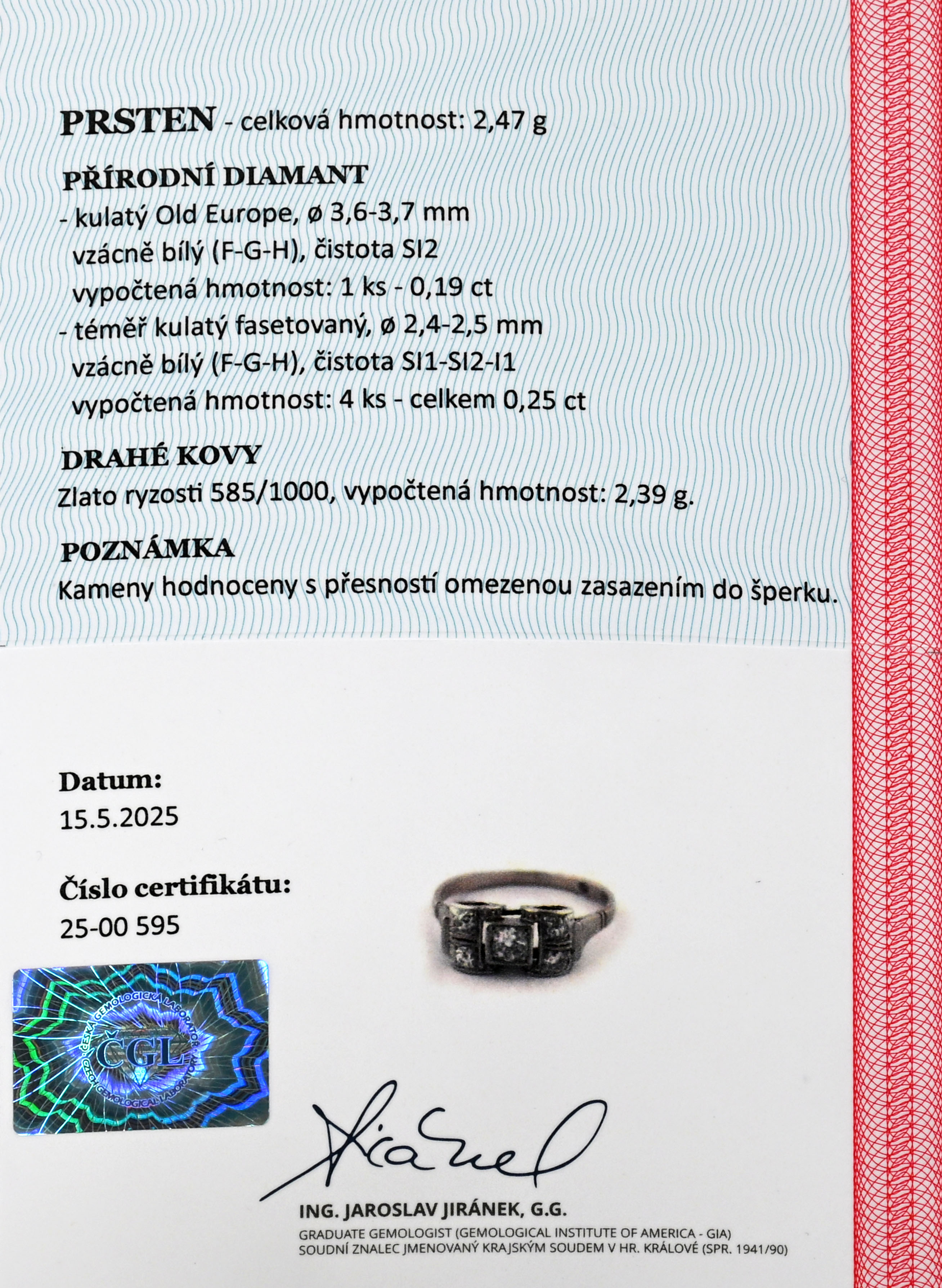 – 1 ks přírodní diamant, celkem 0,19 ct, Old Europe, vzácně bílý (F-G-H), čistota SI2,