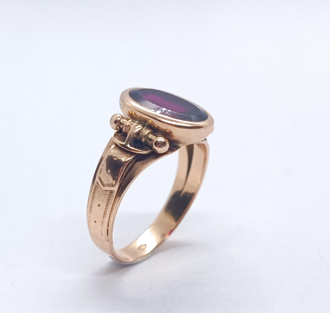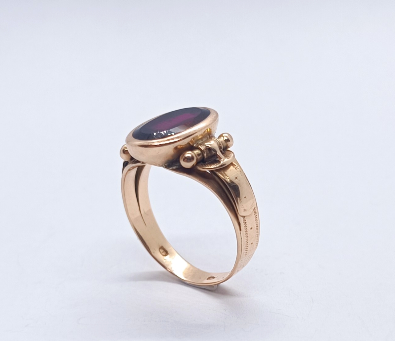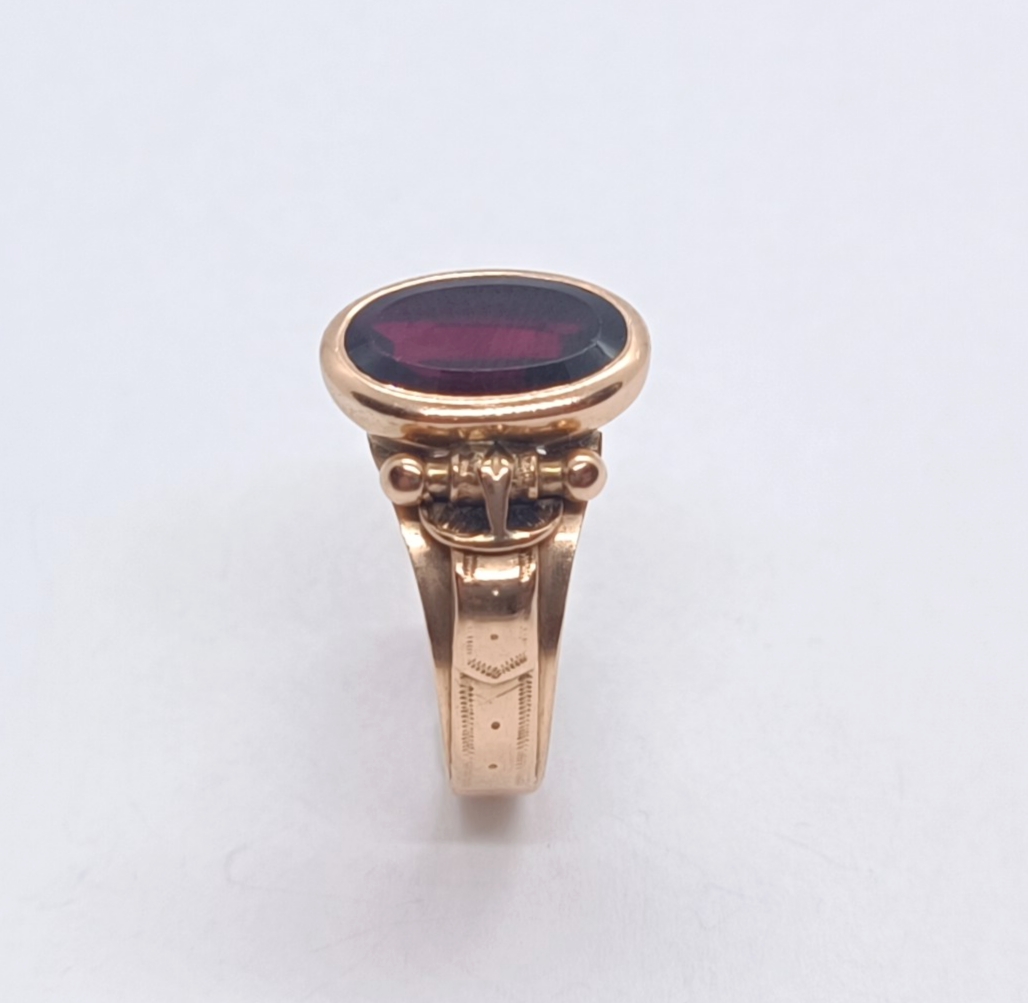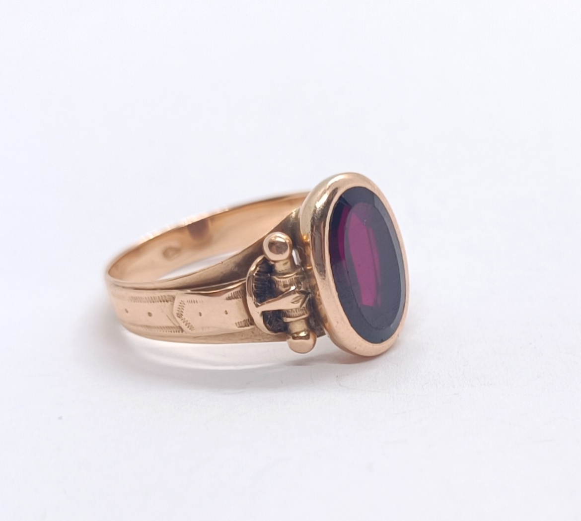 Zlatý prsten s oválným broušeným almandinem, zdobený gravírovanými prvky v podobě přezky, Au btto 5,36g/580/1000, Rakousko – Uhersko, Praha, kolem roku 1900; velikost prstenu 60