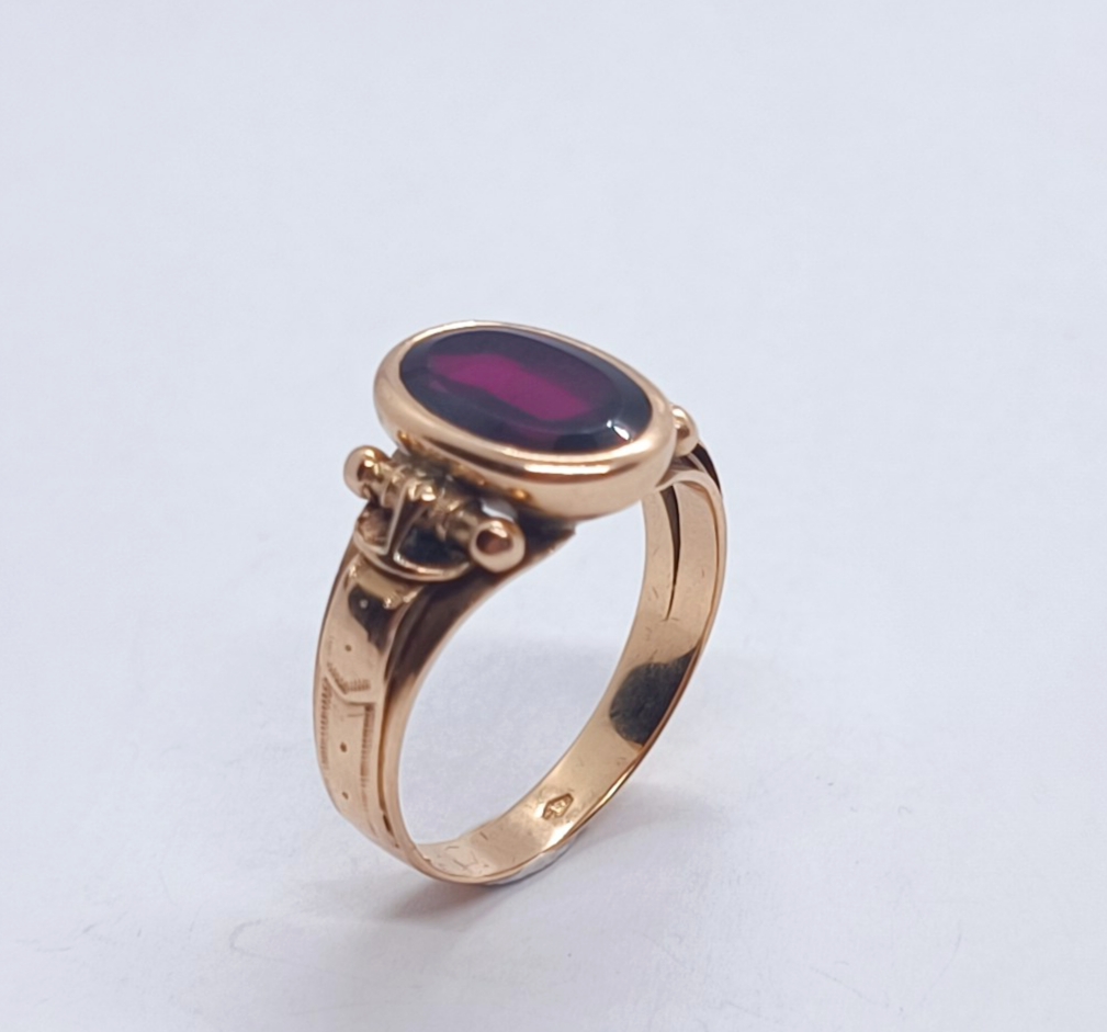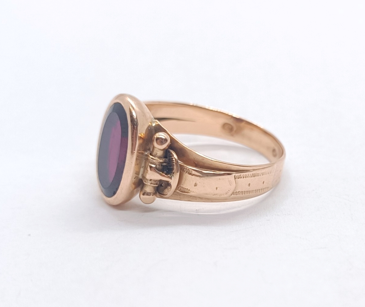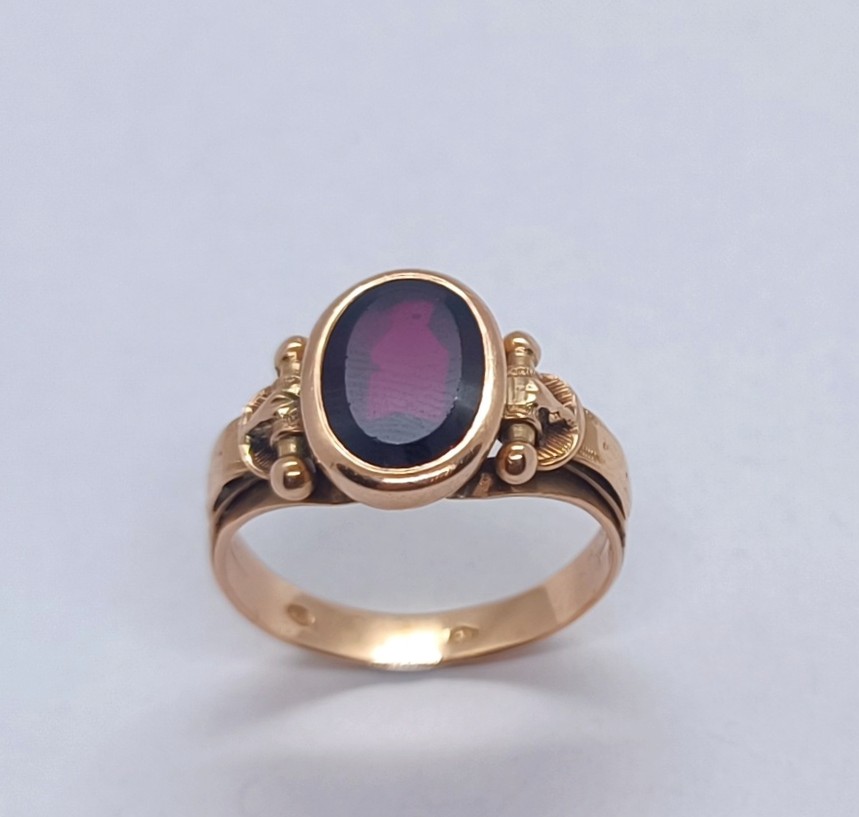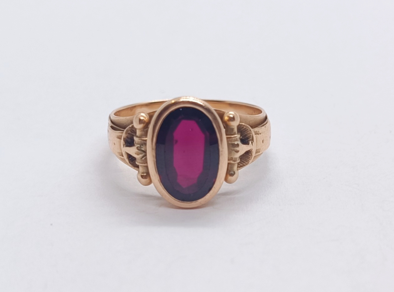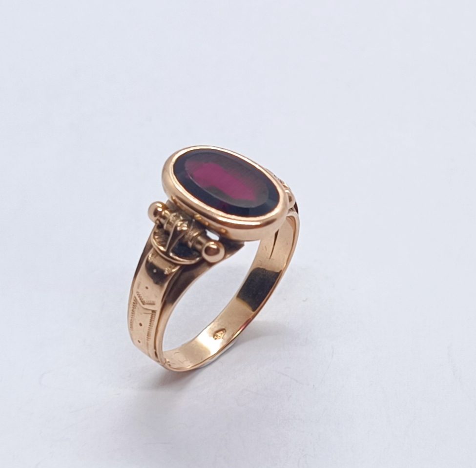 Zlatý prsten s oválným broušeným almandinem, zdobený gravírovanými prvky v podobě přezky, Au btto 5,36g/580/1000, Rakousko – Uhersko, Praha, kolem roku 1900; velikost prstenu 60