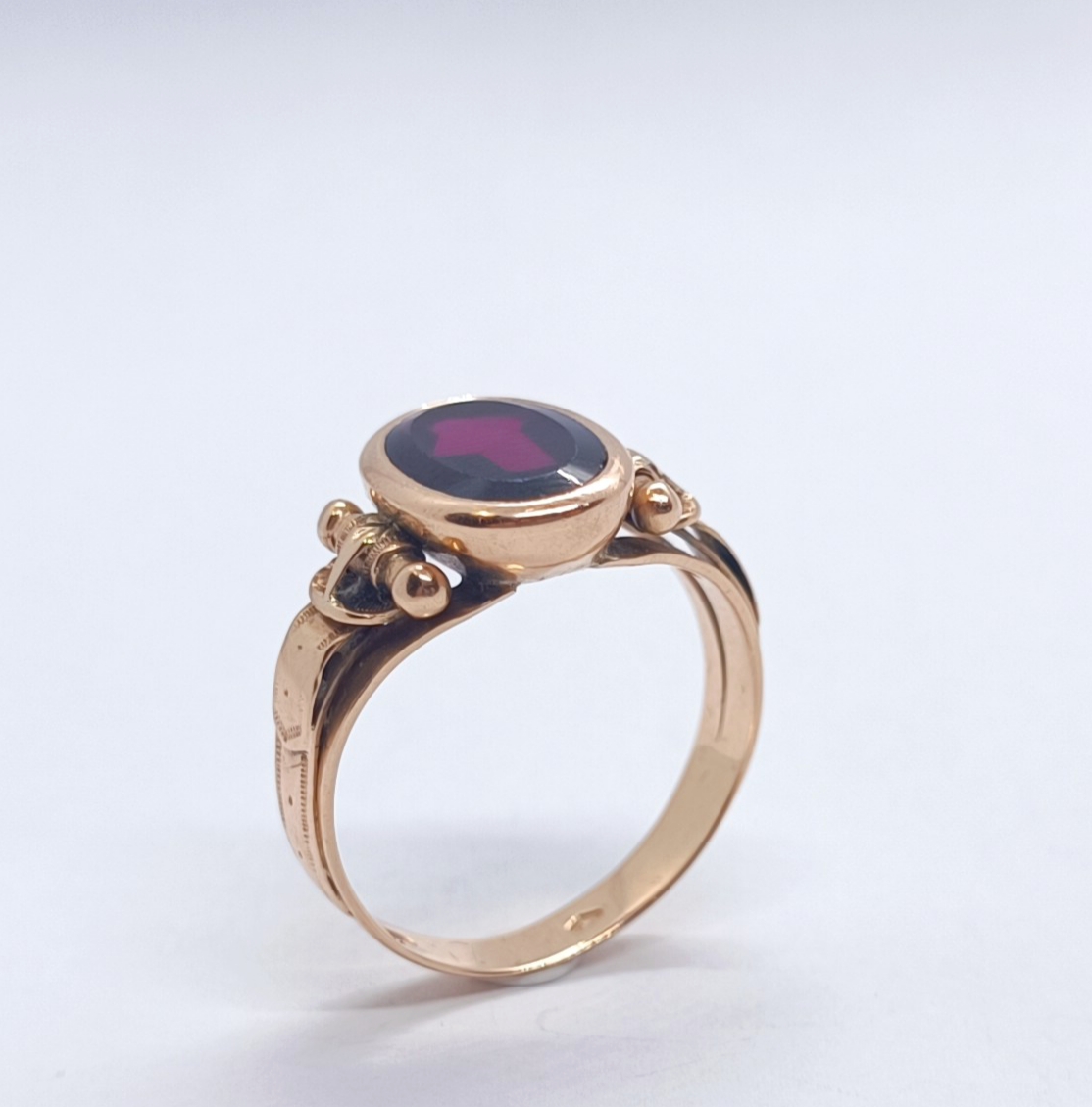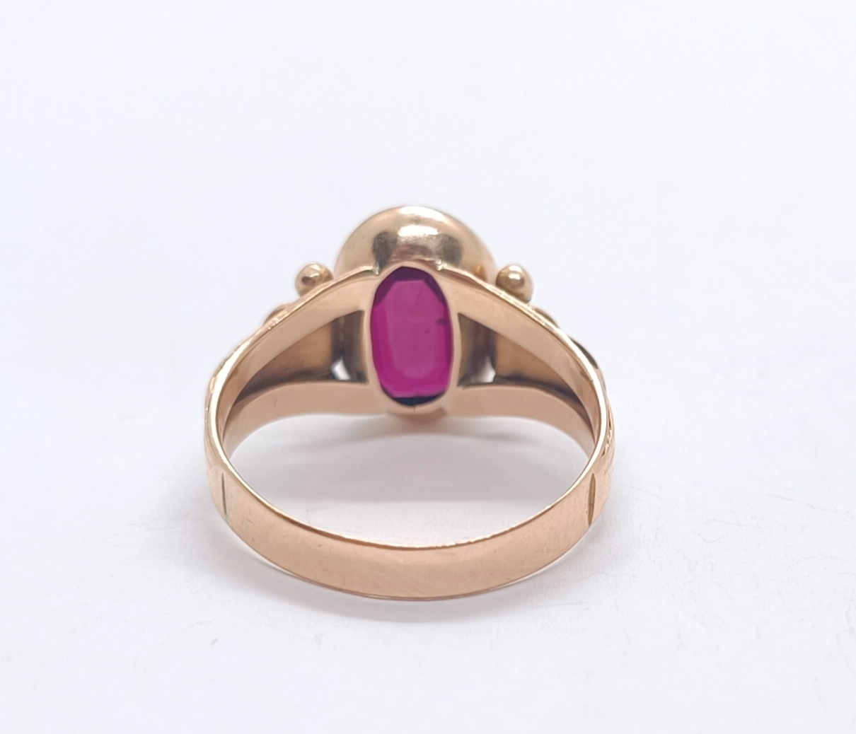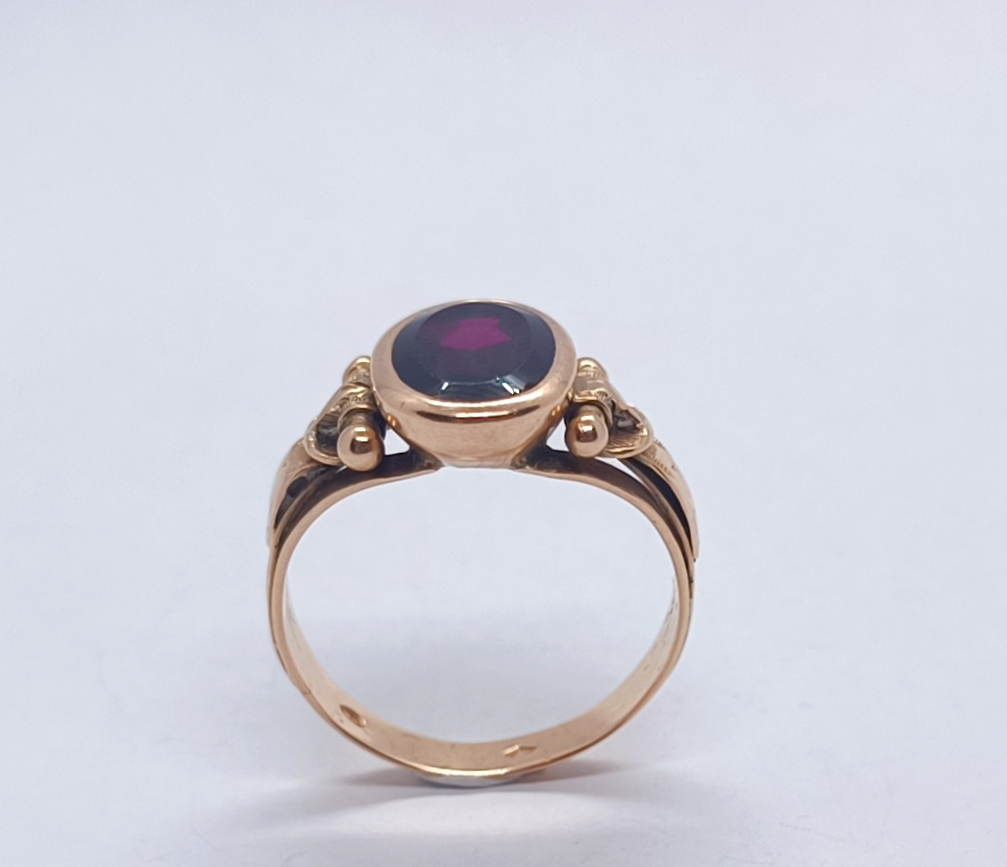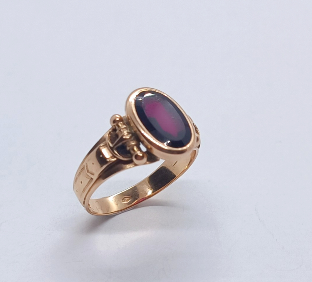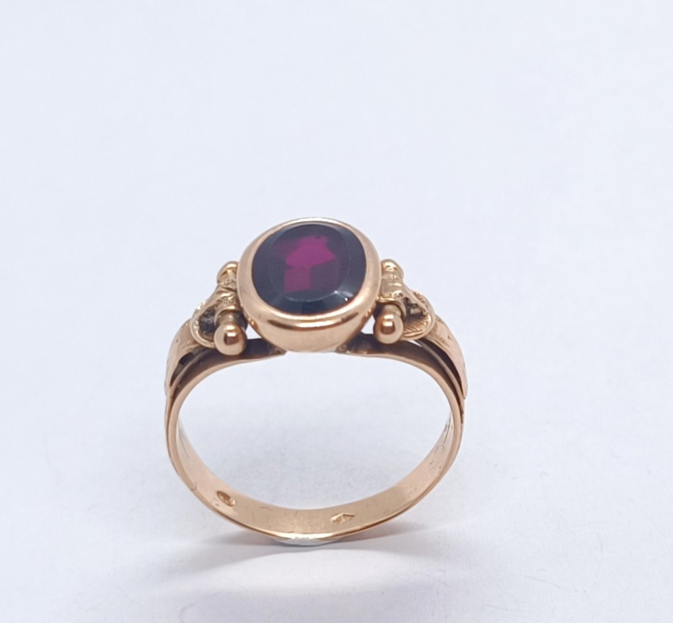 Zlatý prsten s oválným broušeným almandinem, zdobený gravírovanými prvky v podobě přezky, Au btto 5,36g/580/1000, Rakousko – Uhersko, Praha, kolem roku 1900; velikost prstenu 60