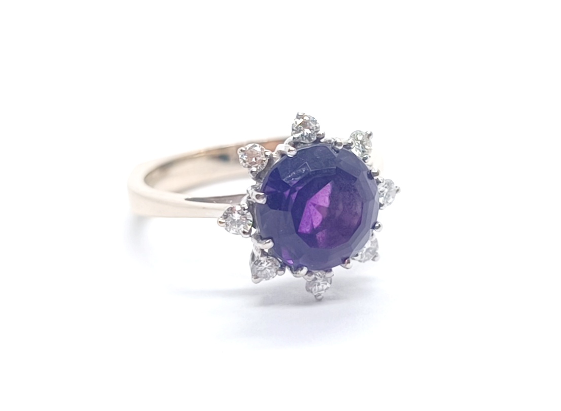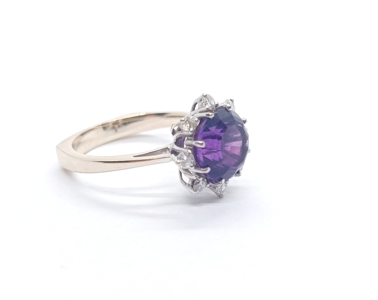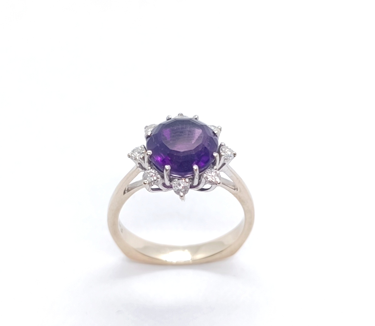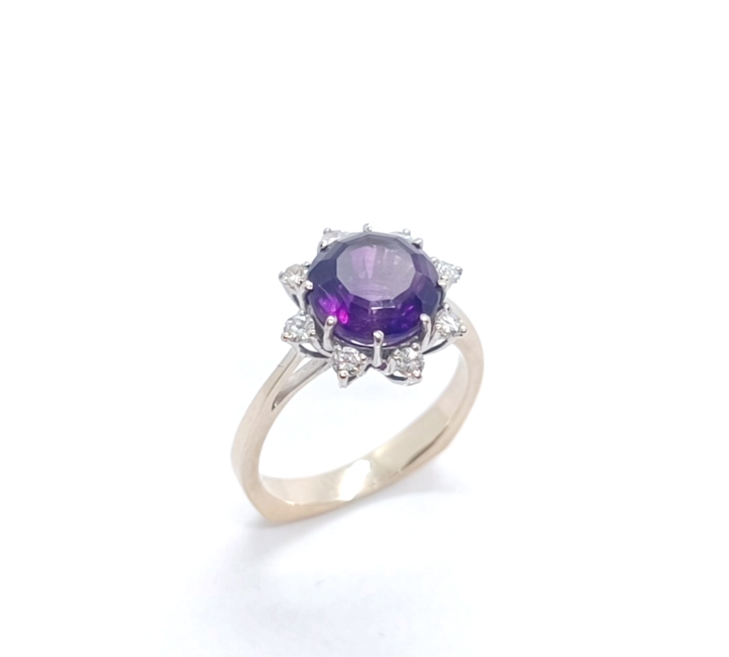 Zlatý prsten s přírodně sytě zbarveným ametystem a drobnými diamanty briliantového brusu o celkové hmotnosti cca 0,25 ct, Au btto 3,55g/585/1000, autorská práce, Západní Evropa, 70. léta 20. století, atest puncovního úřadu; velikost prstenu 51,5