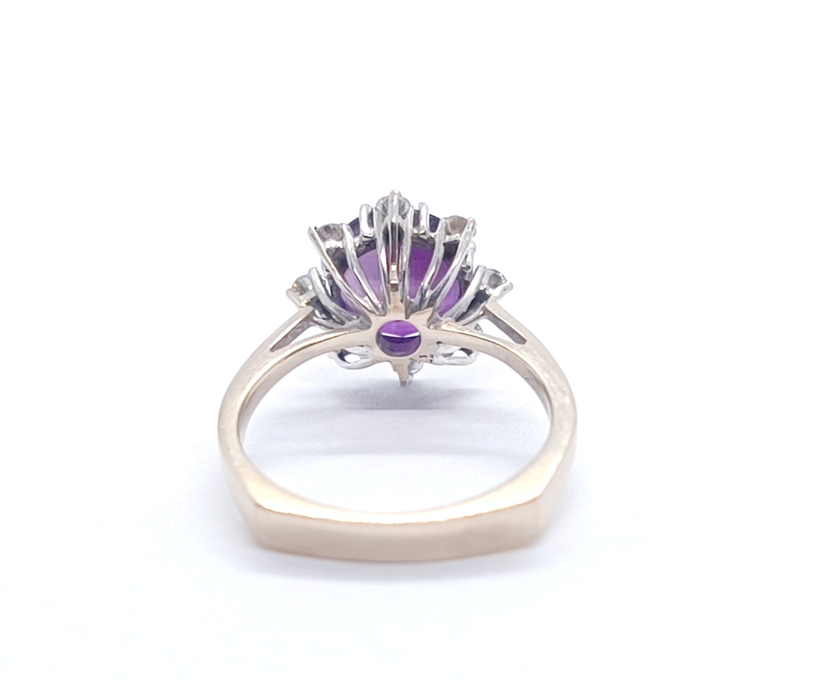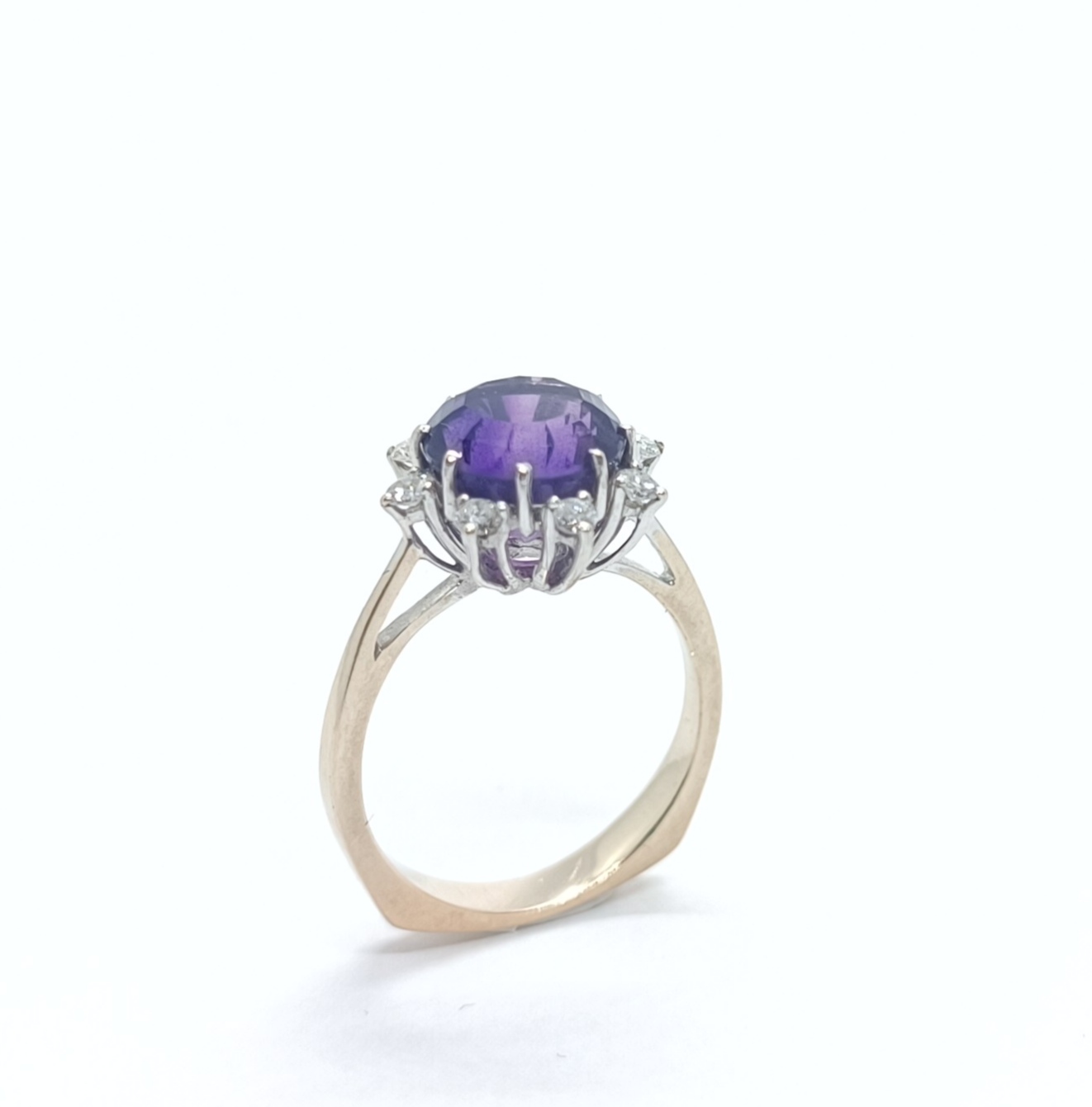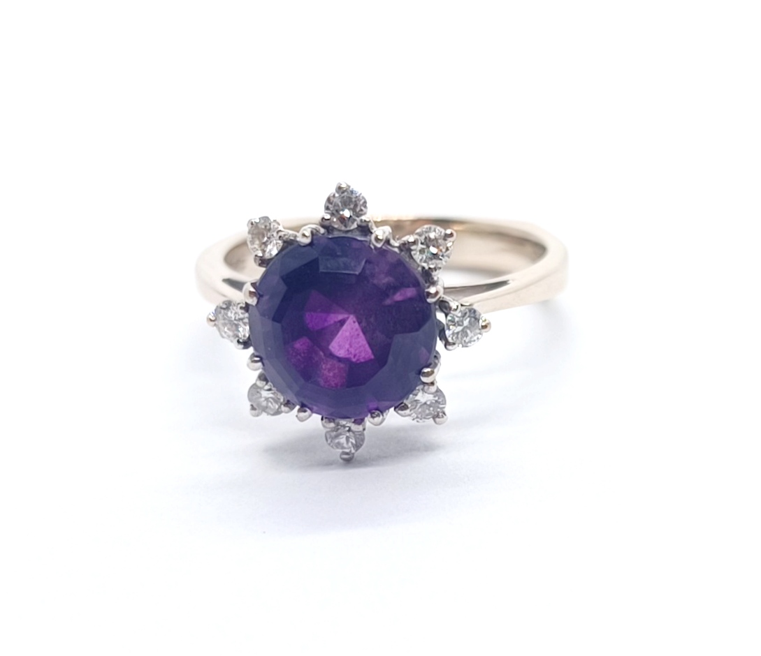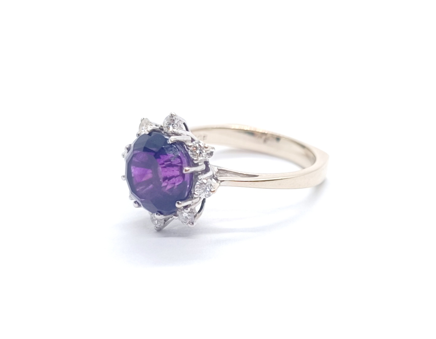 Zlatý prsten s přírodně sytě zbarveným ametystem a drobnými diamanty briliantového brusu o celkové hmotnosti cca 0,25 ct, Au btto 3,55g/585/1000, autorská práce, Západní Evropa, 70. léta 20. století, atest puncovního úřadu; velikost prstenu 51,5