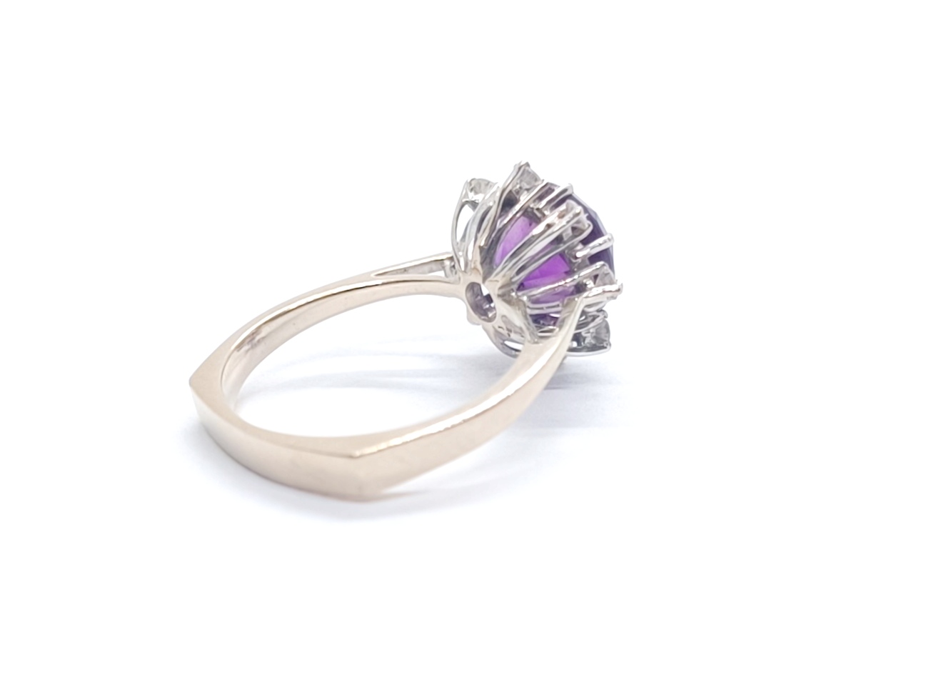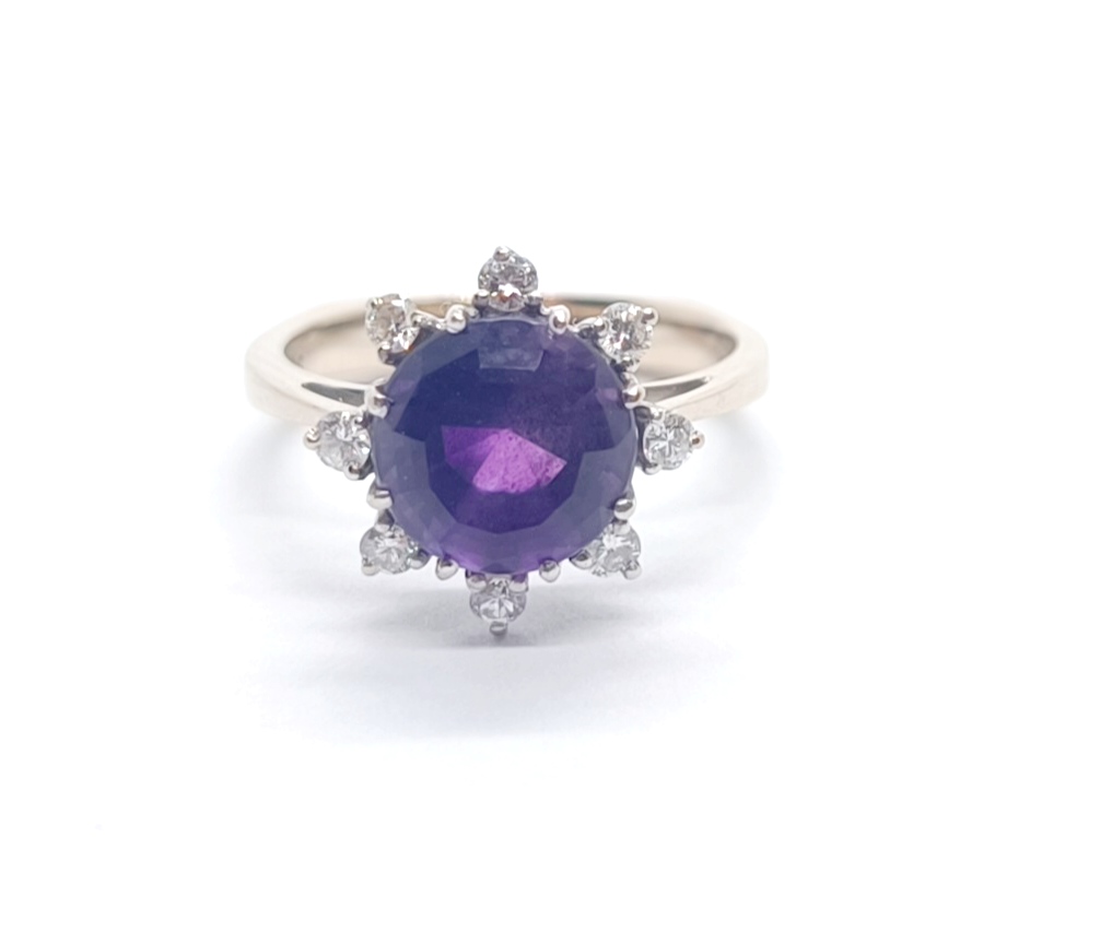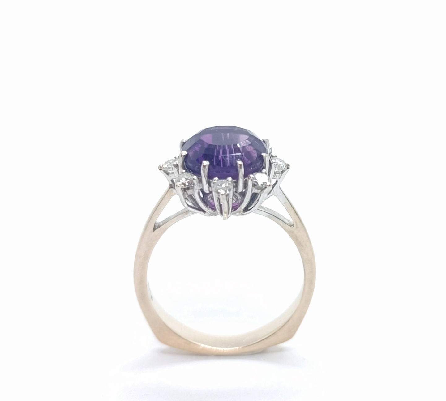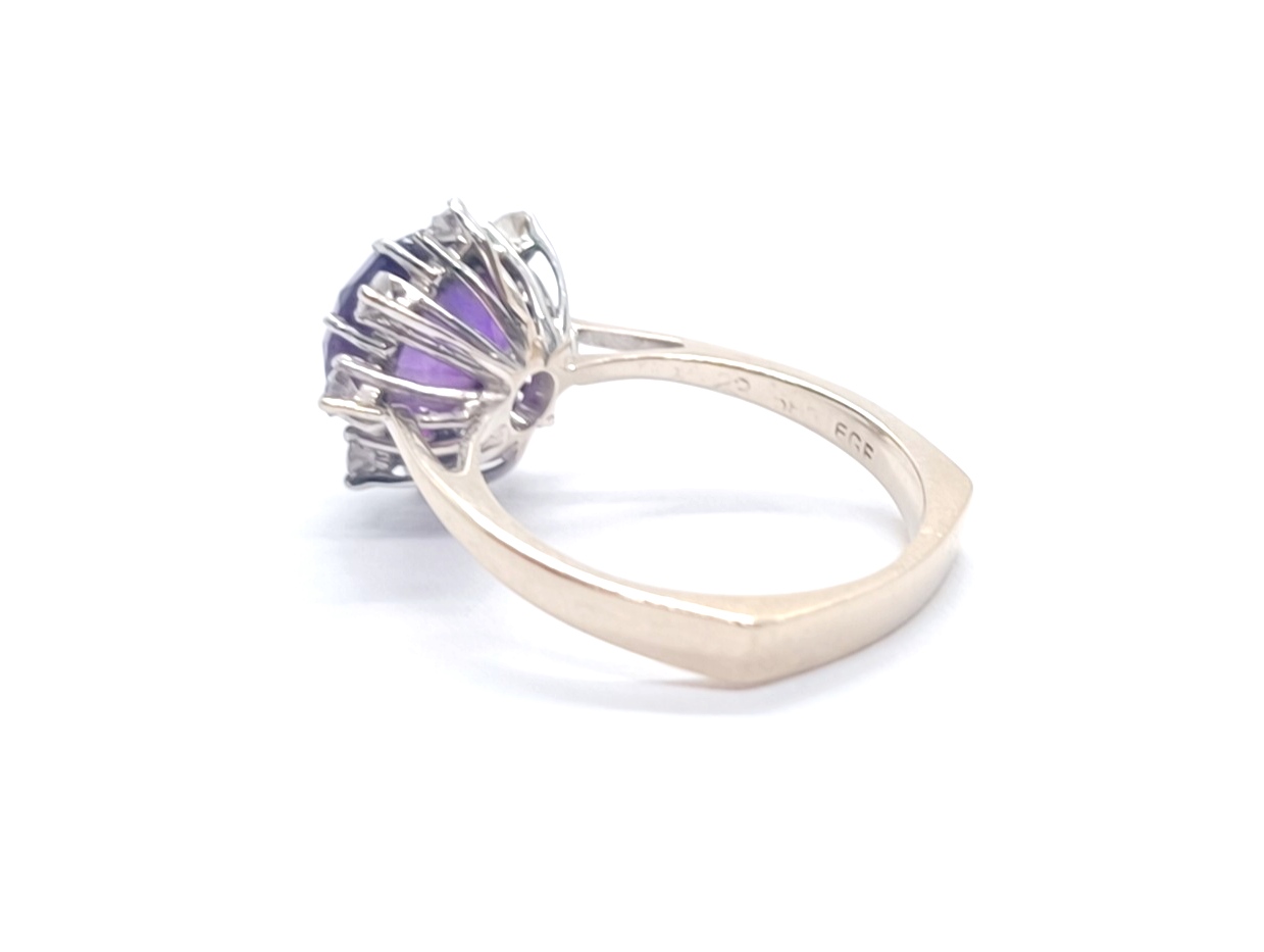 Zlatý prsten s přírodně sytě zbarveným ametystem a drobnými diamanty briliantového brusu o celkové hmotnosti cca 0,25 ct, Au btto 3,55g/585/1000, autorská práce, Západní Evropa, 70. léta 20. století, atest puncovního úřadu; velikost prstenu 51,5