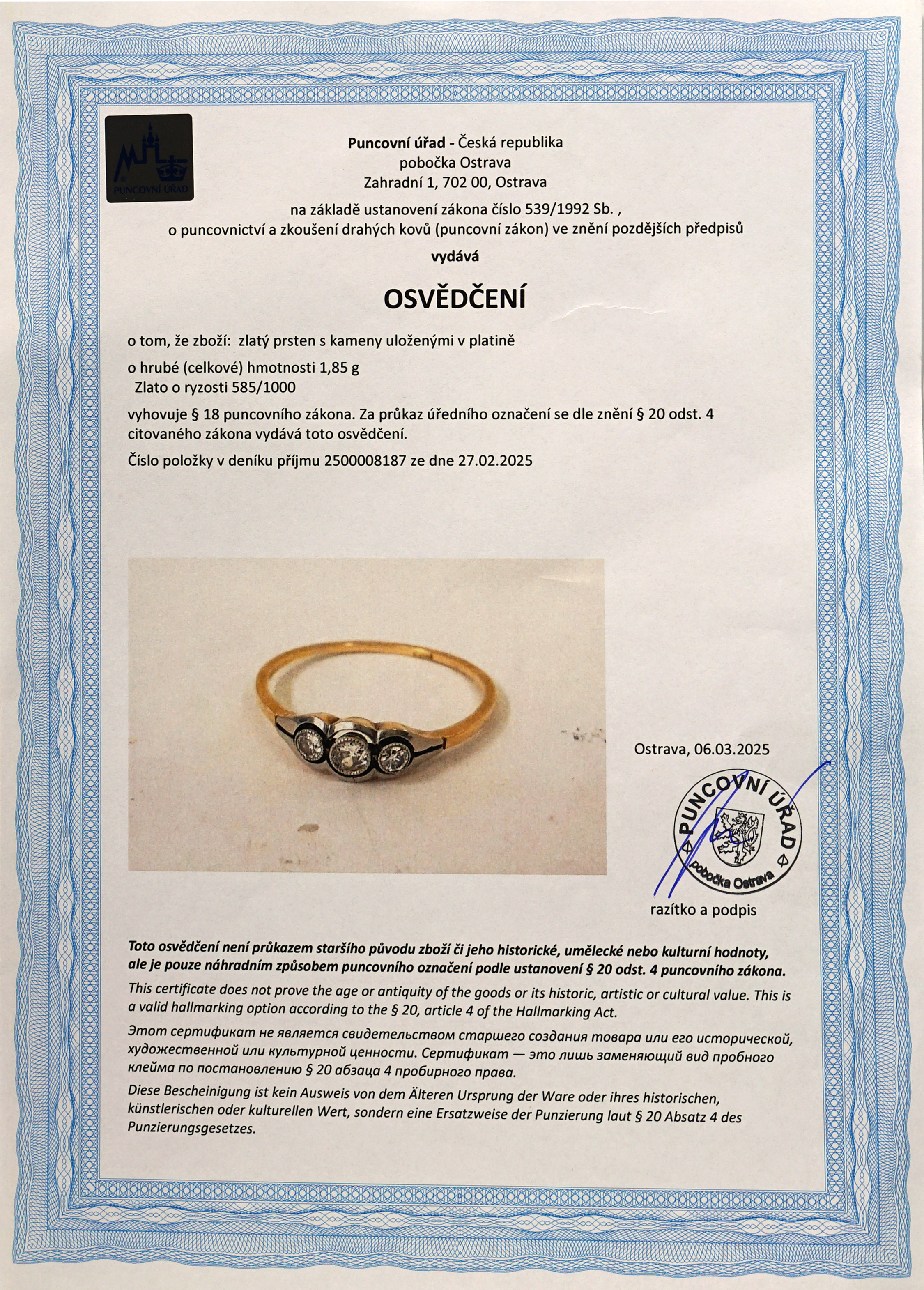 Zlato 14 karát. Váha 1,83 g / 585. Velikost prstenu č. 59. Osazený brilianty.
