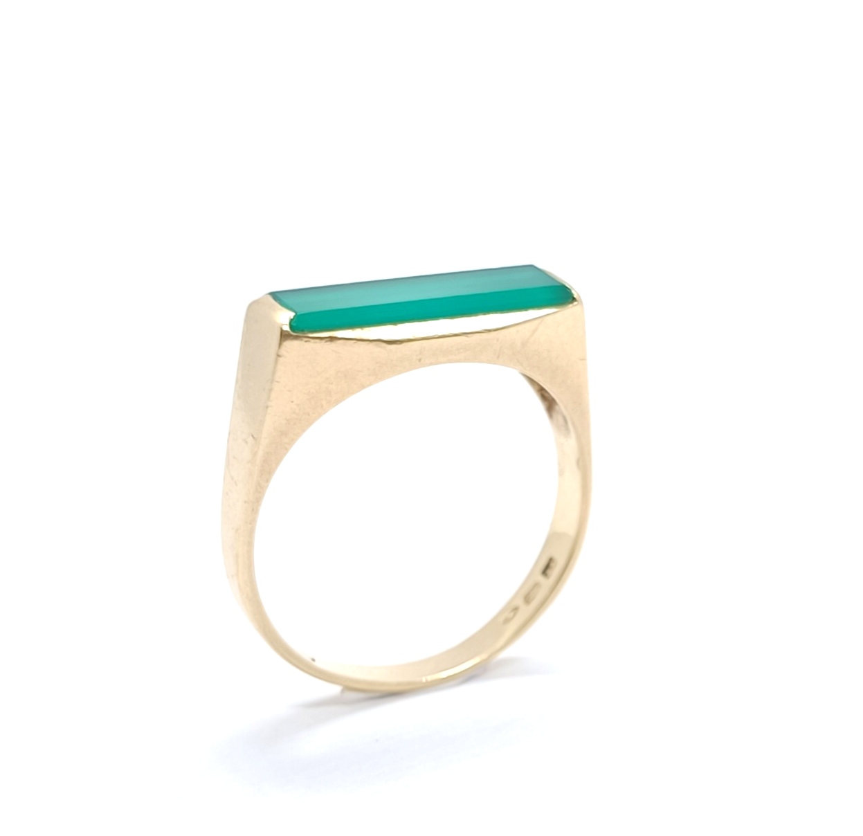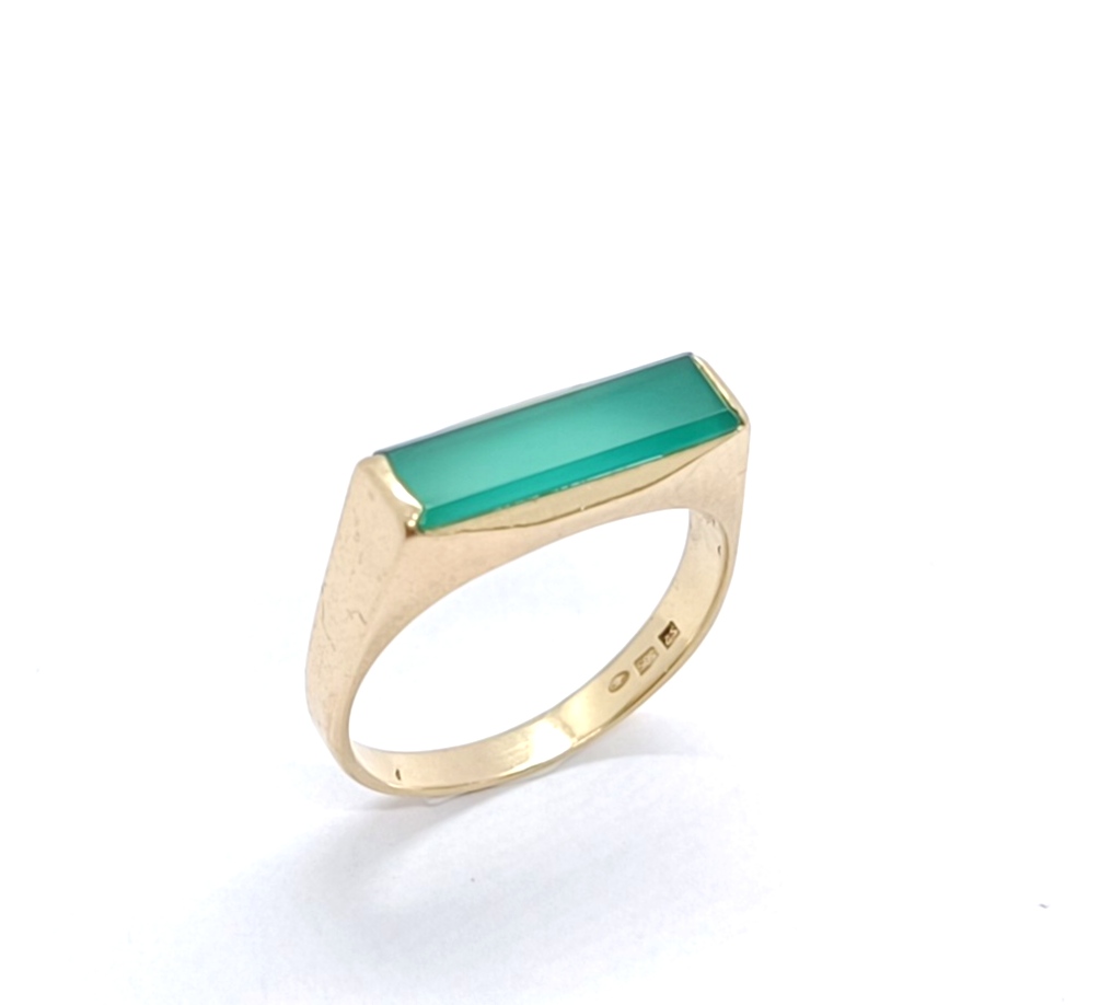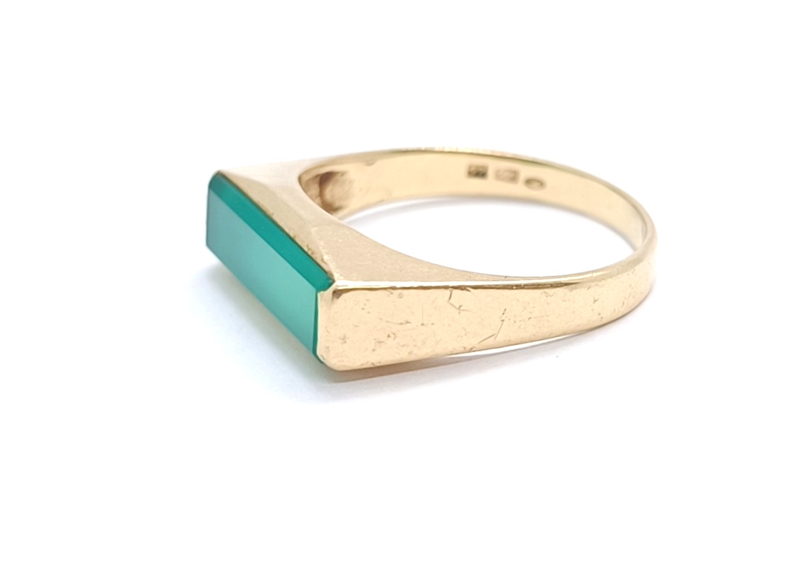 Zlatý pánský prsten s broušeným chryzoprasem, Au btto 4,8g/585/1000, Československo, 1. polovina 20. století; velikost prstenu 63