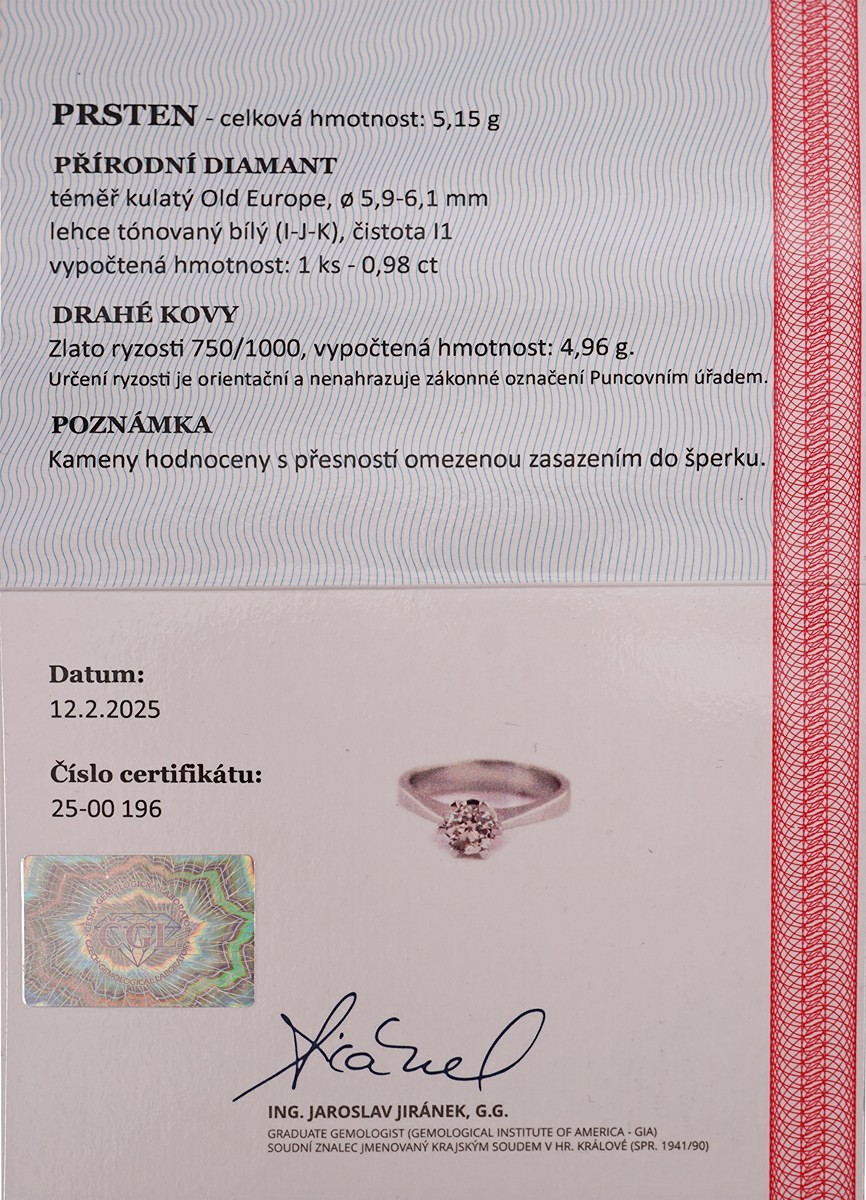 • 1 ks přírodního diamantu Old Europe, 0,98 ct, lehce tónovaný bílý (I–J–K), čistota I1, průměr 5,9–6,1 mm