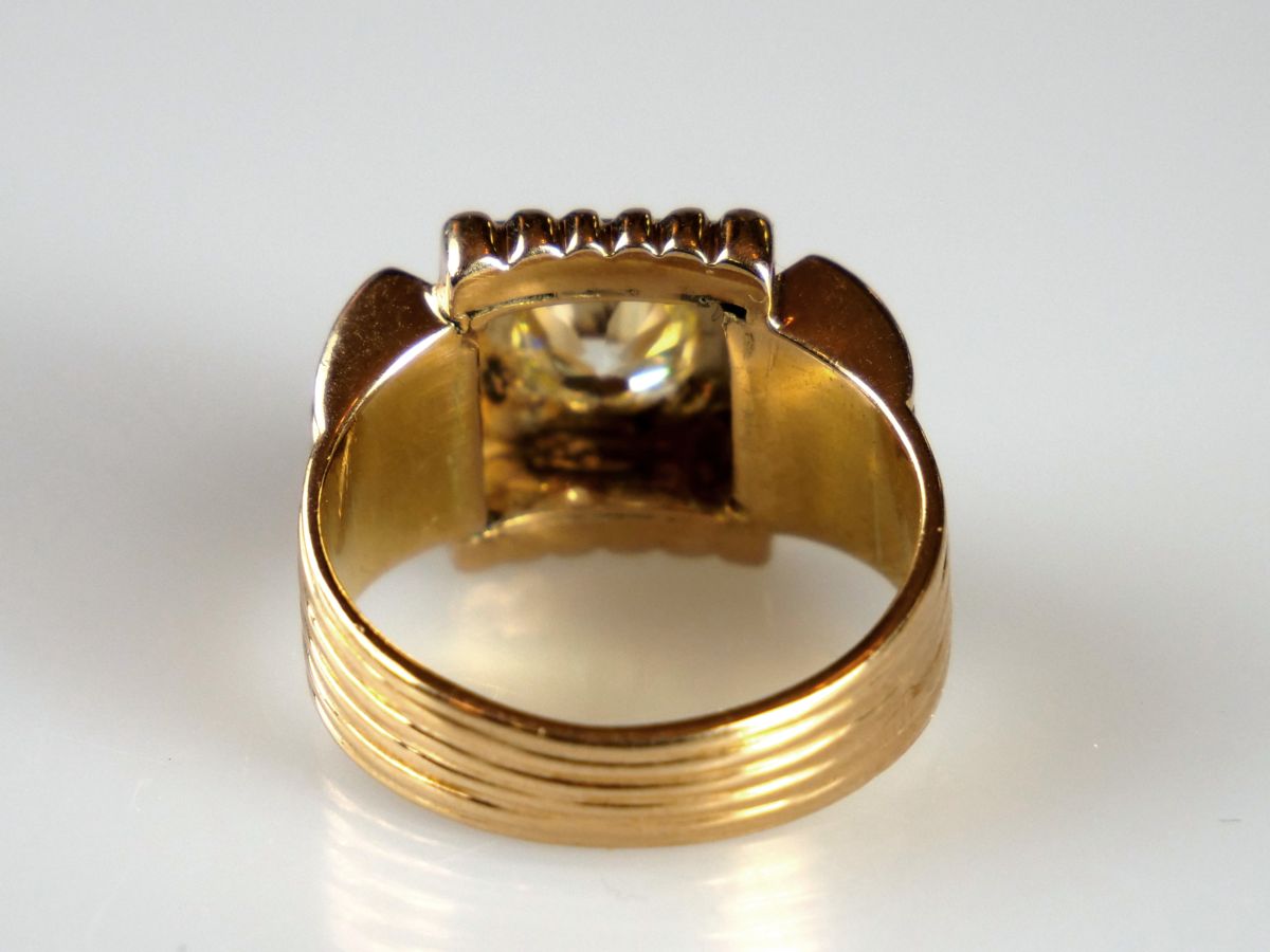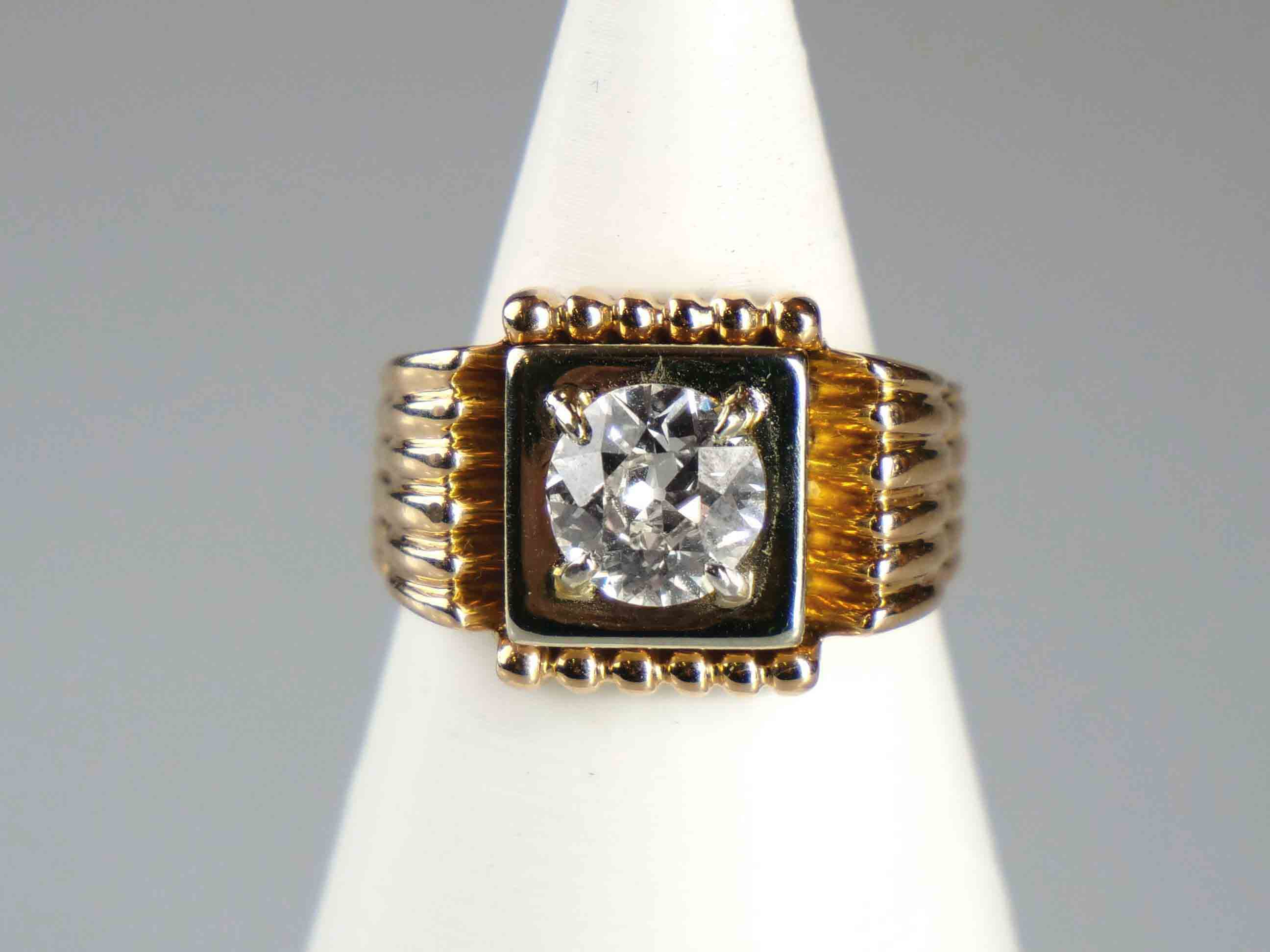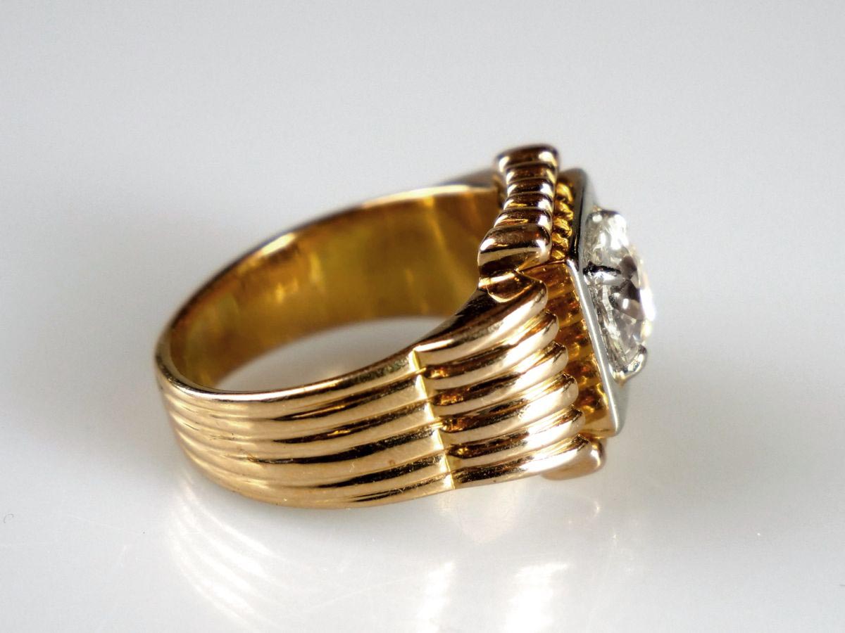 robustní zlatý prsten s přírodním diamantem starého briliantového brusu, hmotnost diamantu cca 1,48 ct, čistota IF (zcela bez inkluzí!), barva M, Au btto 11,97 g/750/000, západní Evropa, kolem r. 1980; atest Puncovního úřadu, znalecký posudek; velikost prstenu 57