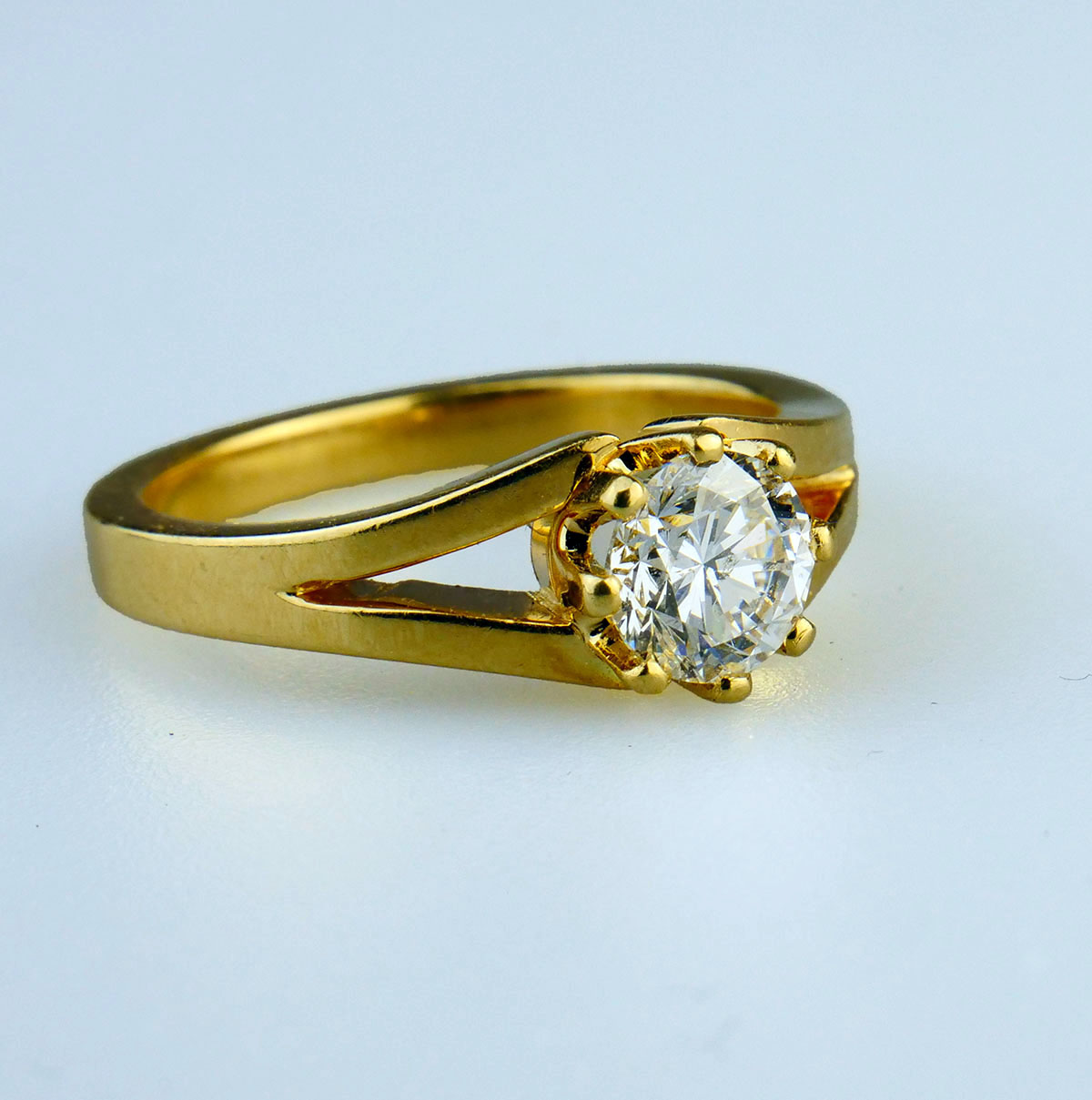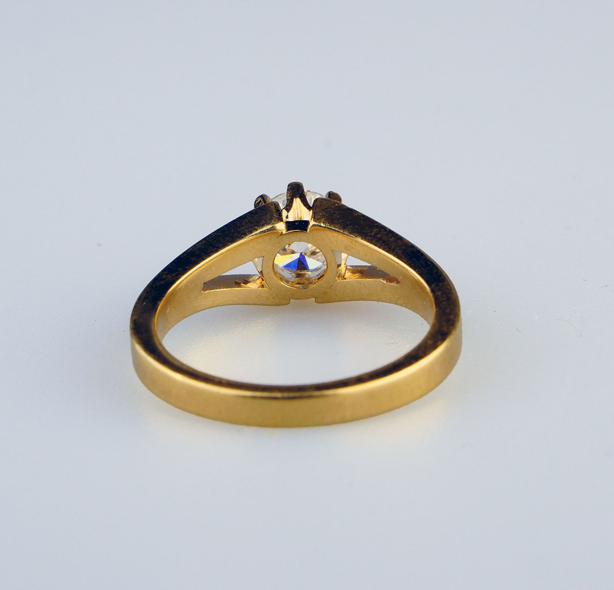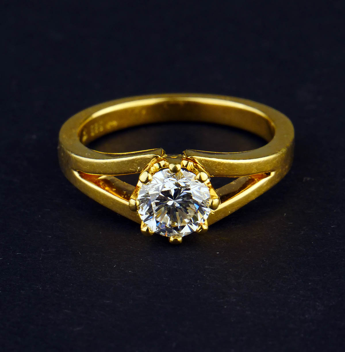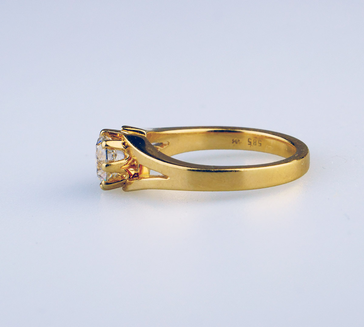 Zlatý prsten s diamantem briliantového brusu s výjimečnou brilancí o hmotnosti 0,96 ct, barva G, kvalita SI1, certifikát. Celková hmotnost Au 5,45 g/585/1000, punc. Západní Evropa, druhá čtvrtina 20. století, velikost prstenu 55.