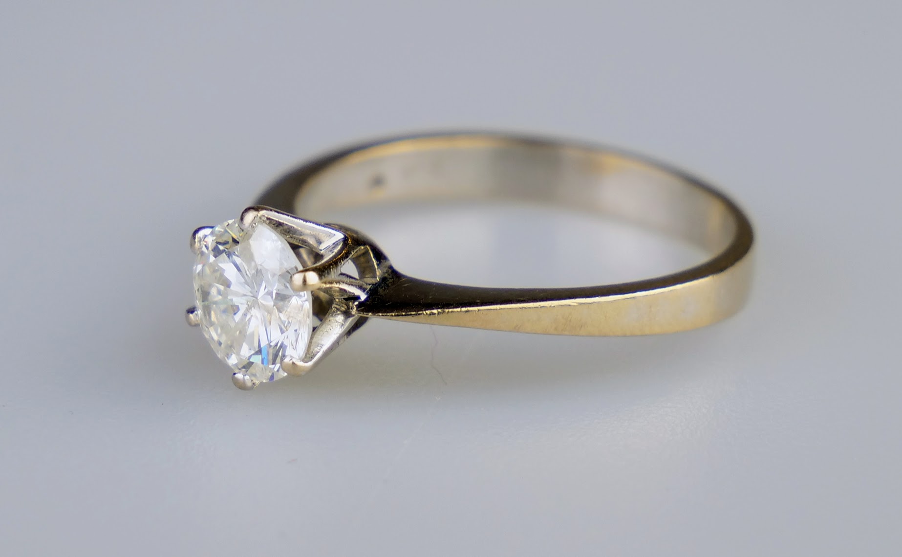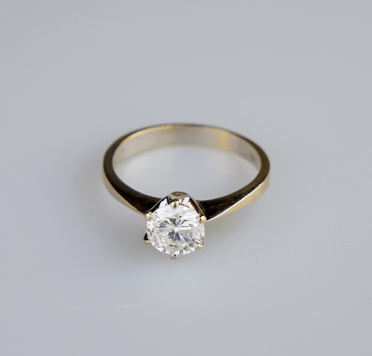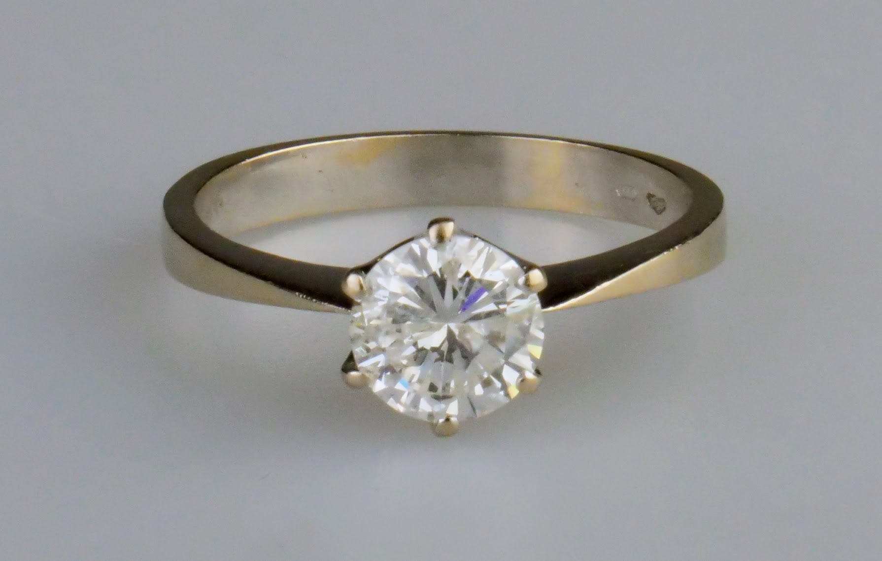 Solitérní klasický prsten z bílého zlata se zářivým diamantem briliantového brusu o hmotnosti 1,32 ct, průměr 7,04 x 7,08 mm, barva J-K, čistota P1. Celková hmotnost 3,41 g, Au 750/1000, rakouský a český punc, odborný posudek. Západní Evropa, třetí čtvrtina 20. století, velikost prstenu 60.