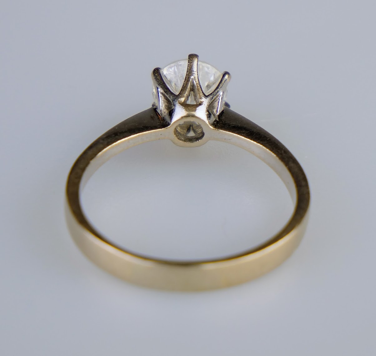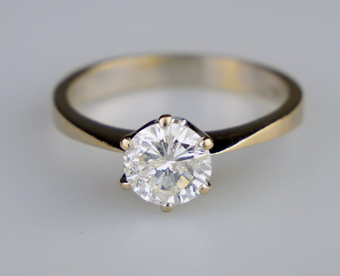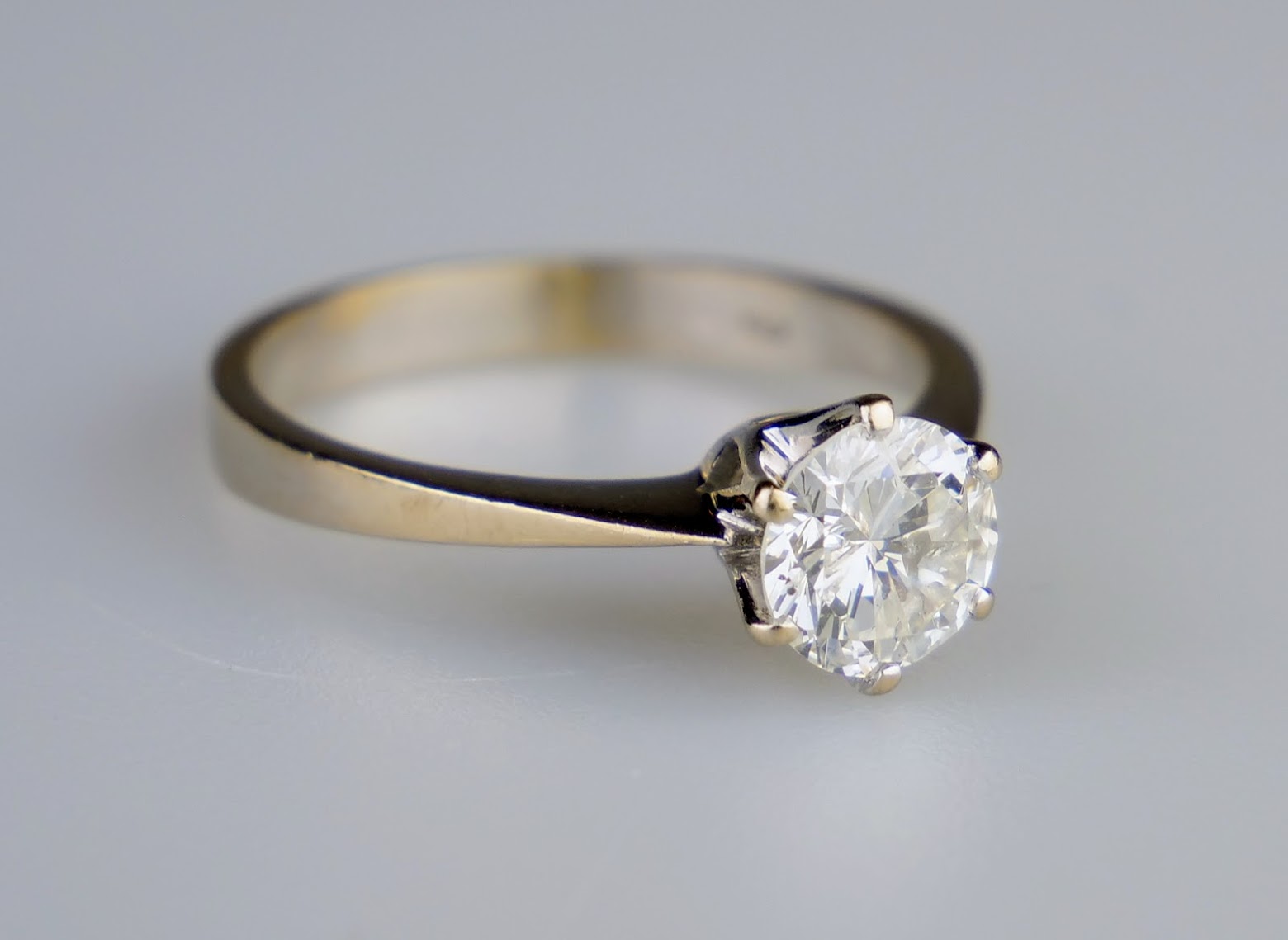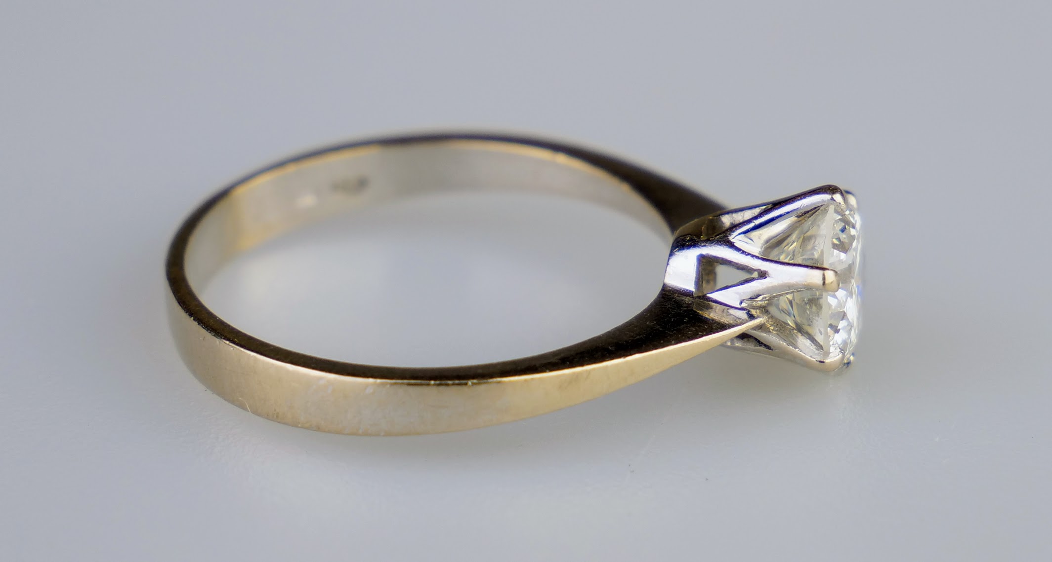 Solitérní klasický prsten z bílého zlata se zářivým diamantem briliantového brusu o hmotnosti 1,32 ct, průměr 7,04 x 7,08 mm, barva J-K, čistota P1. Celková hmotnost 3,41 g, Au 750/1000, rakouský a český punc, odborný posudek. Západní Evropa, třetí čtvrtina 20. století, velikost prstenu 60.
