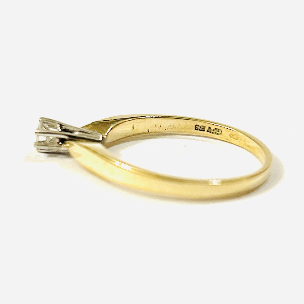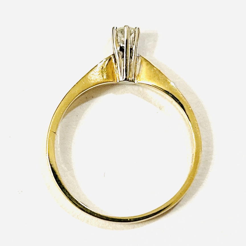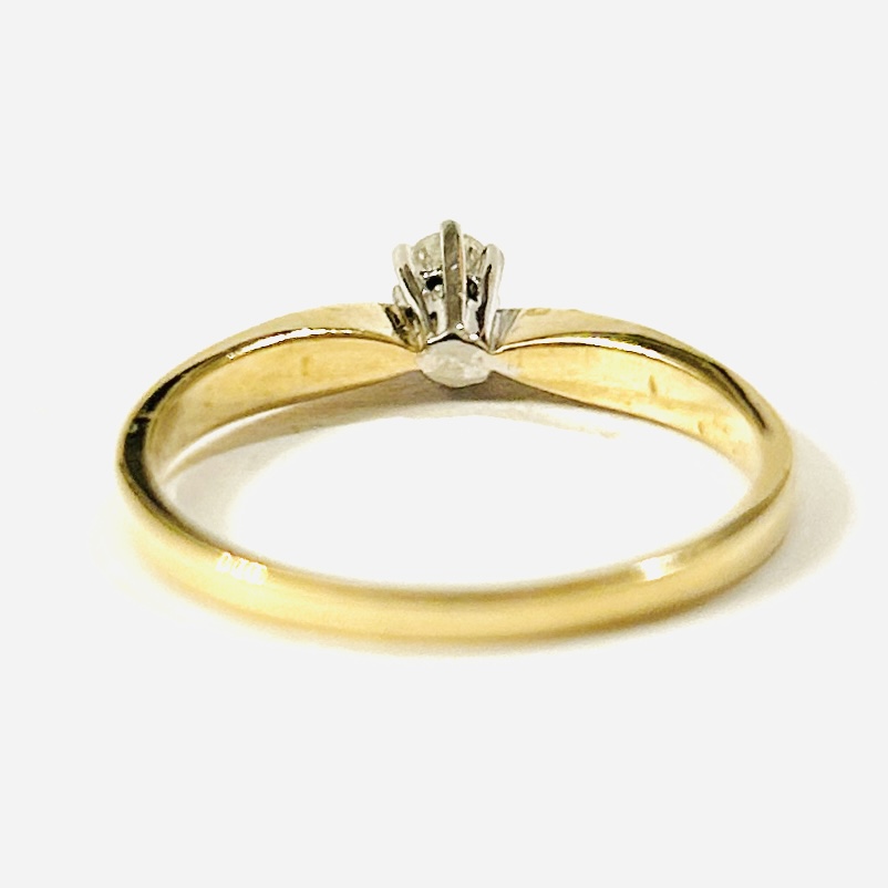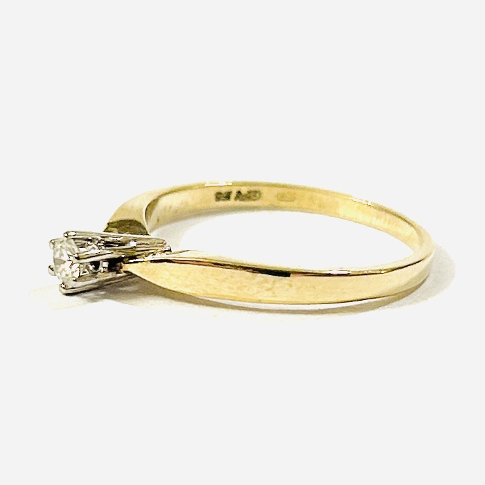 Zhotoveno ze žlutého 14 karátového zlata, tj. o ryzosti 585/1000; nově opatřeno puncem Z-58 (labuť 4), ryzostní číslo, výměra karetáže \“0,08 CT\“ a značka výrobce \“GFV\“ zevnitř šíny. Hmotnost 1,71 g, velikost 50, šířka hlavice 3,5 mm. Ve velmi zachovalém stavu, odborně vyčištěno a vyleštěno zlatníkem.
