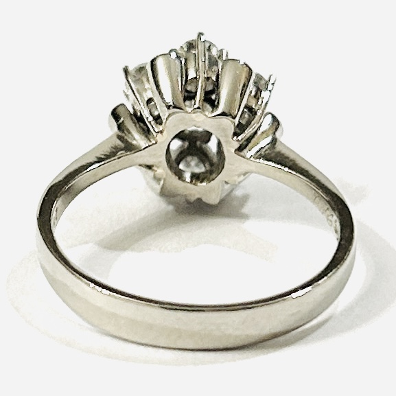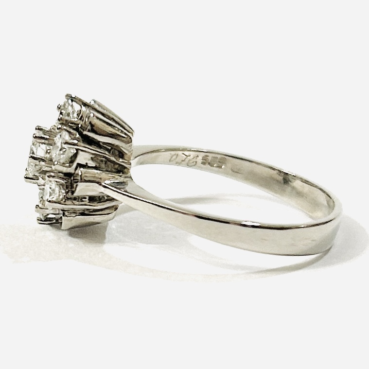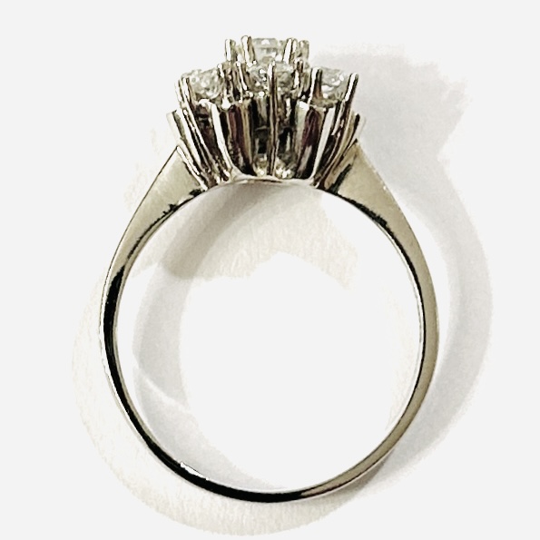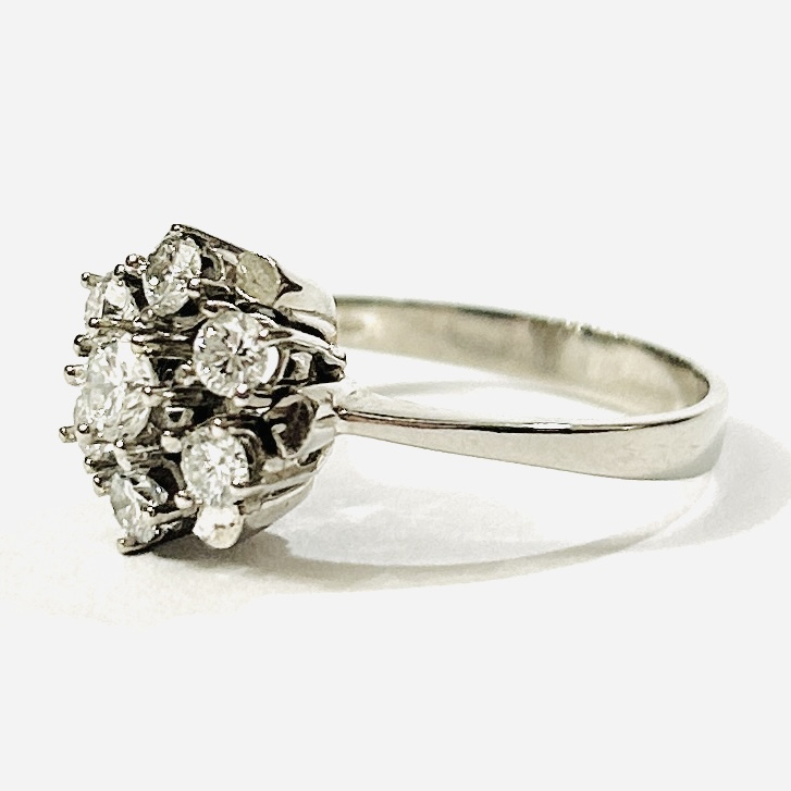 Elegantní, apartní prsten s hlavicí ve tvaru kulatého květu, osazeno přírodními diamanty kulatého briliantového brusu o celkové váze 0,68 ct (0,20 ct – 1 ks; 0,08 ct – 6 ks), kvalita velmi dobrá. Fasováno v krapnových korunách v kombinaci s opticky efektními ploškami. Precizní západoevropská klenotnická práce z poslední čtvrtiny 20. století.