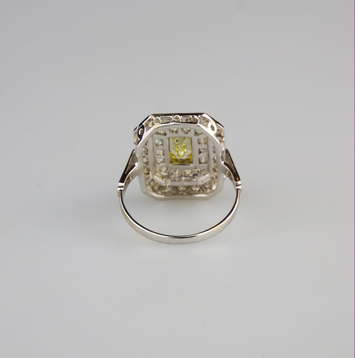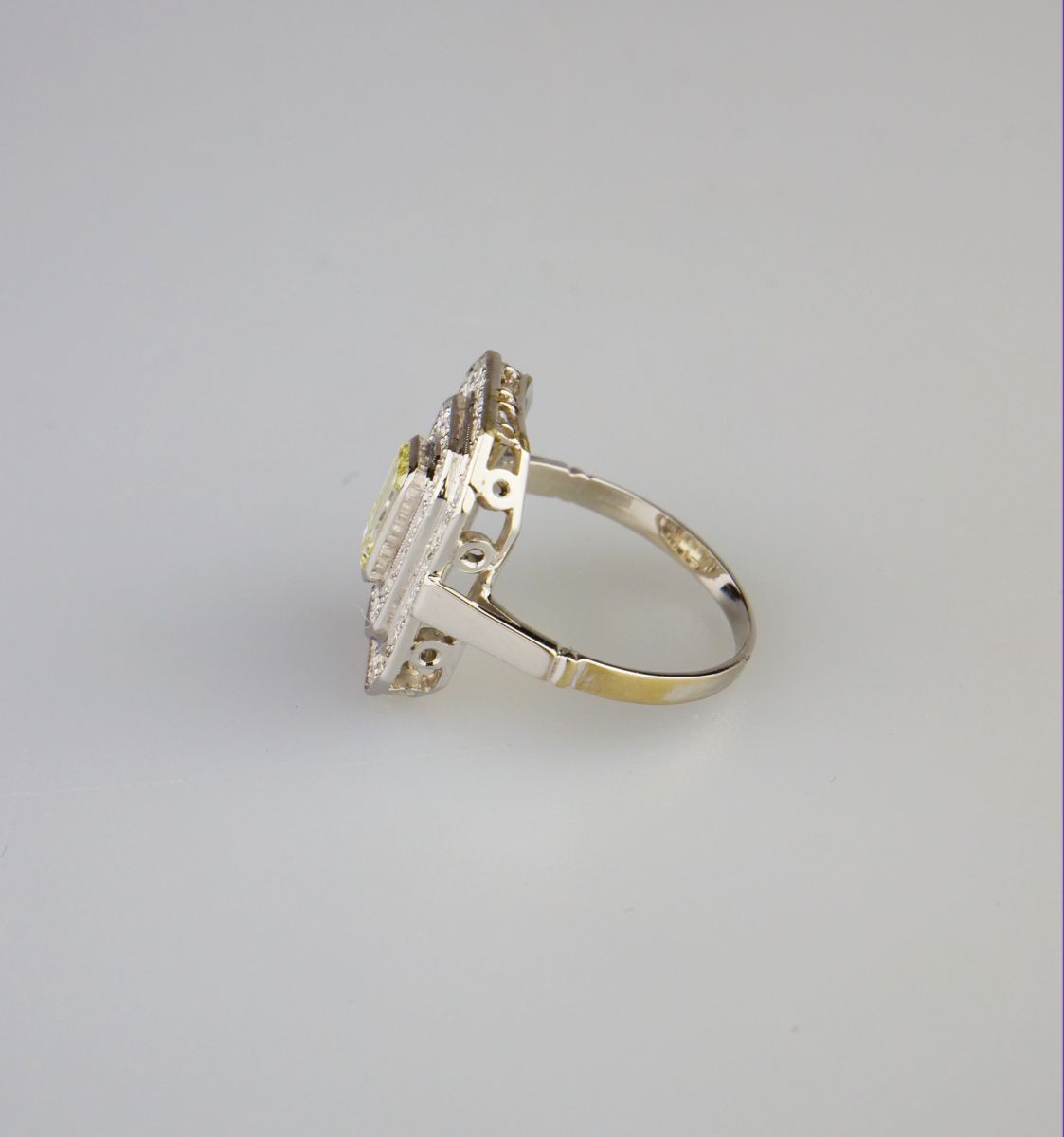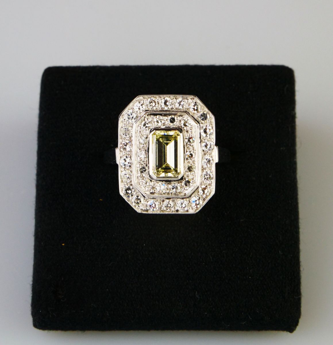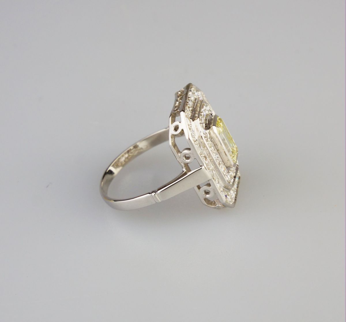 prsten z bílého zlata s diamanty, centrální diamant smaragdového brusu má hmotnost cca 0,86 ct, výjimečnou čistotu IF a barvu M-N, dále je 36 ks malých bezbarvých diamantů briliantového brusu o celkové hmotnosti cca 0,80 ct, 3,66 g Au 375 + 680/1000, Itálie, kolem r. 1995; atest Puncovního úřadu, znalecký posudek; rozměry 2,23 x 2,53 x 1,85 cm; velikost prstenu 54