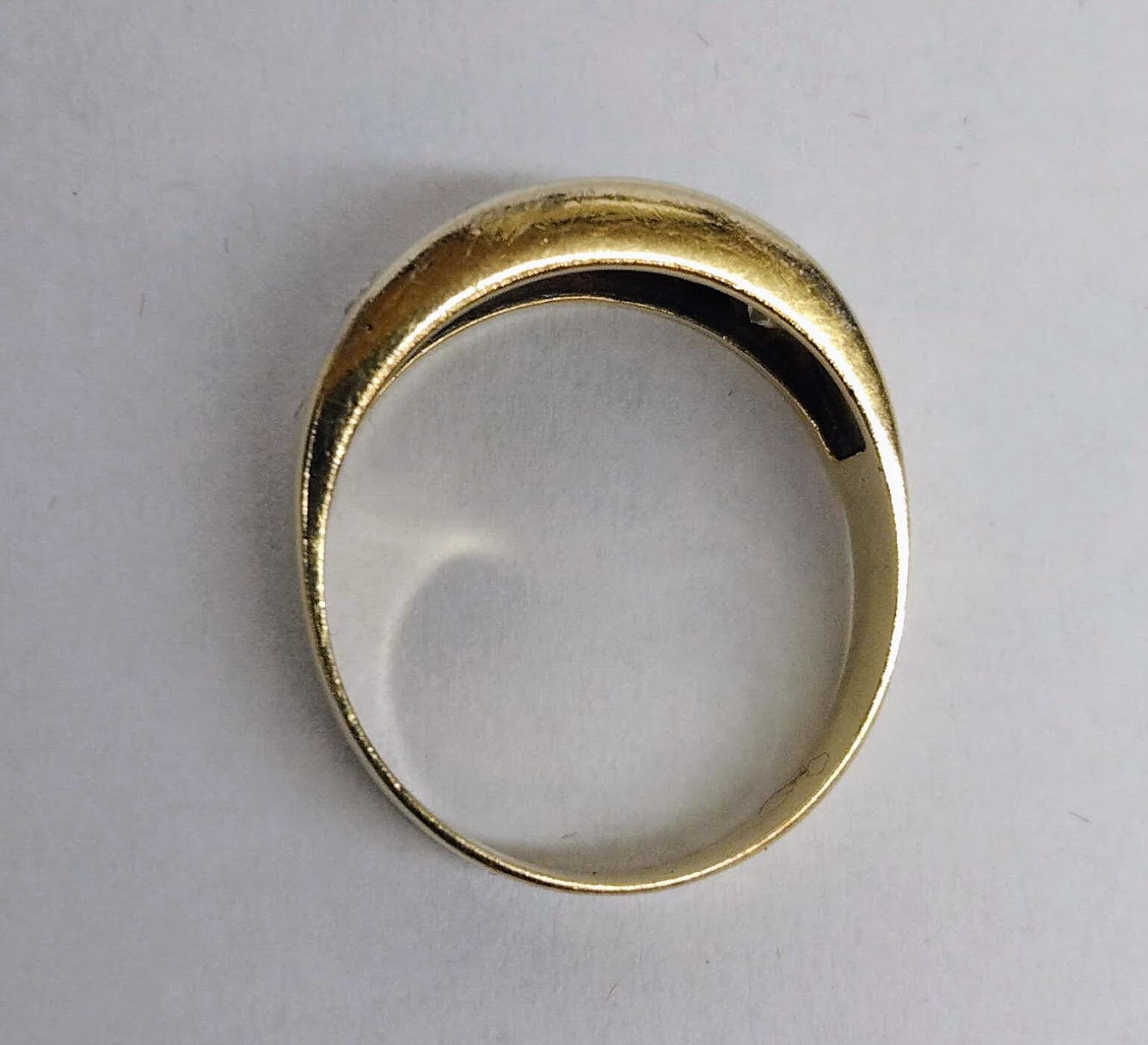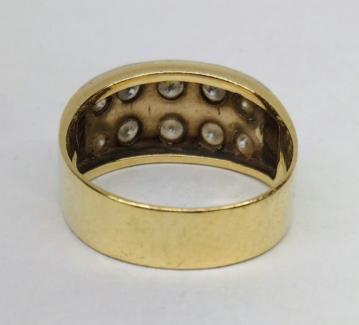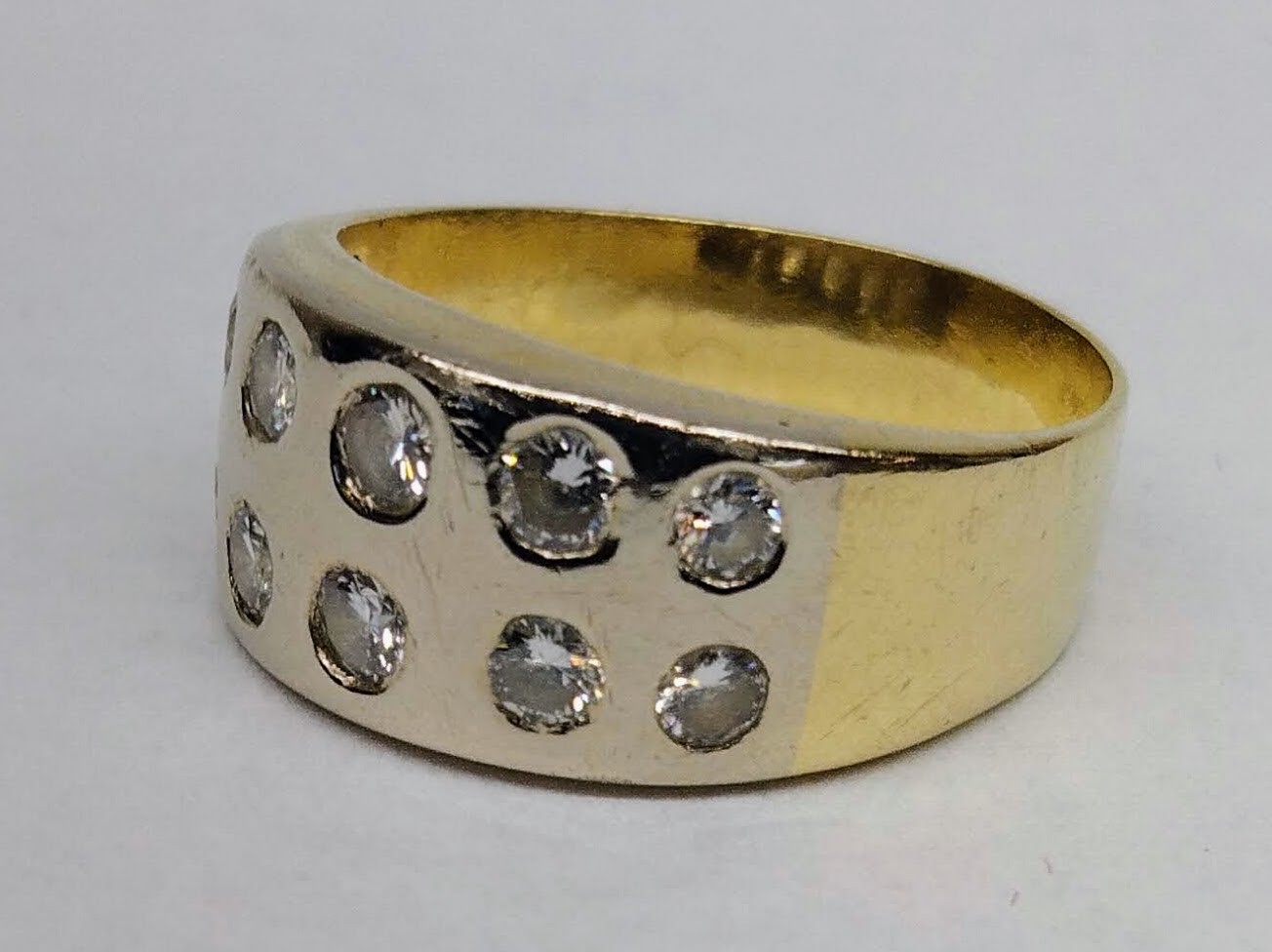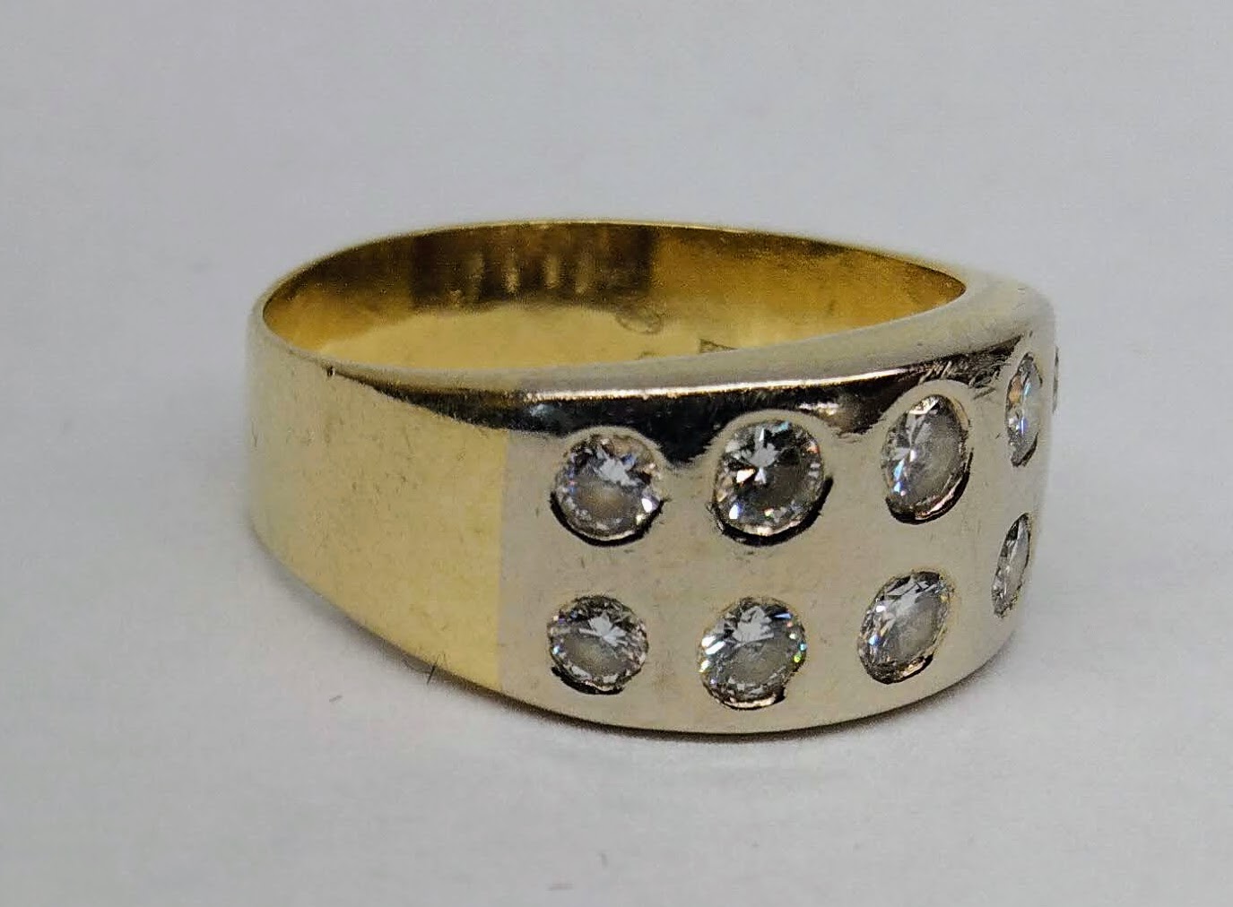 Zlatý drobnější dvoubarevný prsten s 10 diamanty briliantového brusu velmi dobré kvality o hmotnosti 0,435 ct. Celková hmotnost Au 3,39 g/585/1000, punc, odborný posudek, značka výrobce RH. Solidní zakázková zlatnická práce, Česko, začátek 21. století, velikost prstenu 50.
