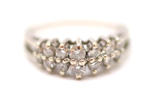 Zlatý prsten s diamanty. Bílé zlato 585/1000. Přírodní diamanty, kvalita SI1 – I1, barva H – J, celková váha 0,5 ct. Váha prstenu: 3,17 g.