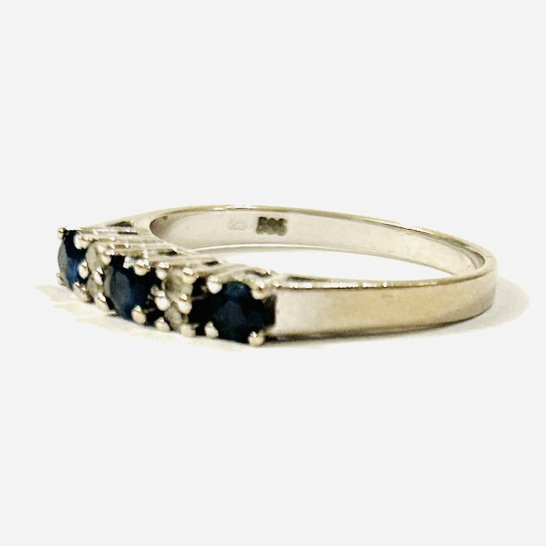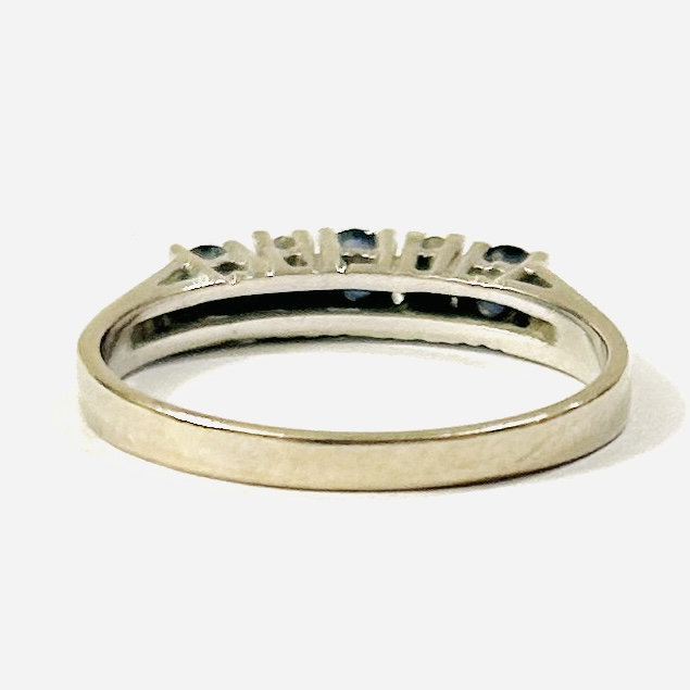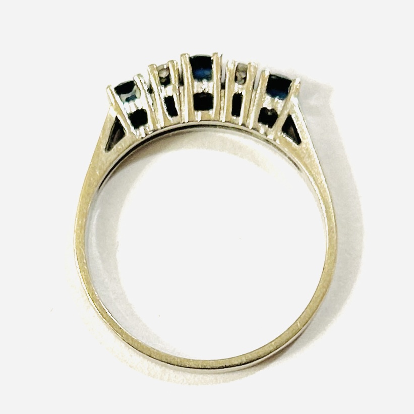 Decentní, úzký prsten s vyšší hlavicí, která je v krapnových korunách osazena 4 přírodními diamanty kulatého jednoduchého brusu (achtkant) o celkové hmotnosti 0,05 ct, dále též přírodními modrými safíry kulatého brusu. Kvalitní západoevropská zlatnická práce ze 70. let 20. století.