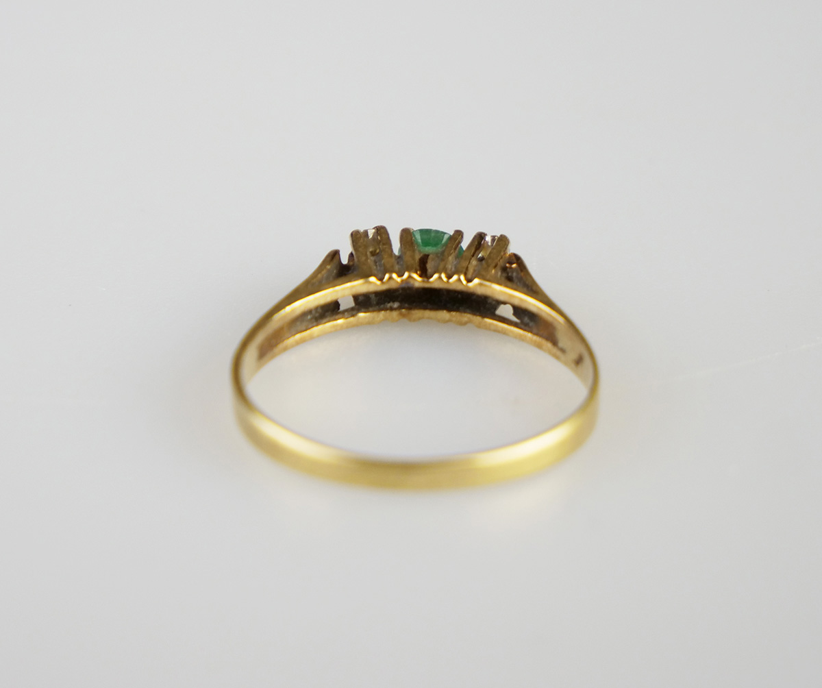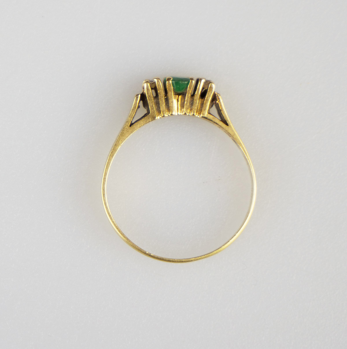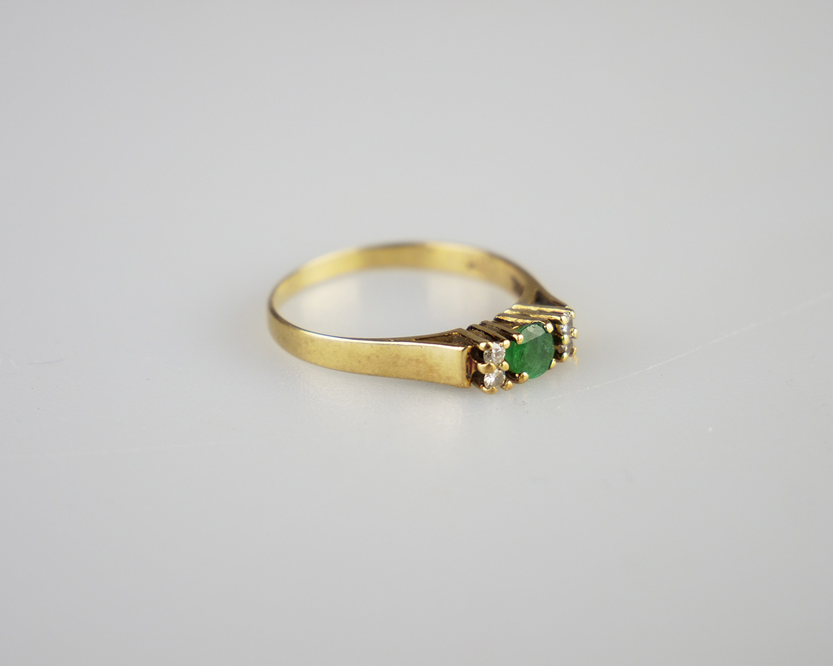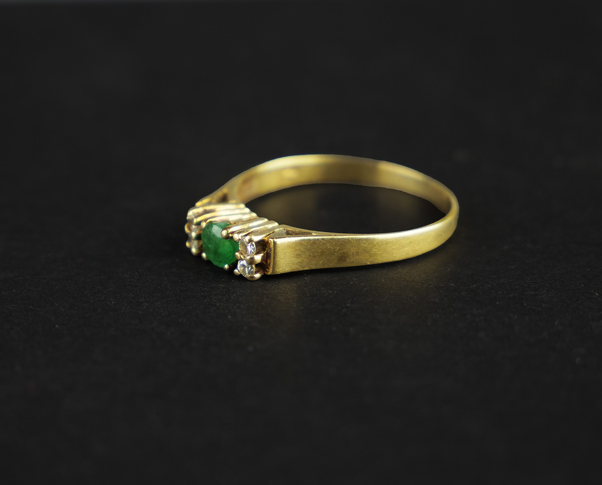 zlatý prsten s přírodními diamanty a smaragdem, 4 diamanty briliantového brusu o hmotnosti cca 0,04 ct, smaragd o hmotnosti cca 0,15 ct, Au 1,63 g/585/1000, Rakousko, 3. čtvrtina 20. sttoletí, platný punc, velikost prstenu 53, úprava velikosti možná