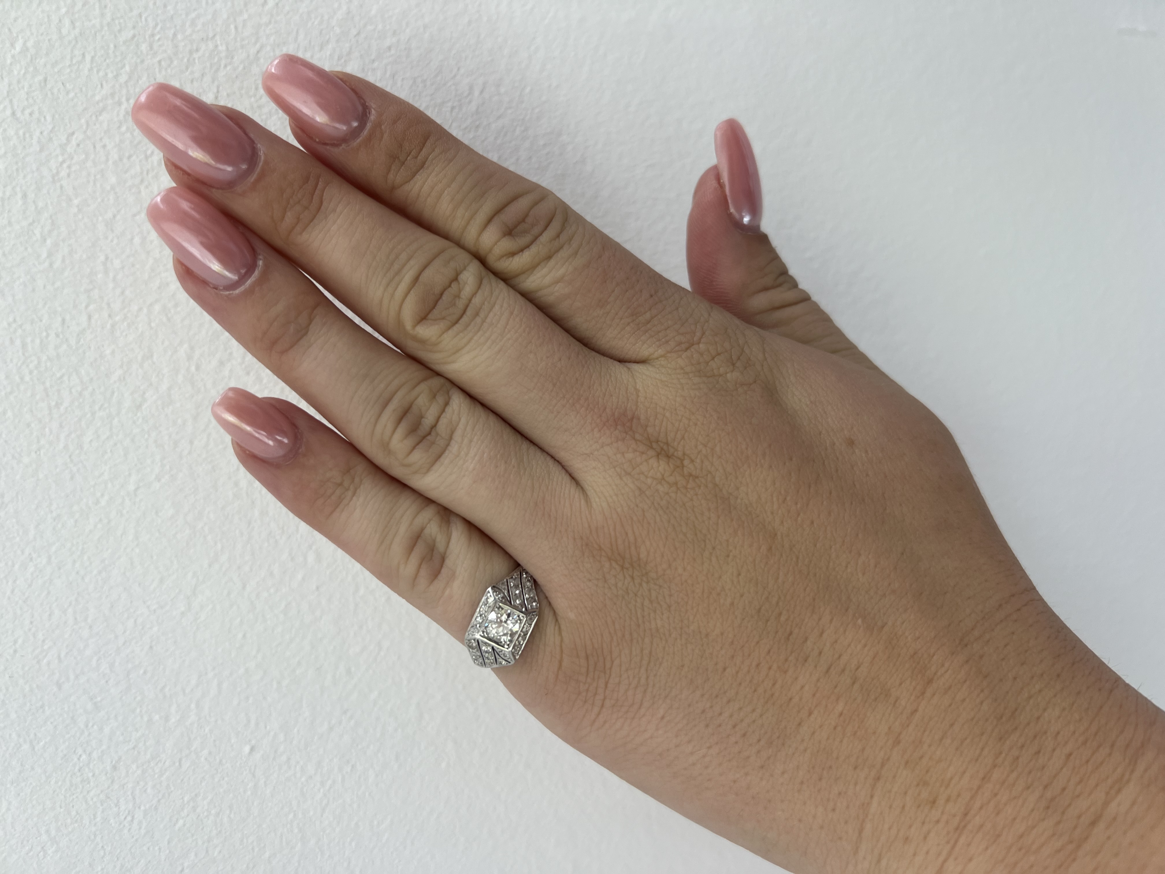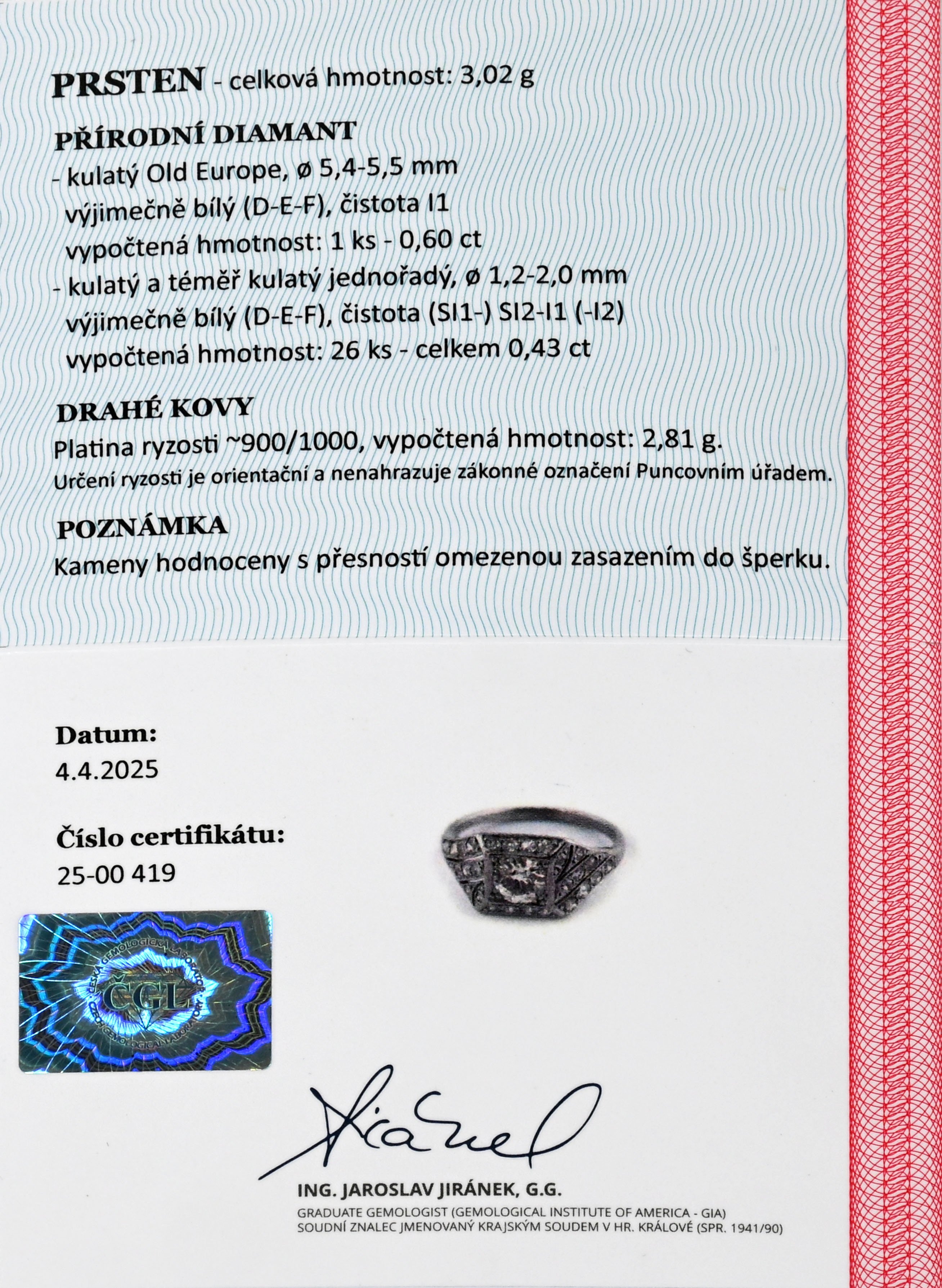 přírodní diamant 1 ks 0,60 ct, vzácně bílý (D-E-F), čistota I1, diamanty 26 ks 0,43 ct, vzácně bílý (D-E-F), čistota SI1-SI2-I1-I2 velikost 51-52