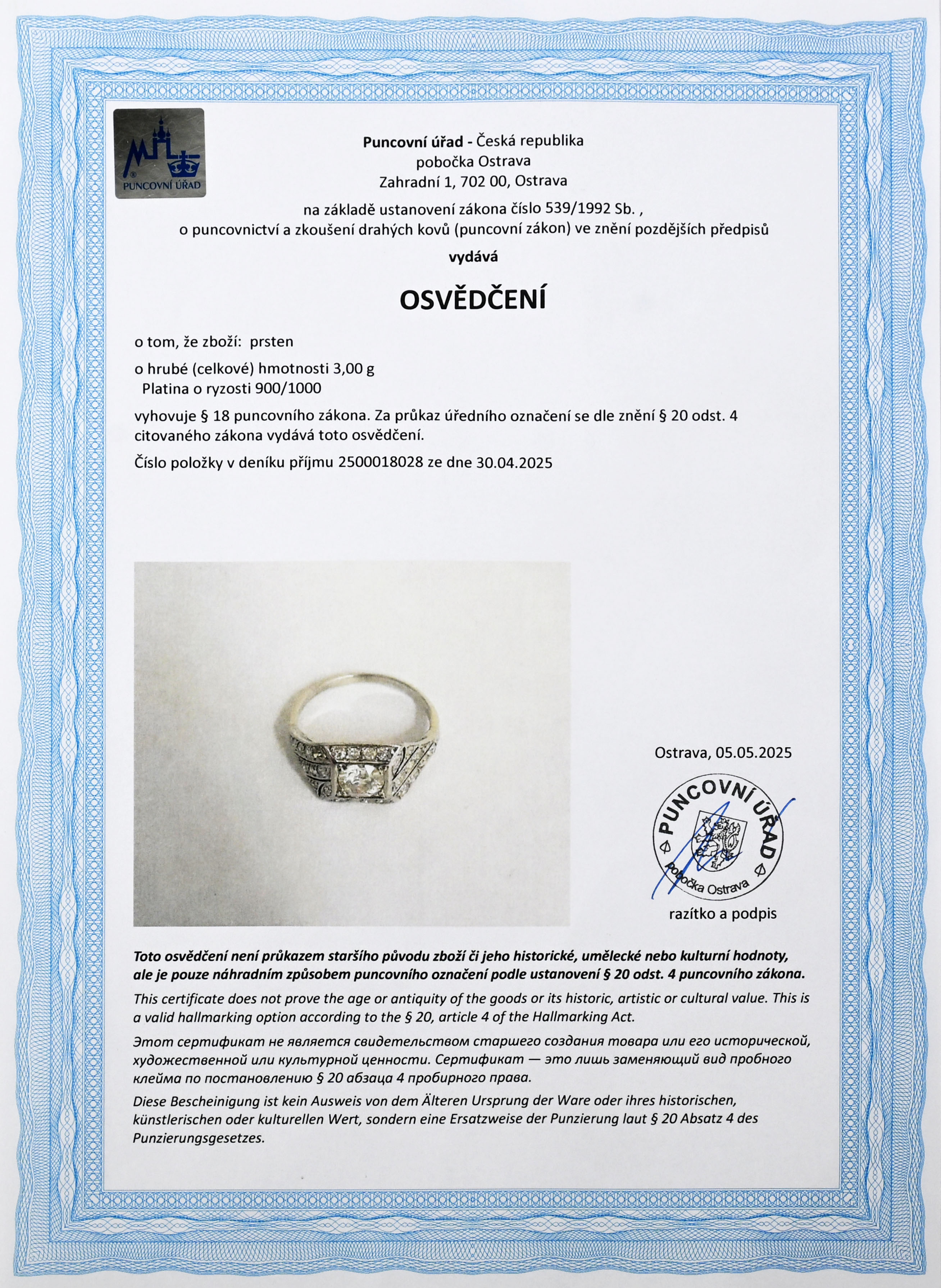osvědčení puncovního úřadu