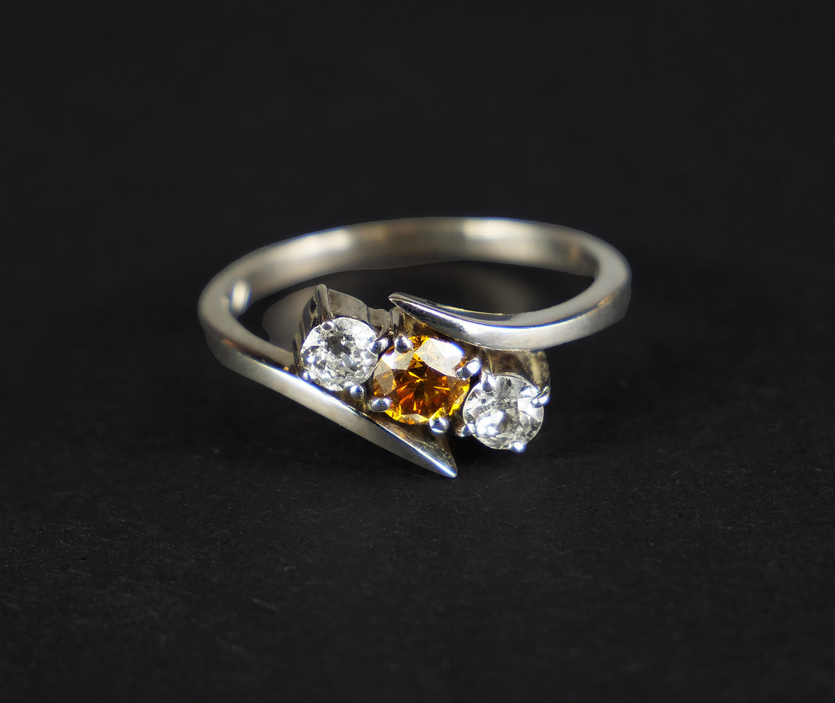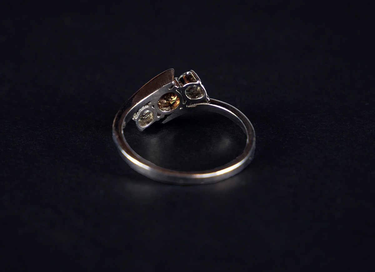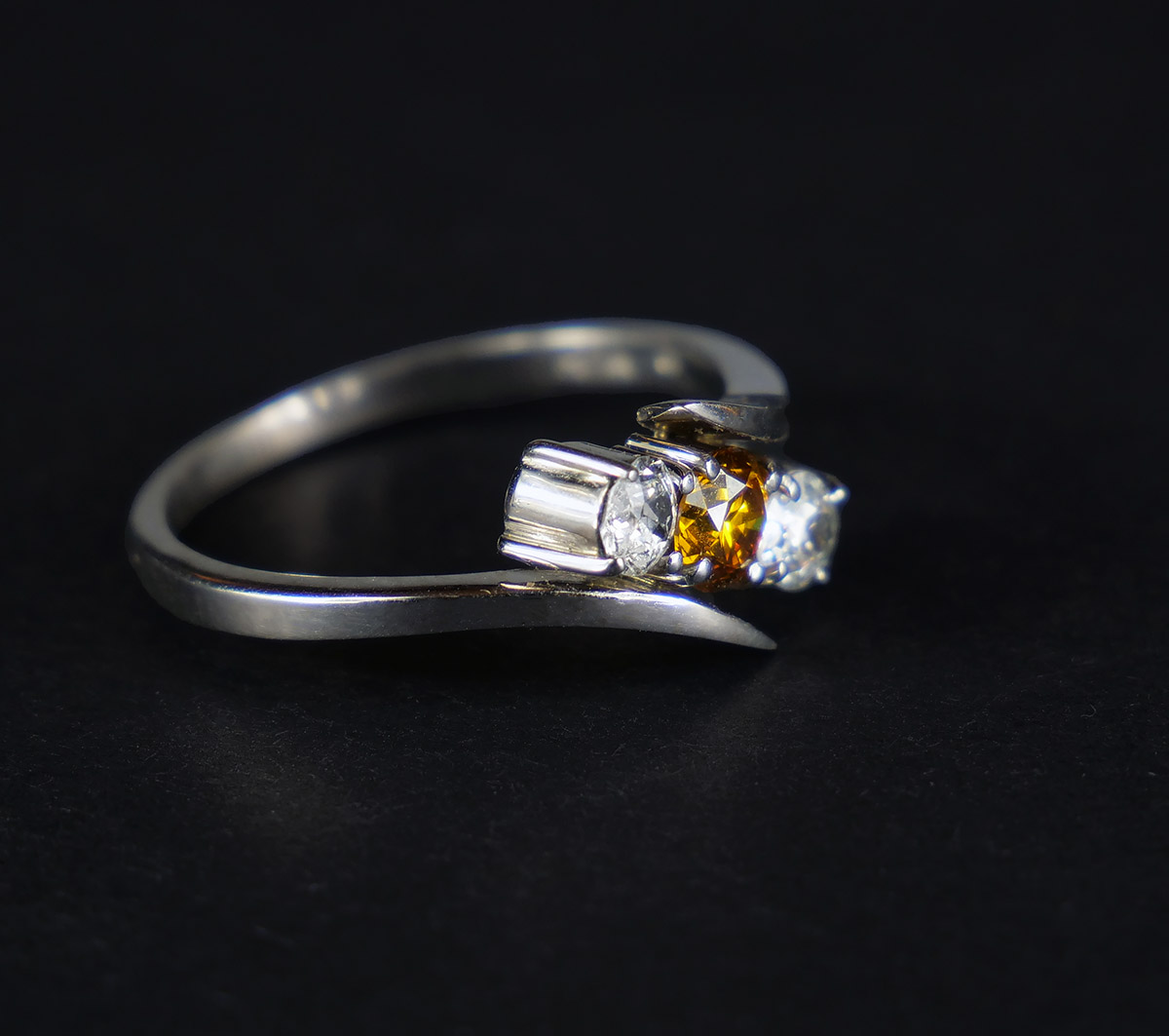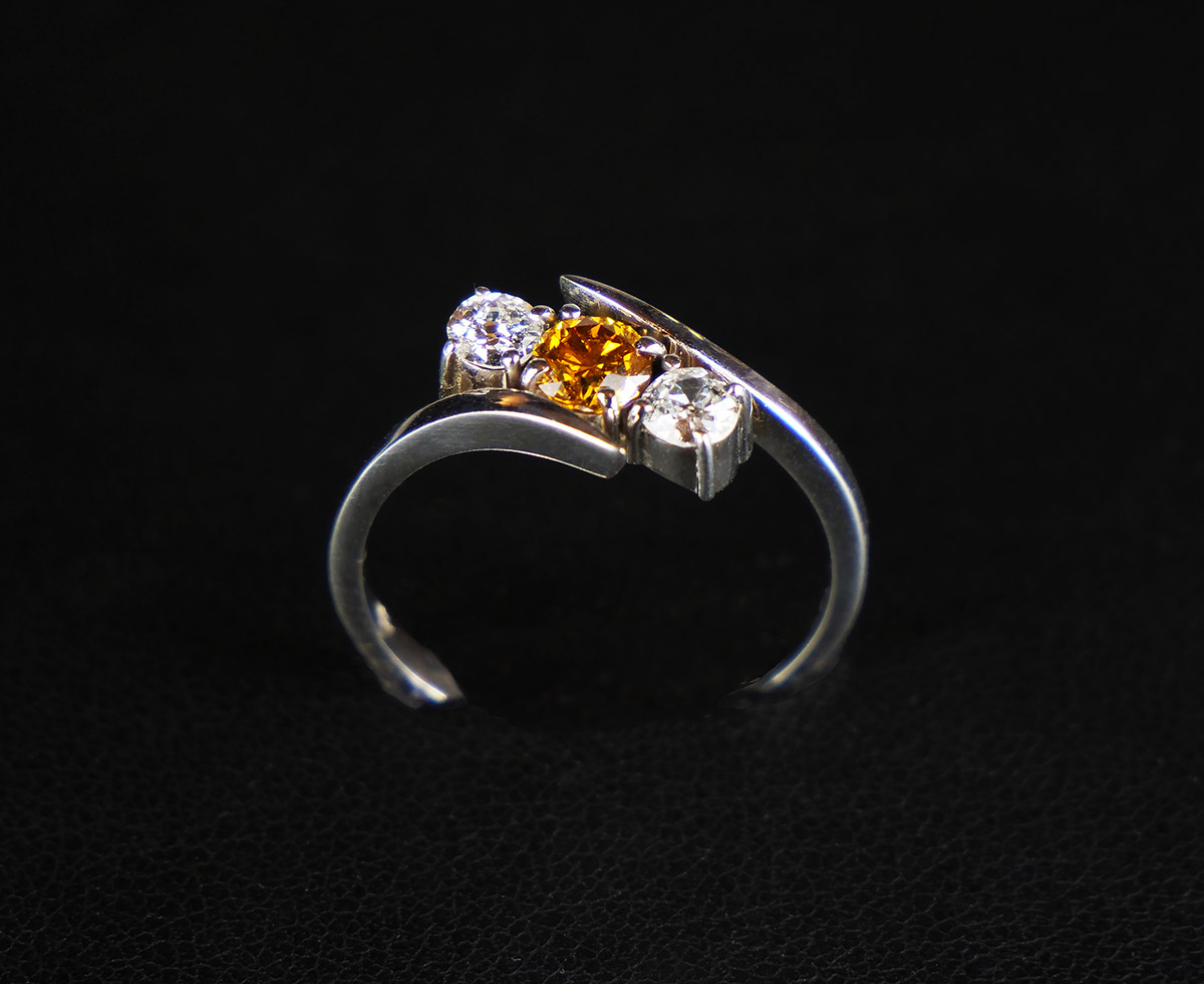 Jedinečný zlatý zakázkový prsten se vzácným fancy diamantem; diamant v barvě Natural Fancy Vivid Yellowish Orange briliantového brusu o hmotnosti 0,42 ct, průměr 4,62 mm, čistota Si, brus VG, dále 2 diamanty briliantového brusu 0,18 ct a 0,20 ct, kvalita Si, barva H, celkem 0,80 ct. Celková hmotnost Au 2,90 g/585/1000, punc, certifikát na fancy diamant. Nový nenošený šperk, Česko, 2024. Rozměry hlavy prstenu 1,2 x 0,8 cm, velikost prstenu 57.