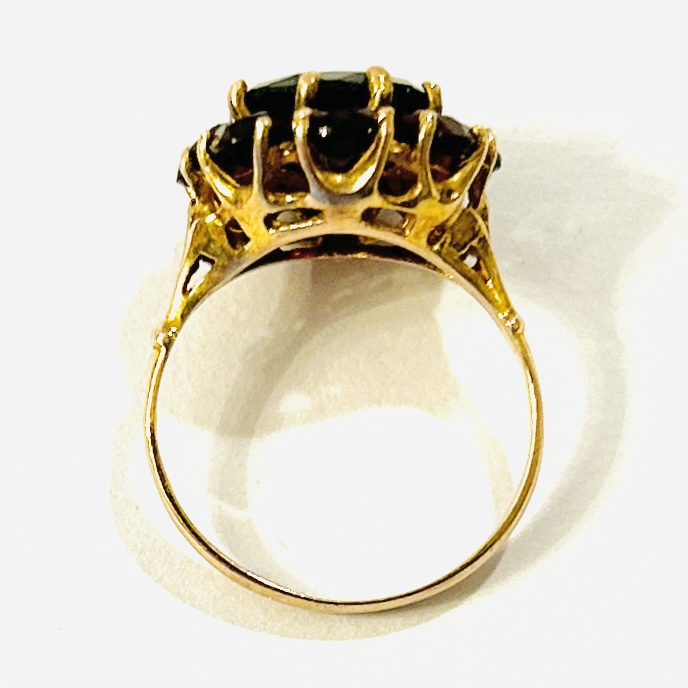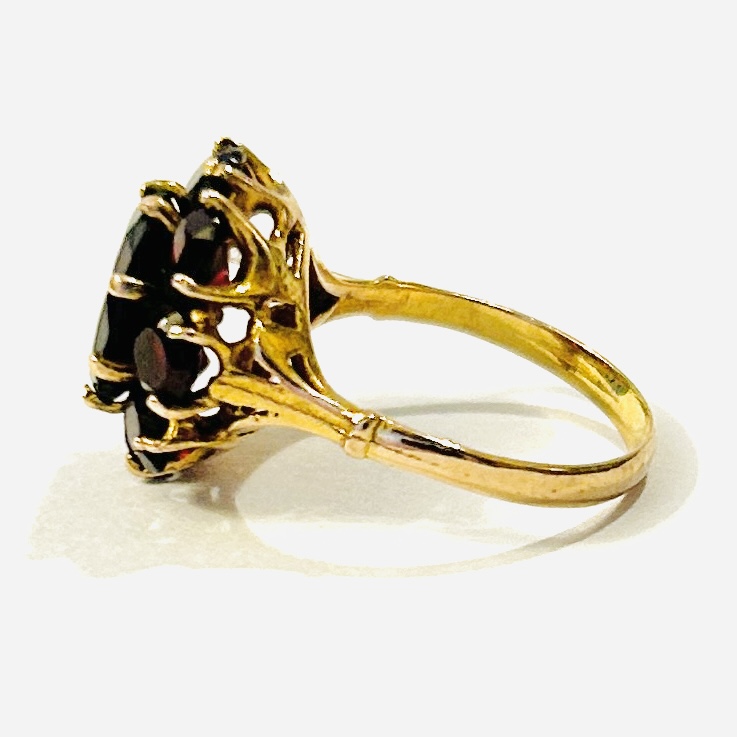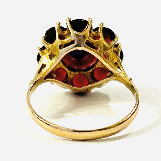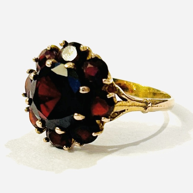 Honosný prsten s bohatě stavěnou hlavicí ve tvaru kulatého květu, která je osazena centrálním přírodním almandinem rámovaným 8 přírodními granáty kulatého brusu. Kvalitní německá zlatnická práce z poslední třetiny 20. století.