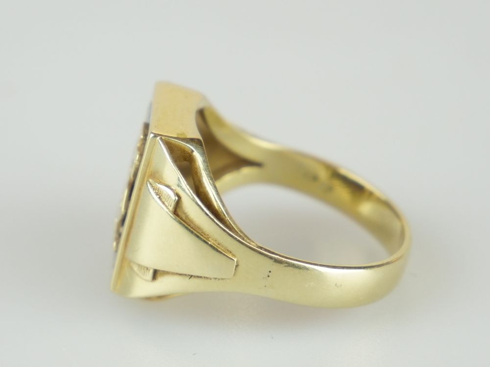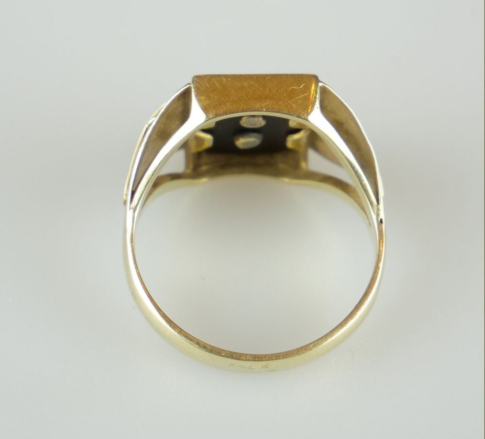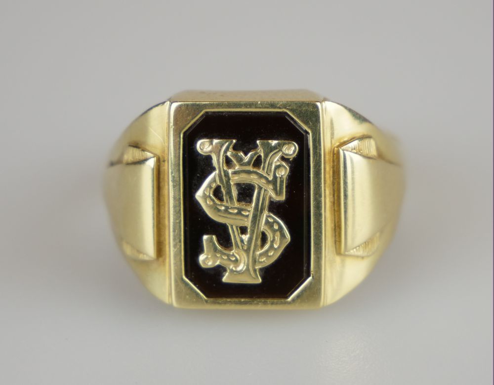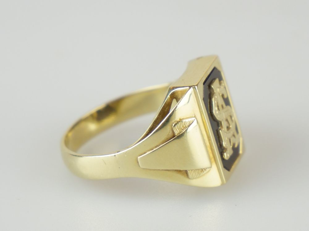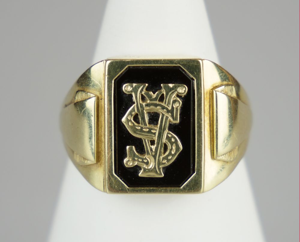 zlatý pánský prsten s karneolem a monogramem VŠ, Au 8,45 g/585/1000, Česká republika, kolem r. 1995, dobová puncovní značka, rozměr hlavy 2,1 x 1,6 cm; velikost prstenu 64