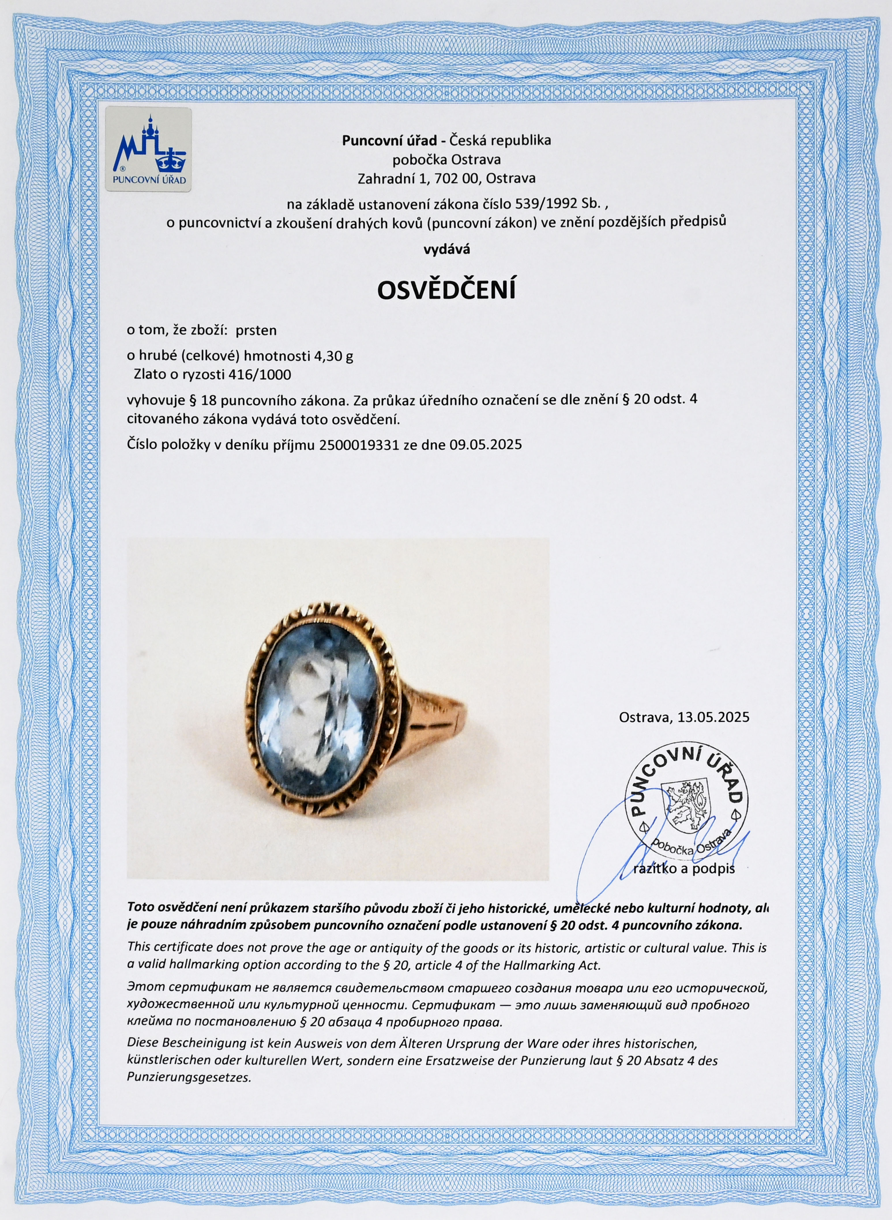 osvědčení puncovního úřadu