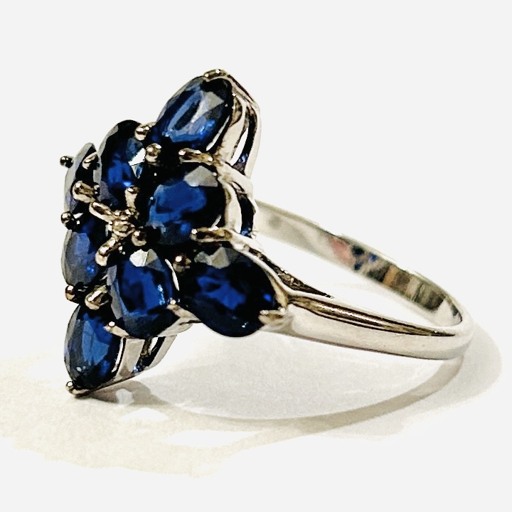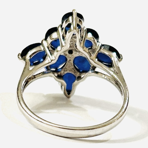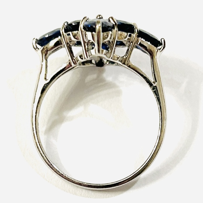 Zhotoveno z bílého 9 karátového zlata, tj. o ryzosti 375/1000; britské puncovní značení, ryzostní číslo a mistrovská značka „R&C“ zevnitř šíny. Hmotnost 3,50 g, velikost 55, délka a šířka hlavice 19 mm. Ve velmi zachovalém stavu, odborně vyčištěno a vyleštěno zlatníkem. Součástí odborný posudek (zabývající se pouze modrými safíry).