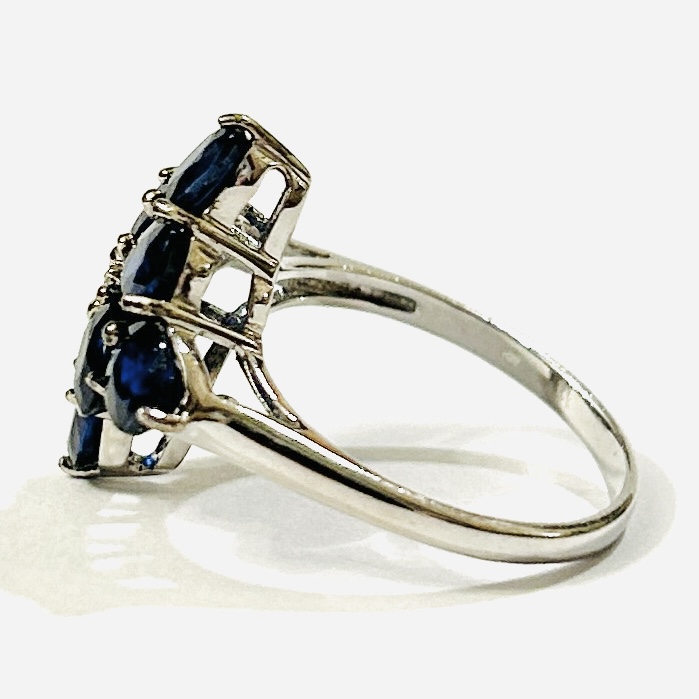 Moderní prsten s hlavicí stavěnou na ose řeckého kříže, osazeno přírodními modrými safíry oválného briliantového brusu o celkové váze 3,60 ct (0,045 ct – 8 ks), kvalita velmi dobrá, ve středu doplněno přírodním diamantem kulatého jednoduchého brusu (achtkant) o váze 0,005 ct. Pečlivě fasováno krapnami na hlavici s průsvitkami. Kvalitní birminghamská zlatnická práce z první pětiny 21. století.