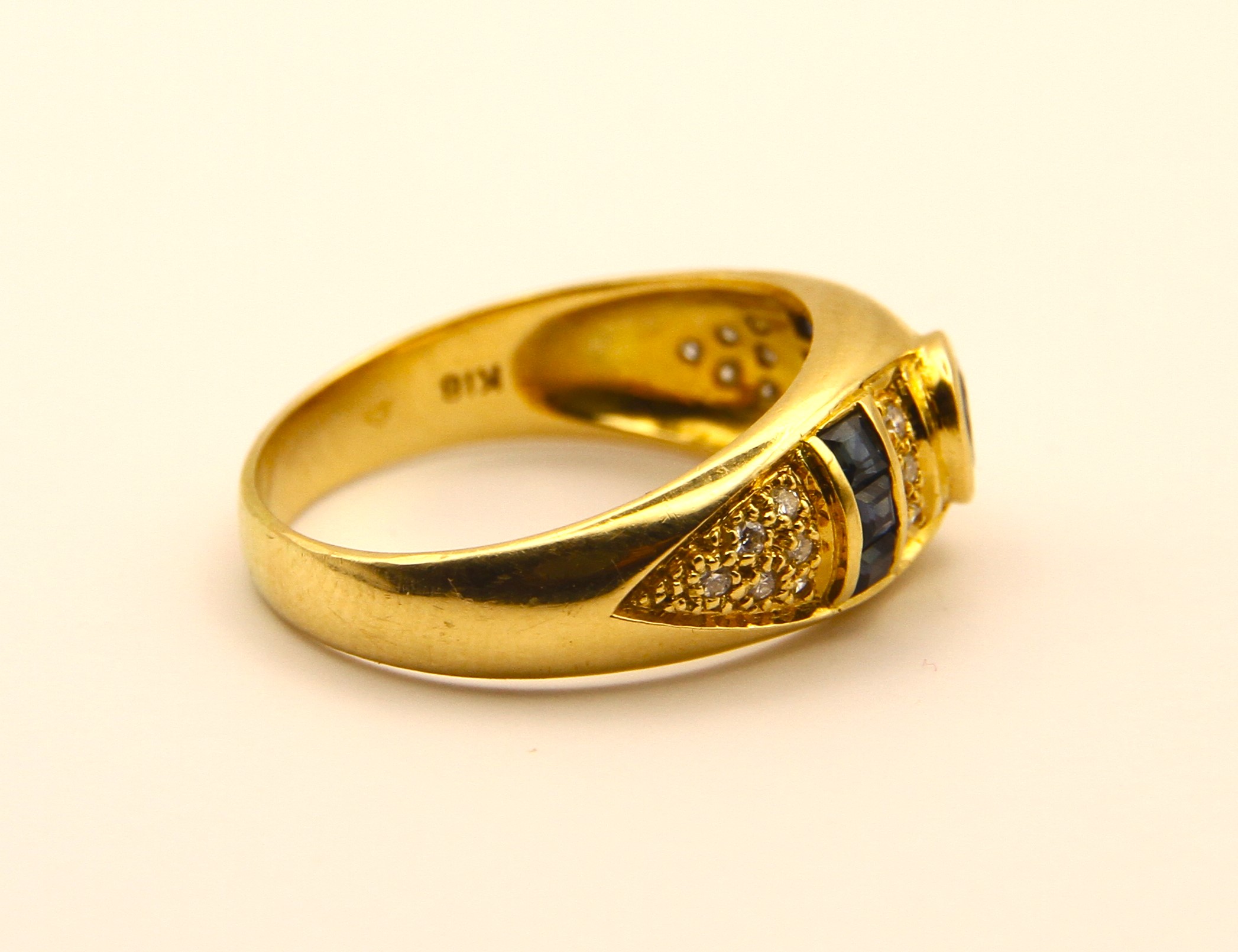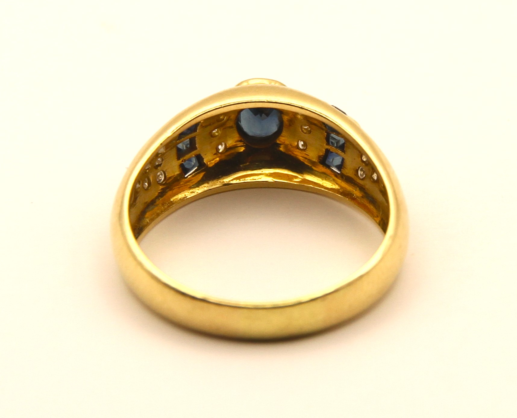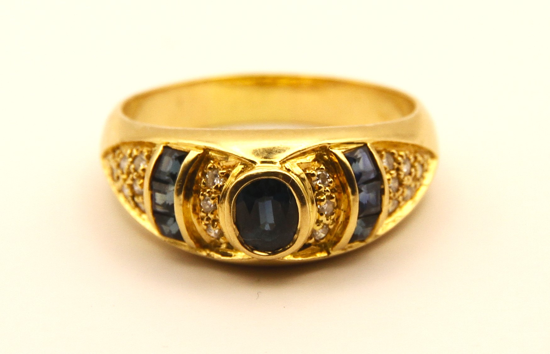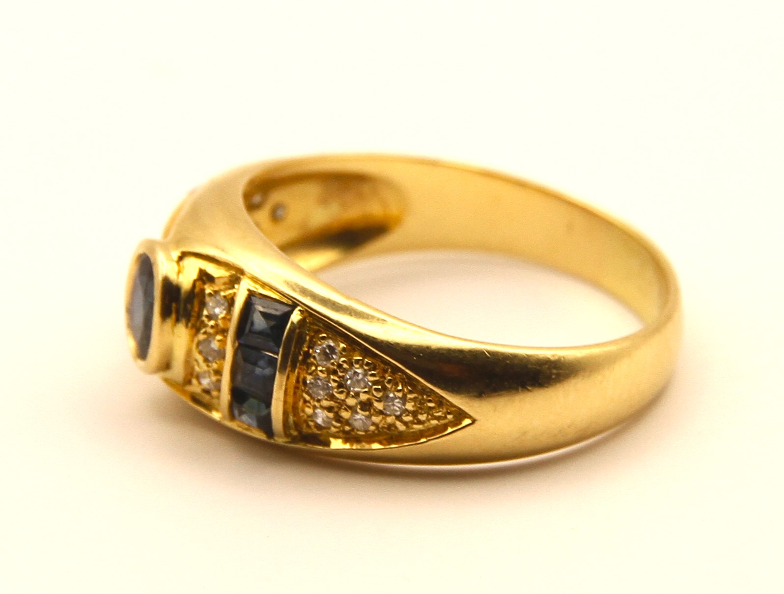 Prsten z 18 karátového žlutého zlata s přírodními modrými safíry a diamanty v briliantovém brusu o celkové hmotnosti cca 0,25ct, Au btto 5,80g/750/1000, punc Z-35 (kohout) platný od roku 1920 dodnes