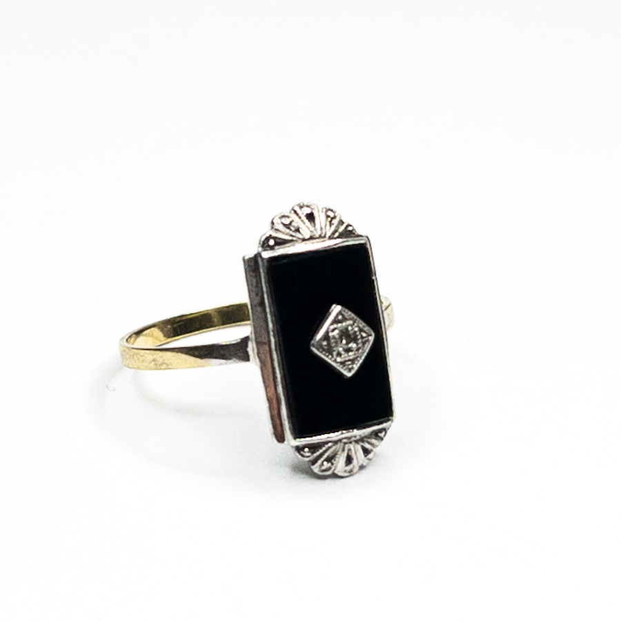 Starožitný zlatý prsten s onyxem a přírodním diamantem starého briliantového brusu 0,02,