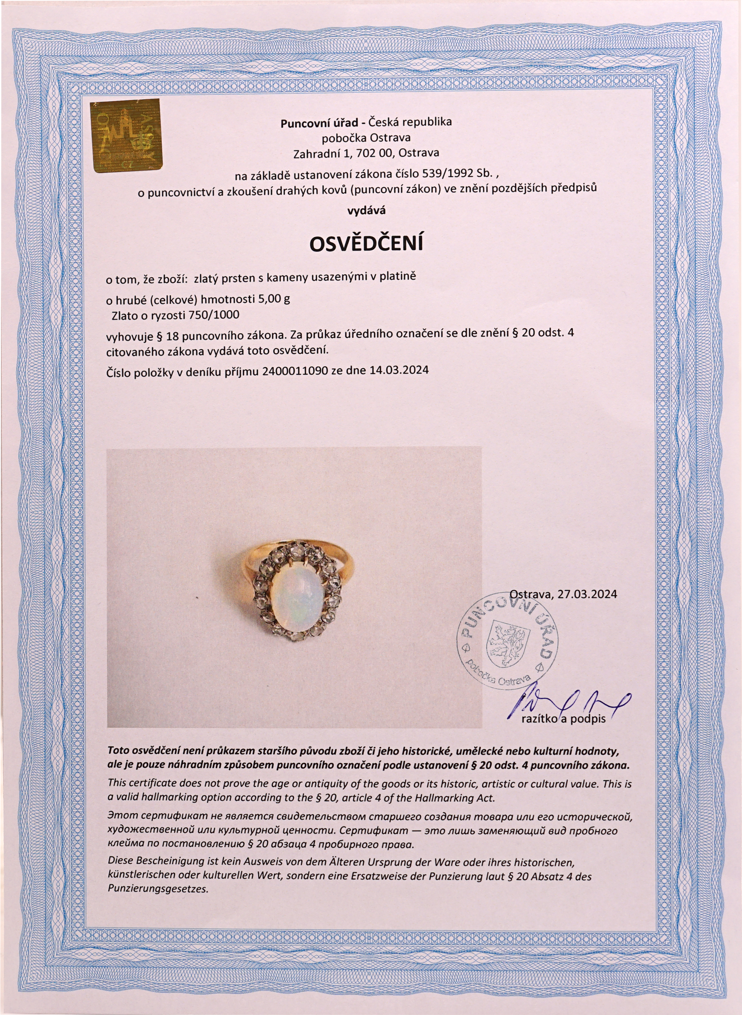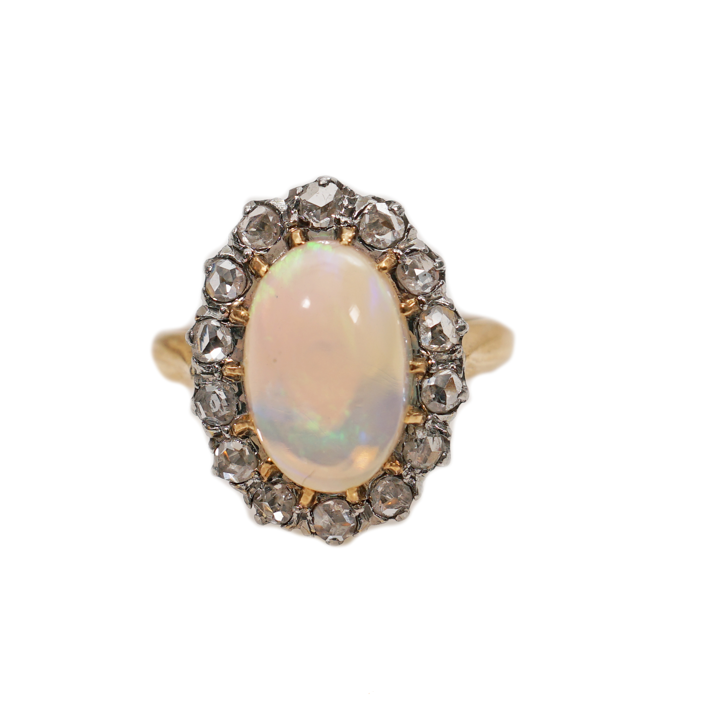 18 karátové zlato. Osazeno brilianty a opálem. Kolem roku 1900. Váha 5,00 g / 750. Velikost prstenu č. 50