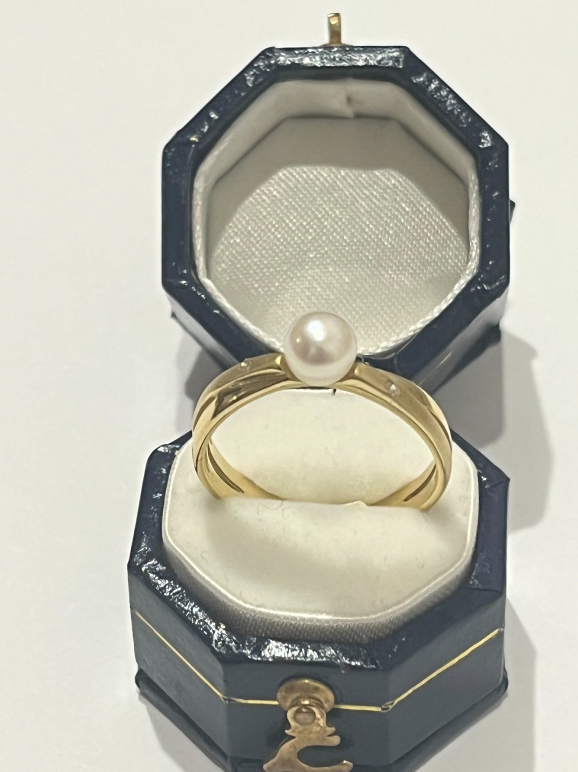 Zlatý prsten ze 14 karátového žlutého zlata AU 585/1000 od českého výrobce ALO z kolekce s říčními perličkami. Vyroben kolem roku cca 1999, v provedení lesk – mat. V prstýnku je osazena jedna říční perla pravidelného kulatého tvaru a v boku jsou dva malé bílé kamínky, prsten pravděpodobně nenošen, protože prstýnek nemá poškozené pískované matování + perlička také perfektní stav. Váha prstýnku 2,25 gramů, velikost číslo 55. Označení výrobce ALO přímo na prstýnku vedle puncovní značky.