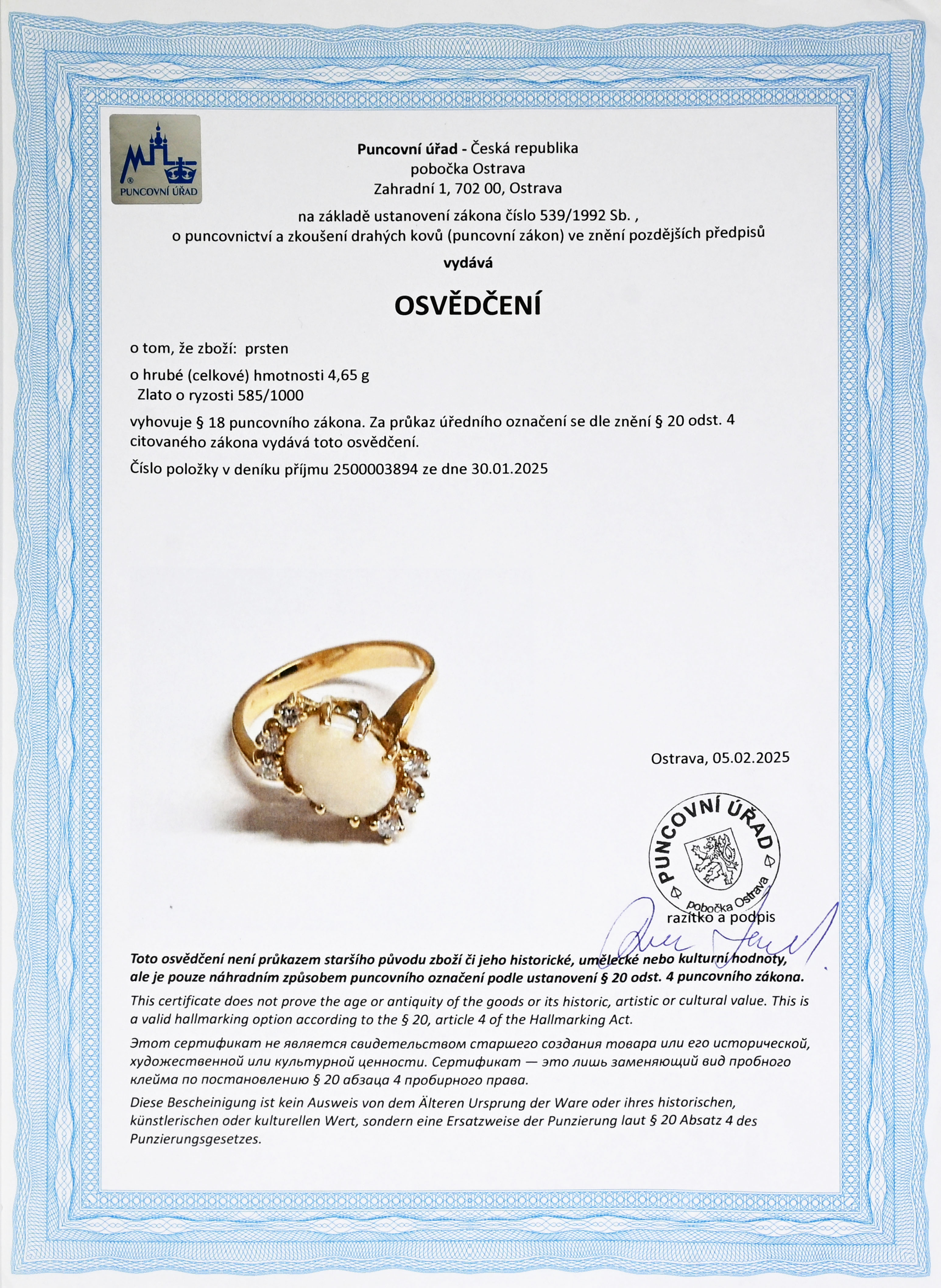 • osvědčení Puncovního úřadu České republiky