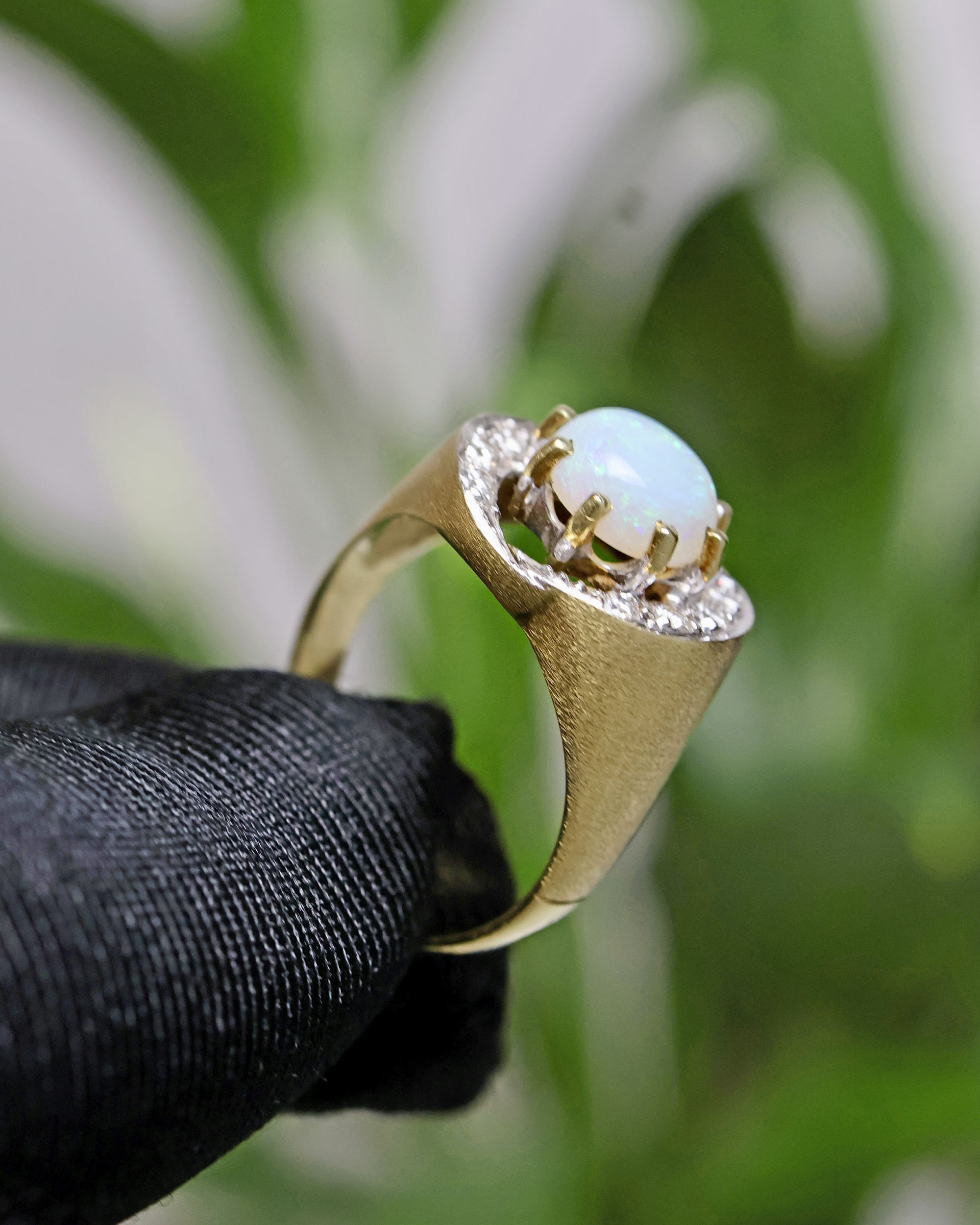 Prsten ve zlatě s opálem osazený brilianty z 80.let 20.století.