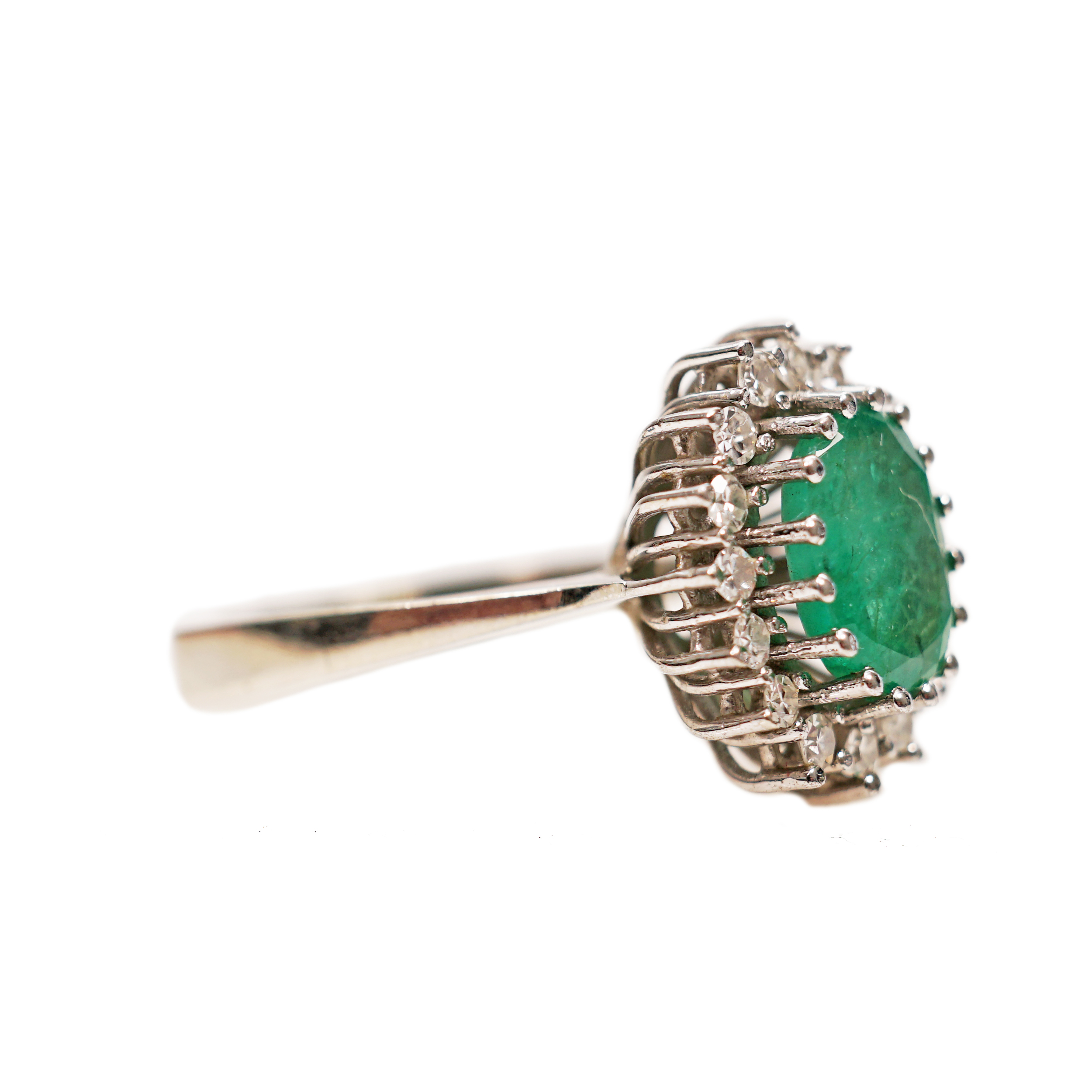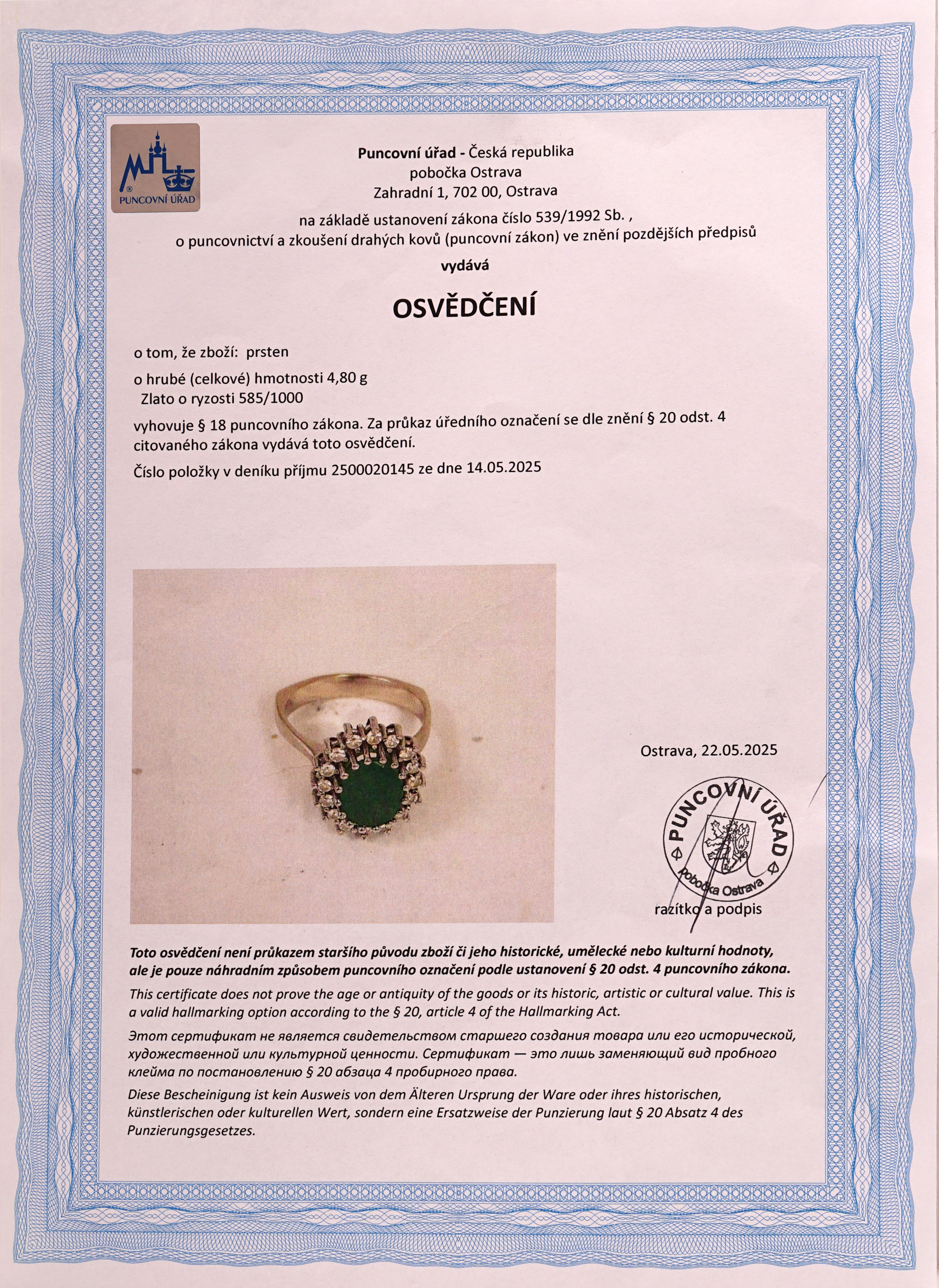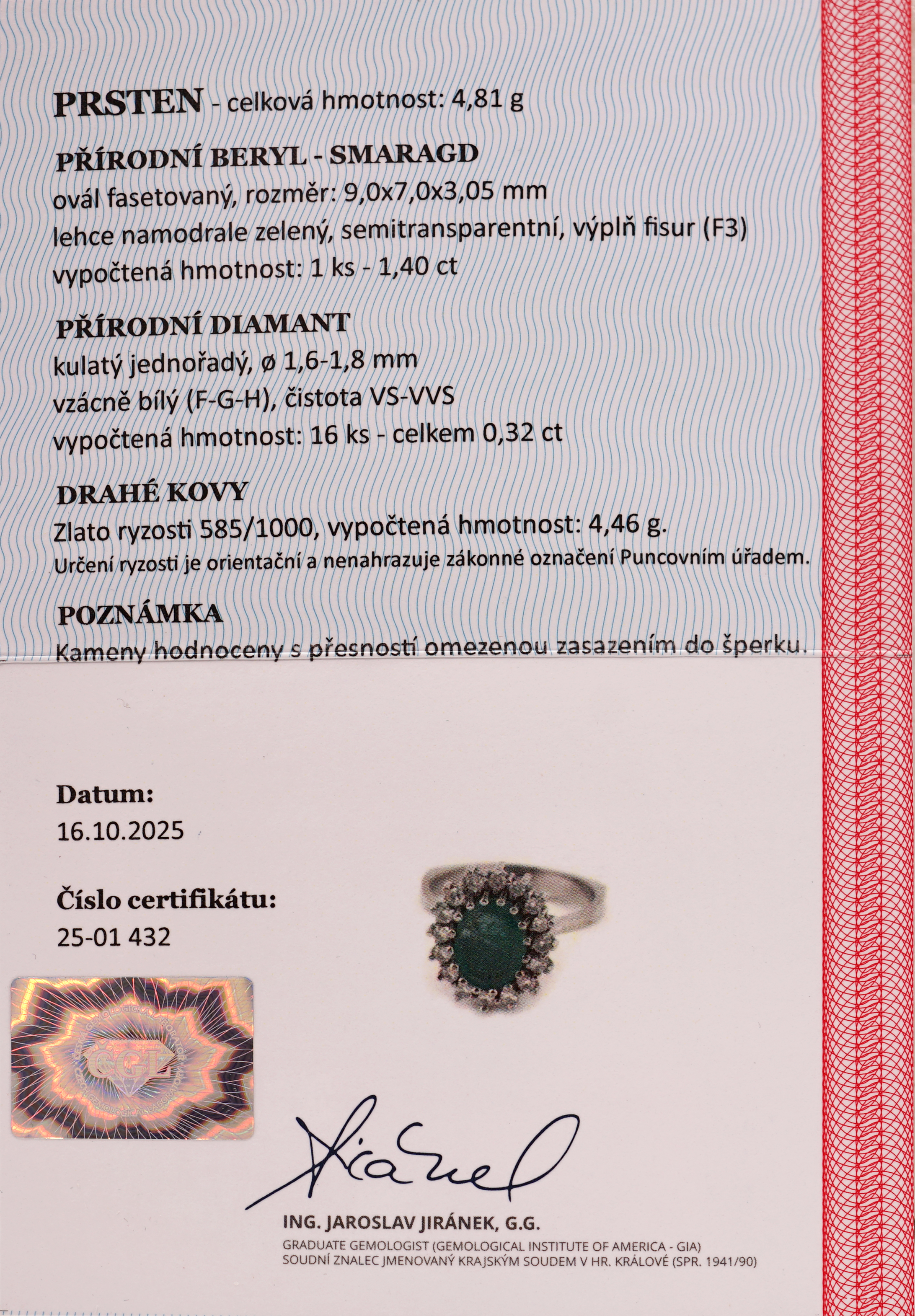 Zlatý prsten, osazený přírodním smaragdem o velikosti 1,40 ct a 16 ks briliantů v celkovém součtu 0,32 ct. Váha 4,80 g / 585.