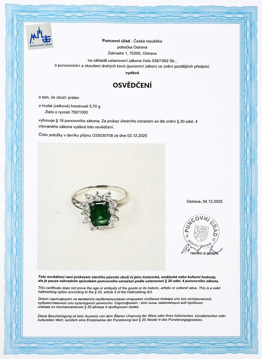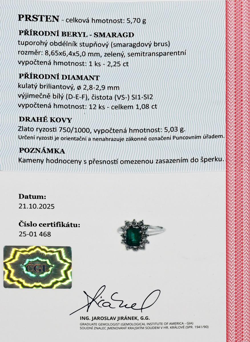 – 1 ks přírodní smaragd, celkem 2,25 ct, tuporohý obdélník stupňový, zelený, semitransparentní, rozměr 8,65×6,4×5,0 mm