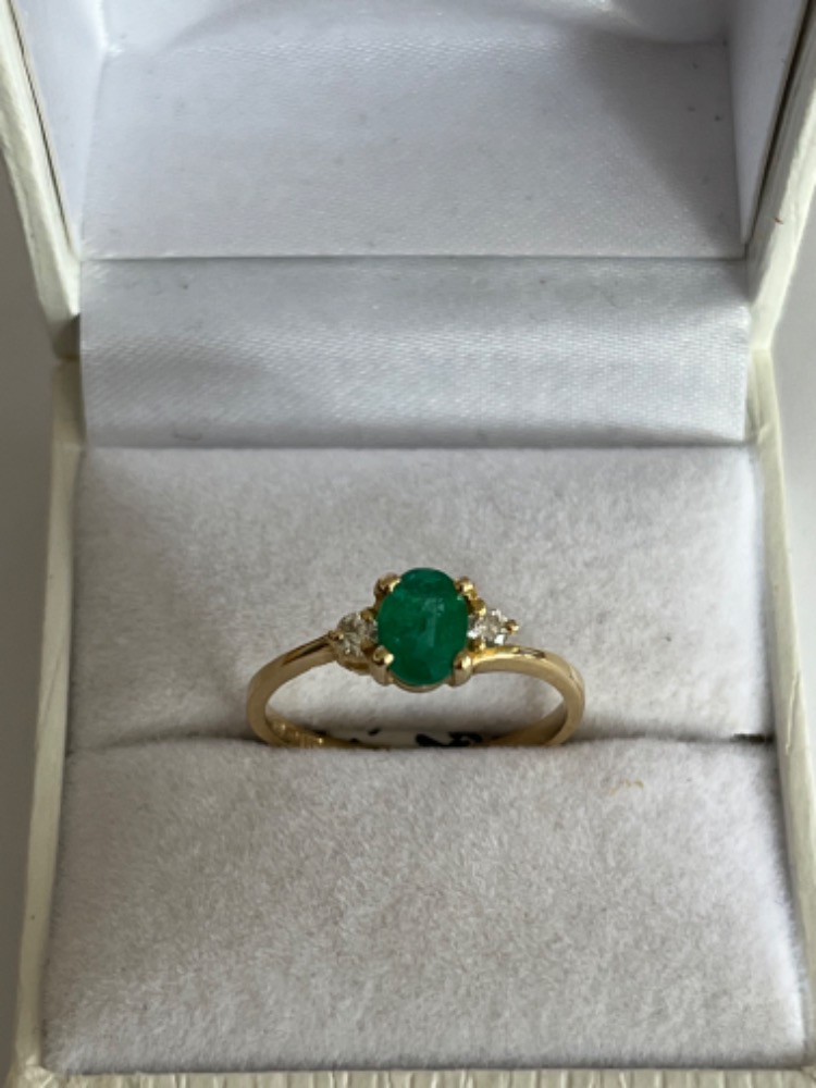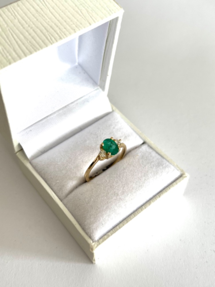 Velmi hezký zlatý prsten ze 14 karátového žlutého zlata s přírodním smaragdem oválného brusu o váze kamene cca 0,64 carátů zasazeného v krapnách a doplněného dvěma kusy přírodních diamantů briliantového brusu cca po 0,04 car, Au 585/1000 váha šperku brutto 2,34 gramů. Velikost prstýnku 54,5. Hezký šperk v perfektním stavu.